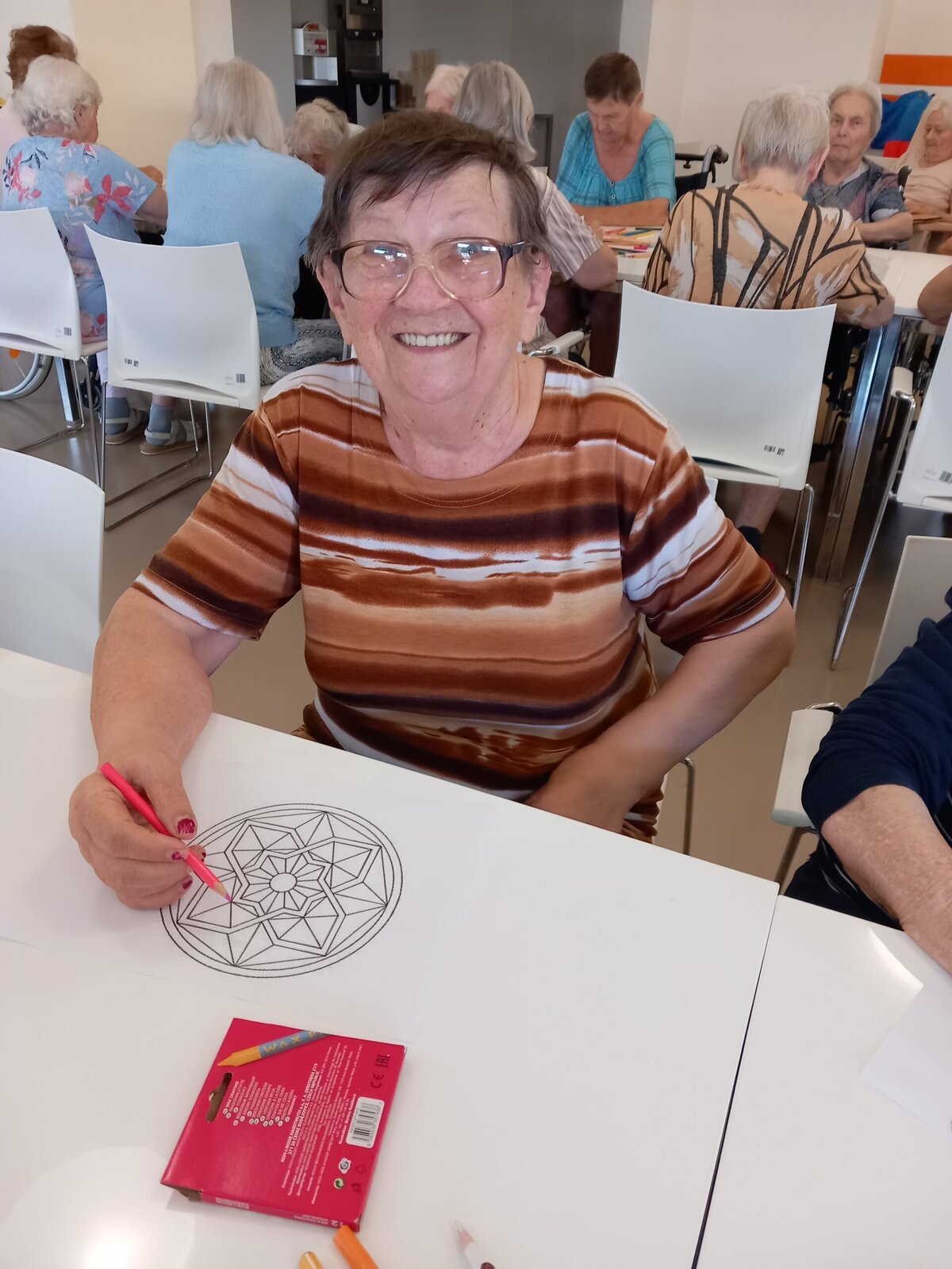 Vybarvování mandaly s klienty je relaxační a terapeutická činnost, která podporuje soustředění, klid a kreativitu. Společné tvoření může navodit atmosféru důvěry a otevřeného sdílení pocitů. Barvy a tvary v mandale umožňují vyjádřit emoce, čímž přispívají k lepšímu sebepoznání. Aktivita rozvíjí jemnou motoriku, pomáhá při snižování stresu a podporuje osobní růst klientů.