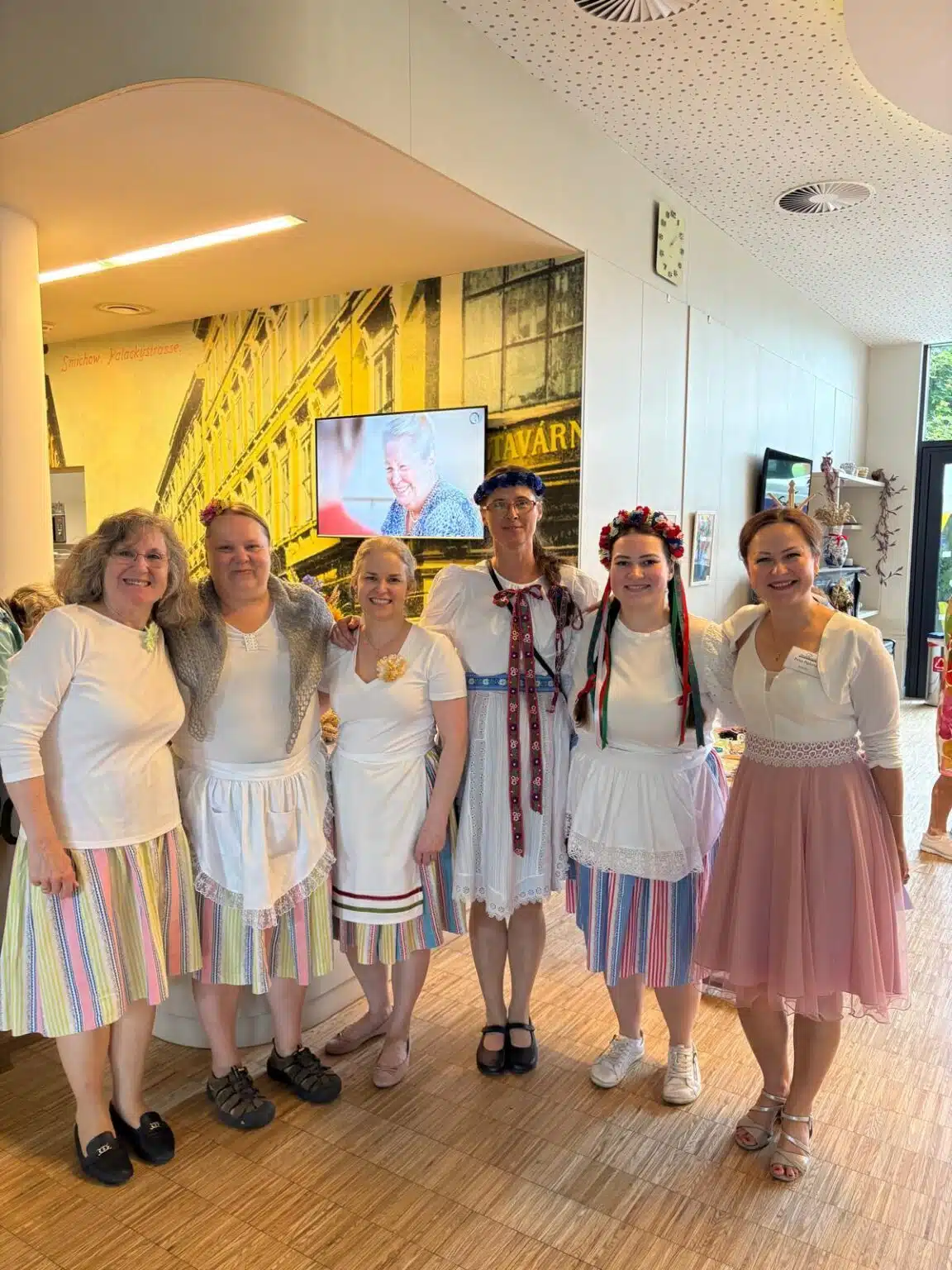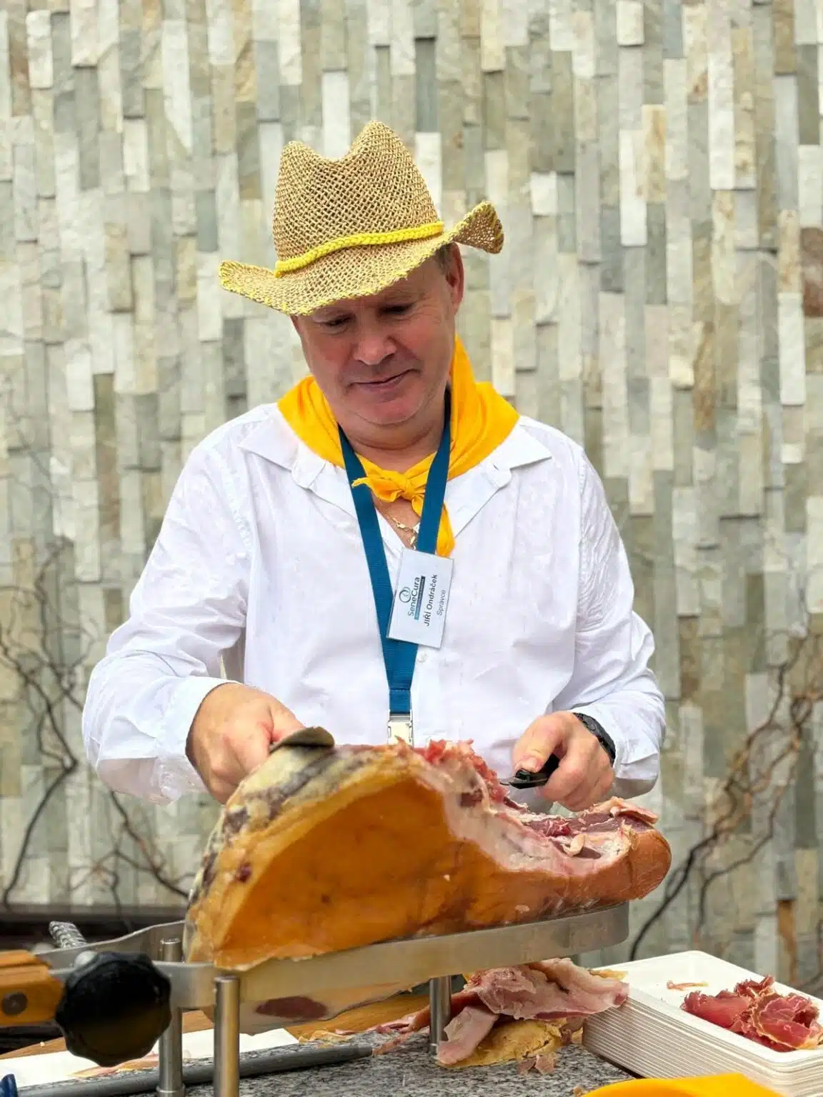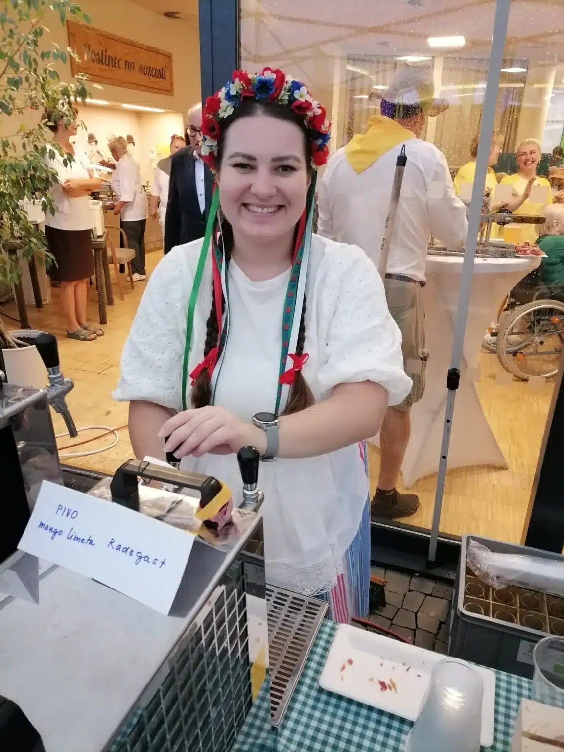 Pan Karel Kekeši s akordeonem v ruce zahrál a zazpíval na úvod. Než se paní ředitelka postavila k mikrofonu, aby přivítala všechny hosty, klienty i zaměstnance, převzali pomyslnou štafetu právě zaměstnanci a zazpívali dvě nacvičené lidovky. Ještě šéfkuchař objasnil nabízené menu, sestavené tak, aby demonstrovalo téma letošní slavnosti. V nabídce byly různé druhy mas i jitrnic, koláčů i kremrolí, dalších salátů a dobrot. K pití bylo podáváno zlatavé pivo i víno, kofola i káva. Zvláště děti, ale také nejeden klient, si přišel na své u pultu se zmrzlinou.