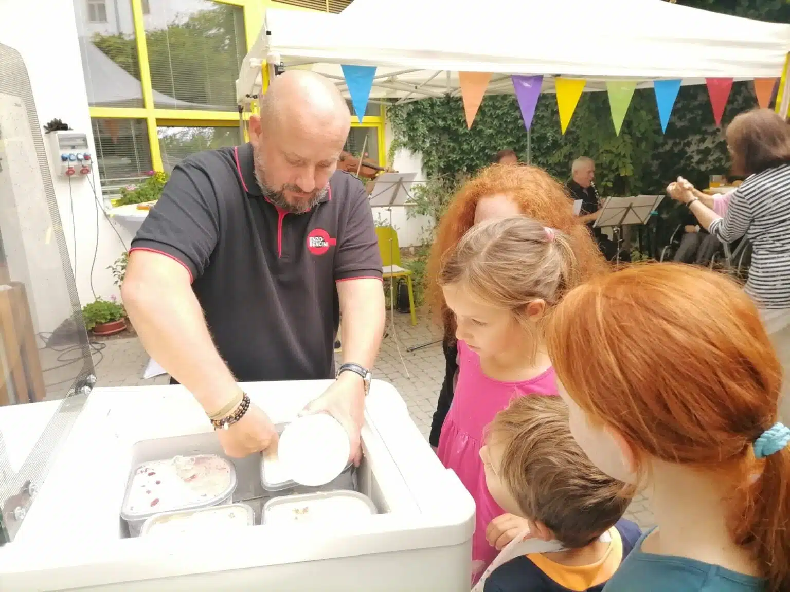 Ve foyer byl „stánek“ s keramickými korálky a nechyběl ani tradiční fotokoutek. K dobré pohodě hrála a zpívala část Pražského salónního orchestru pod vedením kapelníka pana Václava Vomáčky. Všeobecné veselí a pohodu nemohl narušit ani příchozí vydatný déšť. Pouze se všichni přesunuli do foyer a zábava pokračovala, došlo dokonce na tanec! Zahradní slavnost se nadmíru vydařila, opět je nač vzpomínat.
