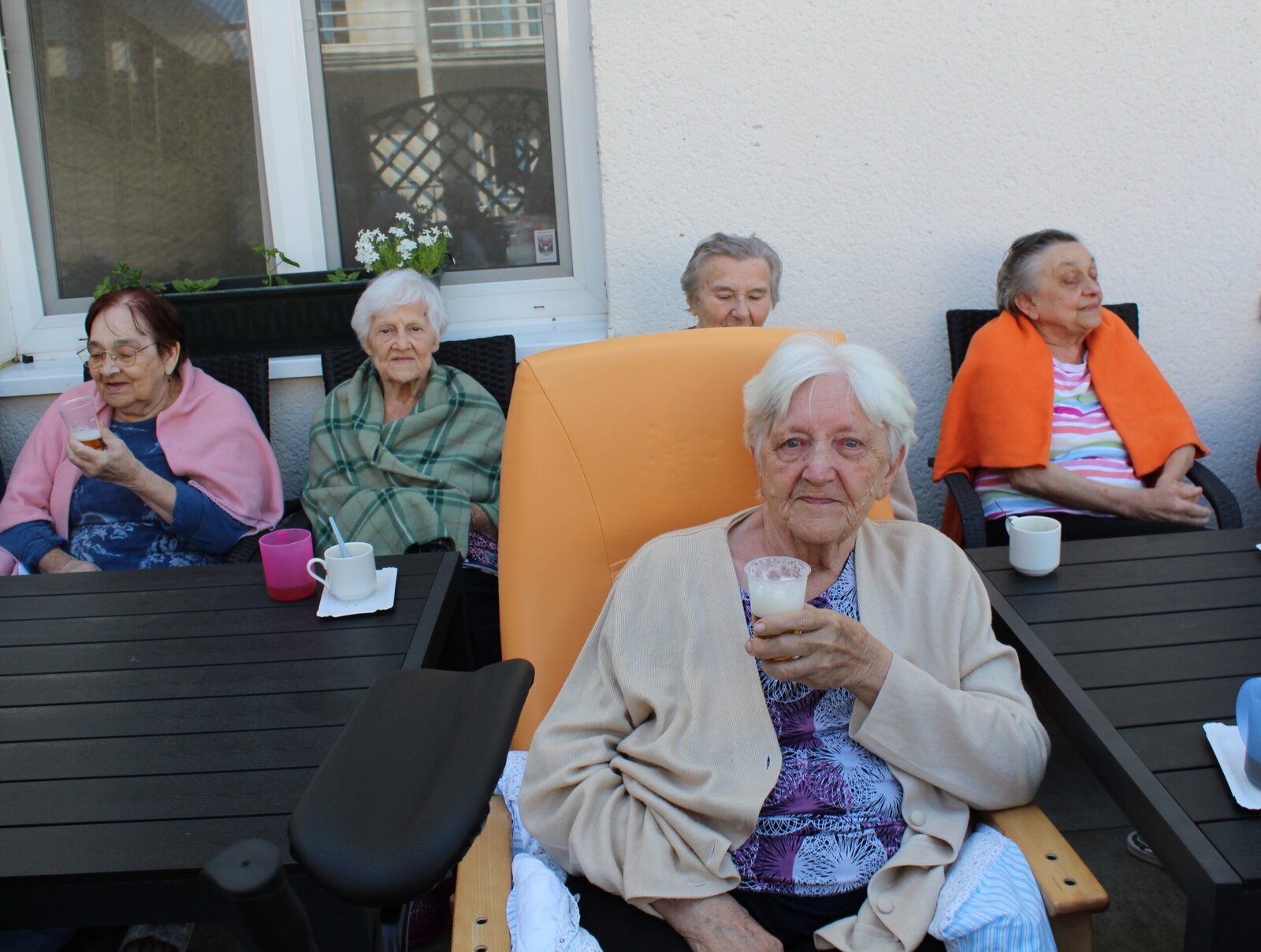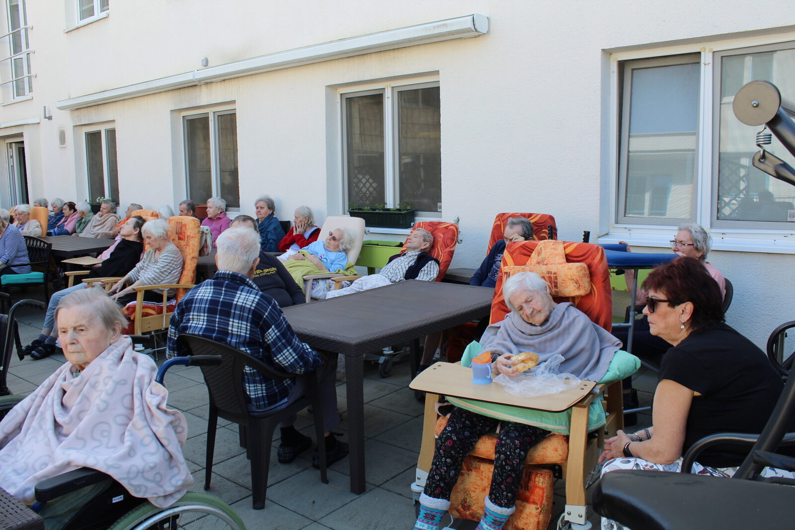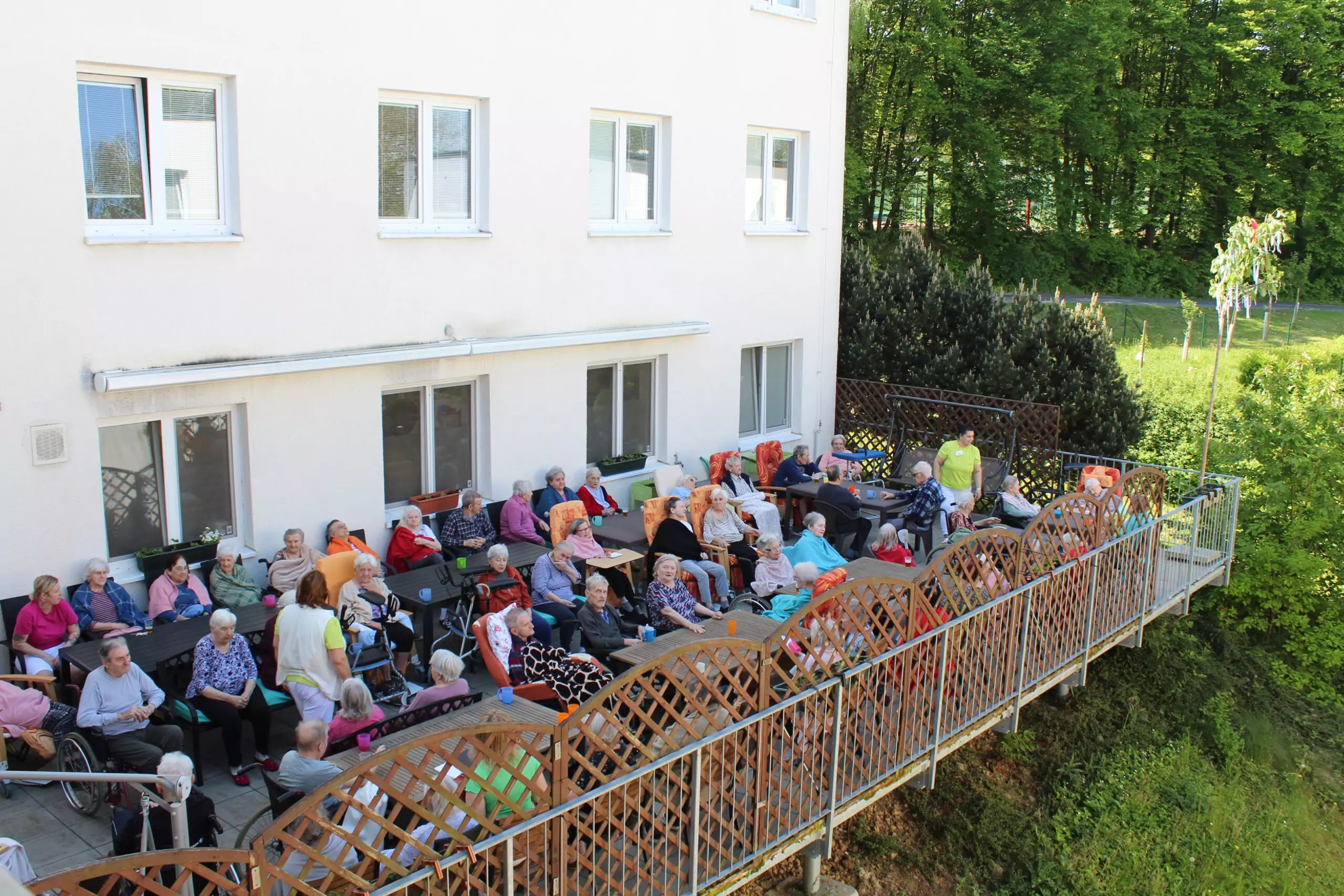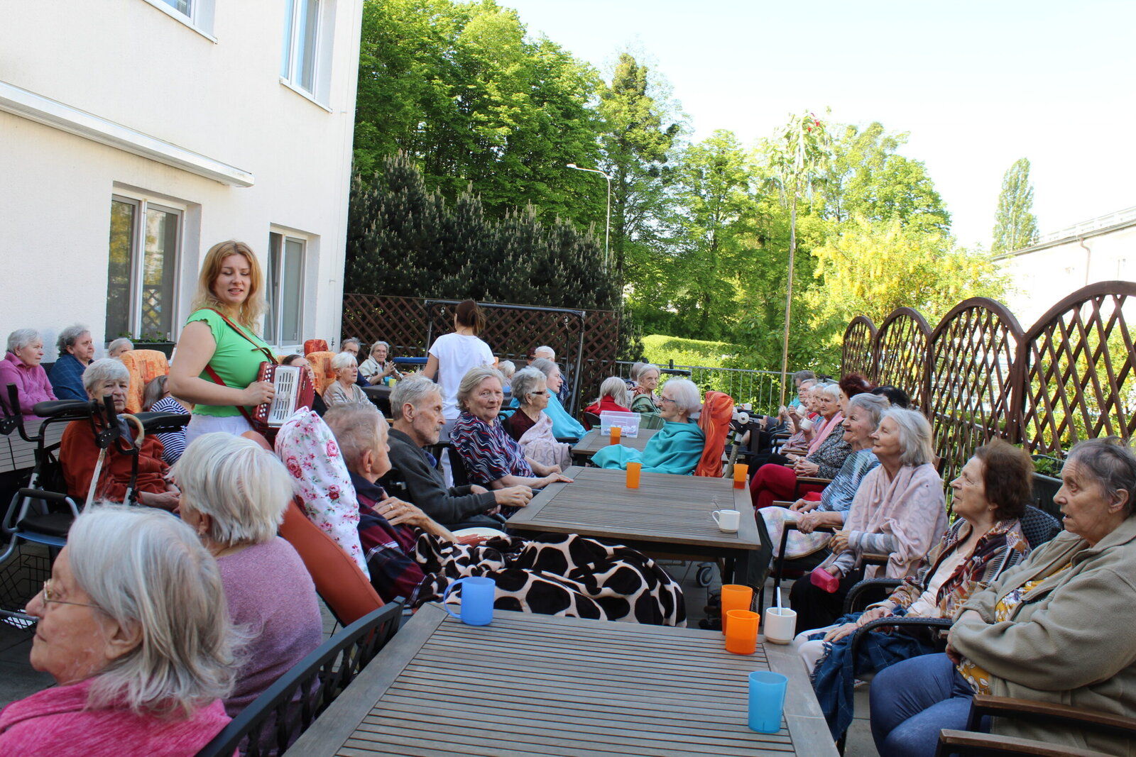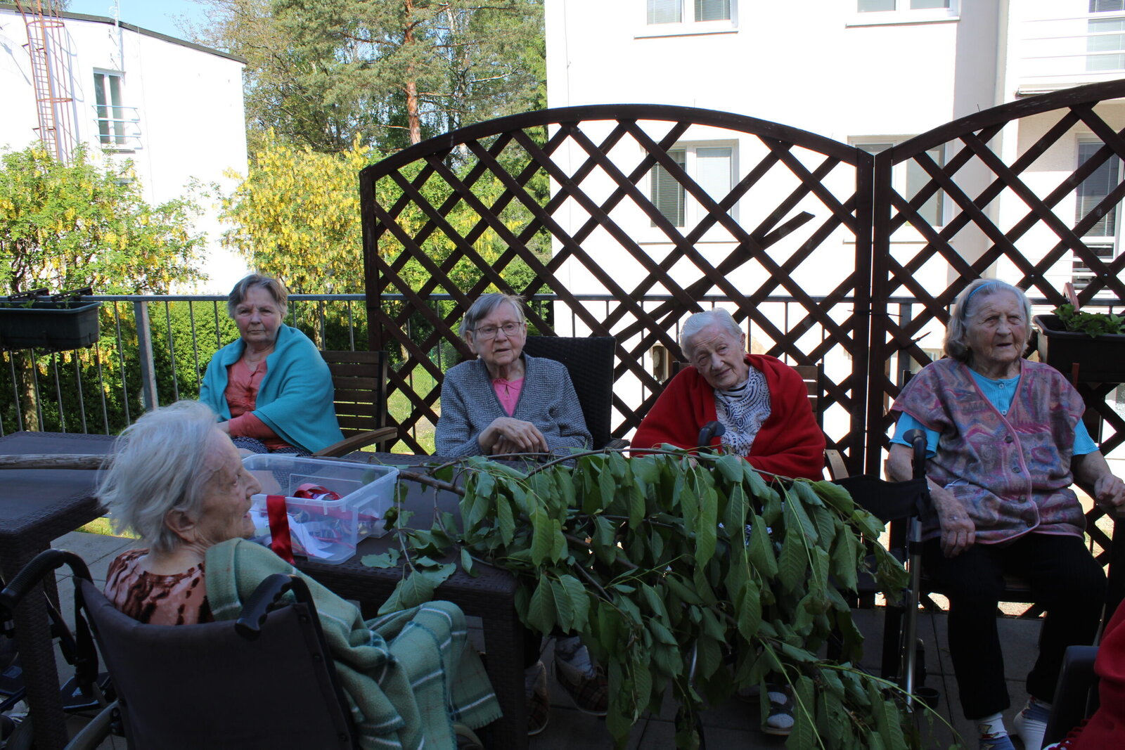 Přivítali jsme měsíc květen postavením májky. Ozdobili jsme ji pentlemi, postavili a nyní zdobí terasu. Věříme, že nám vydrží po celý květen. Ke zdobení jsme zpívali, pili kávu a dali si sladkou buchtu. S takovou bude ten květen krásný.