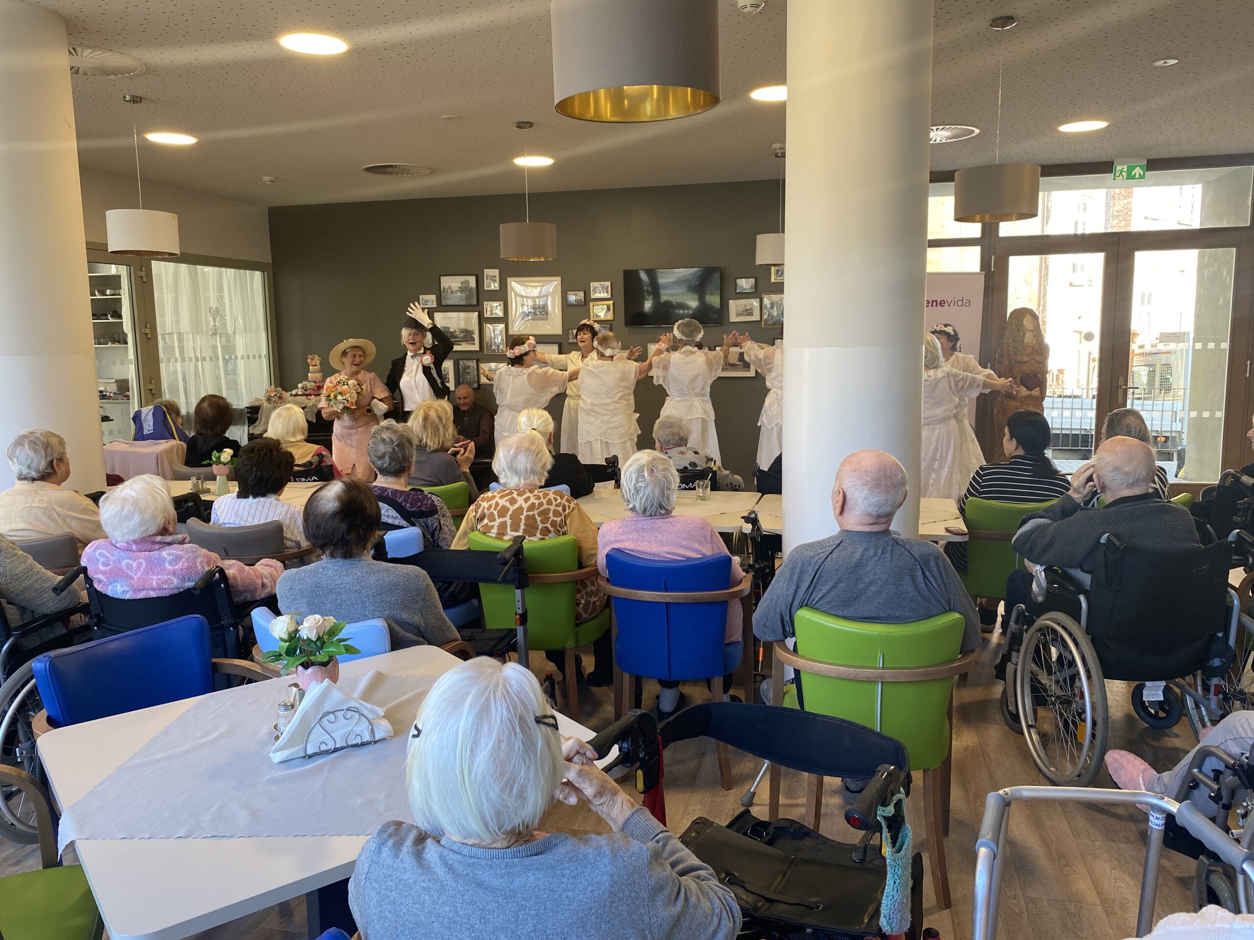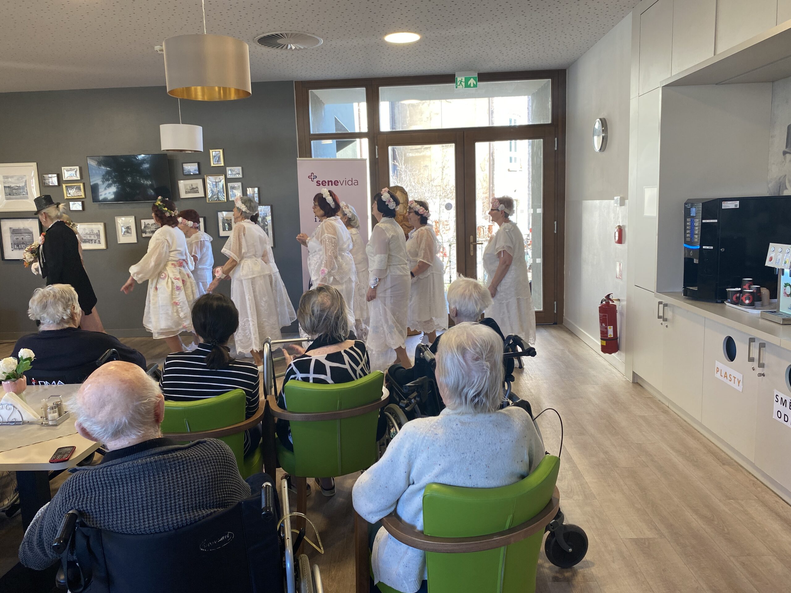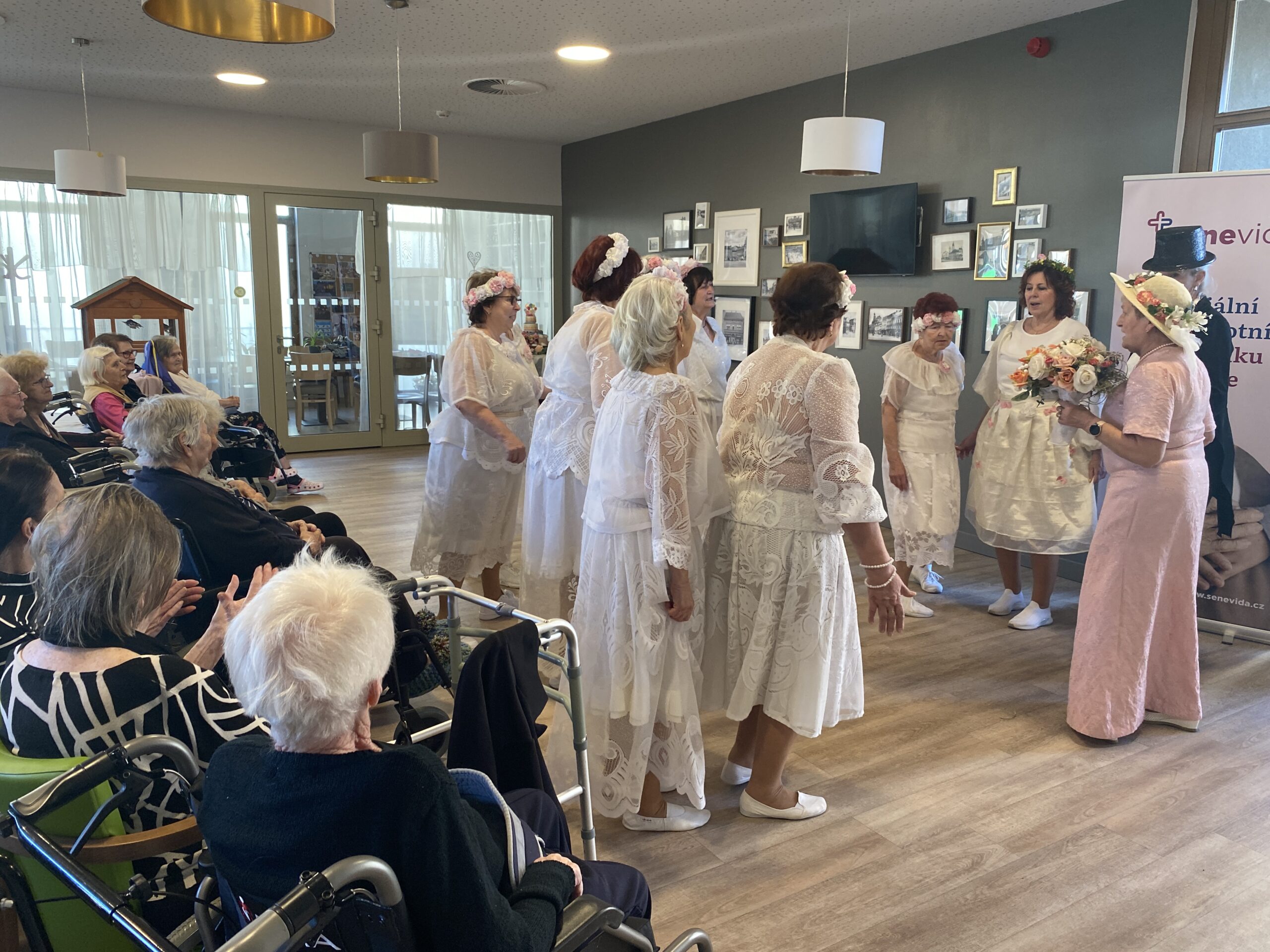 Tentokrát se jejich vystoupení neslo v duchu svatebního pochodu, nechyběly tradiční české slavnostní písně a celý dojem jen dokreslovaly tematické svatební kostýmy. Na závěr vystoupení si naši klienti pochutnali na svatebních koláčcích a věnovali Třídvoračkám hlasitý potlesk.