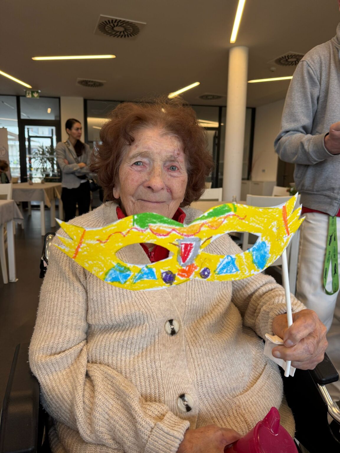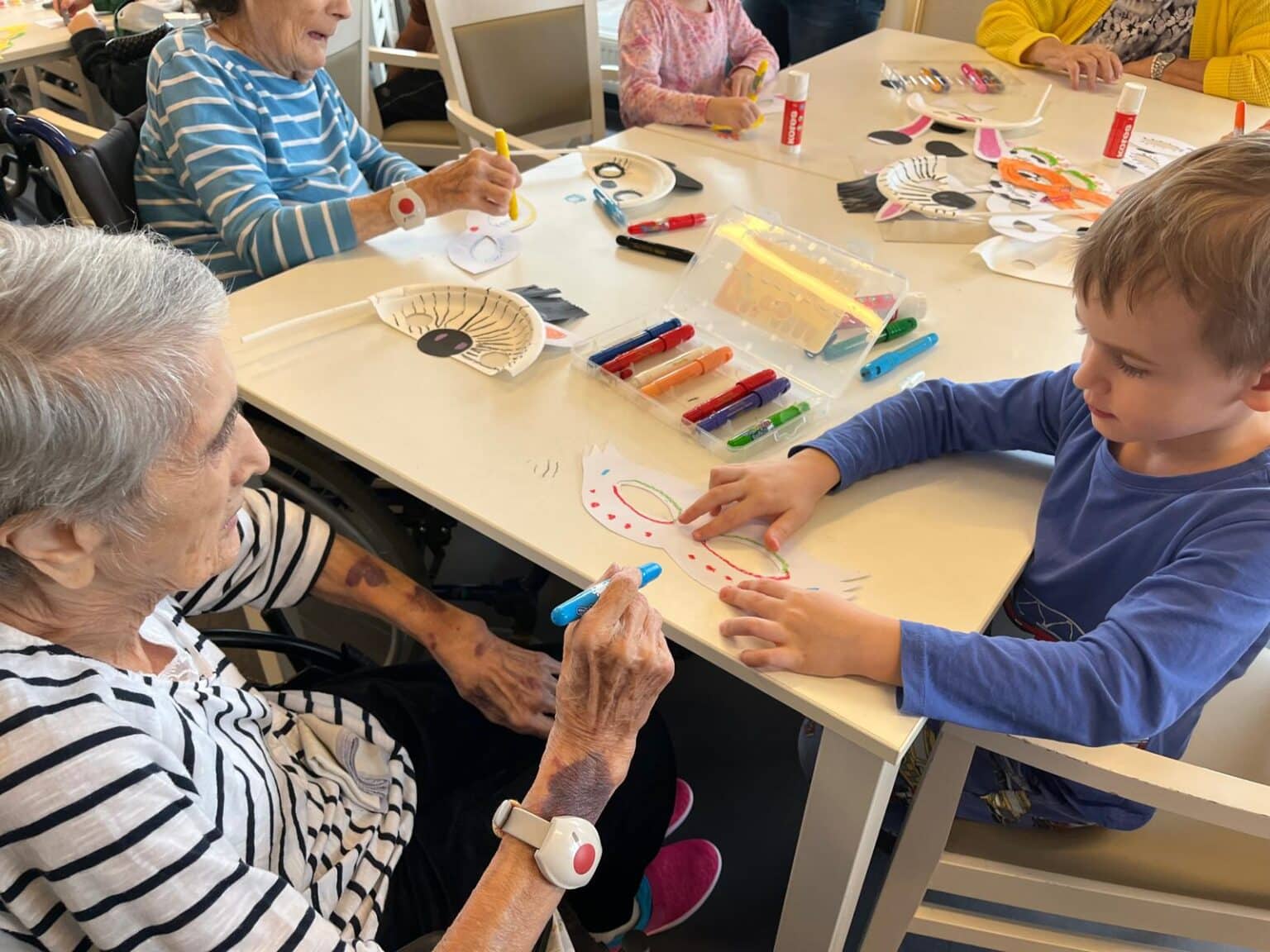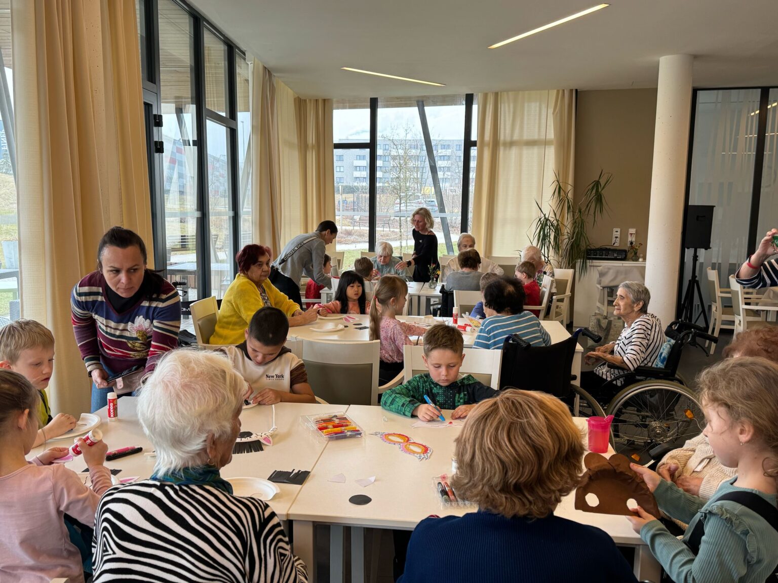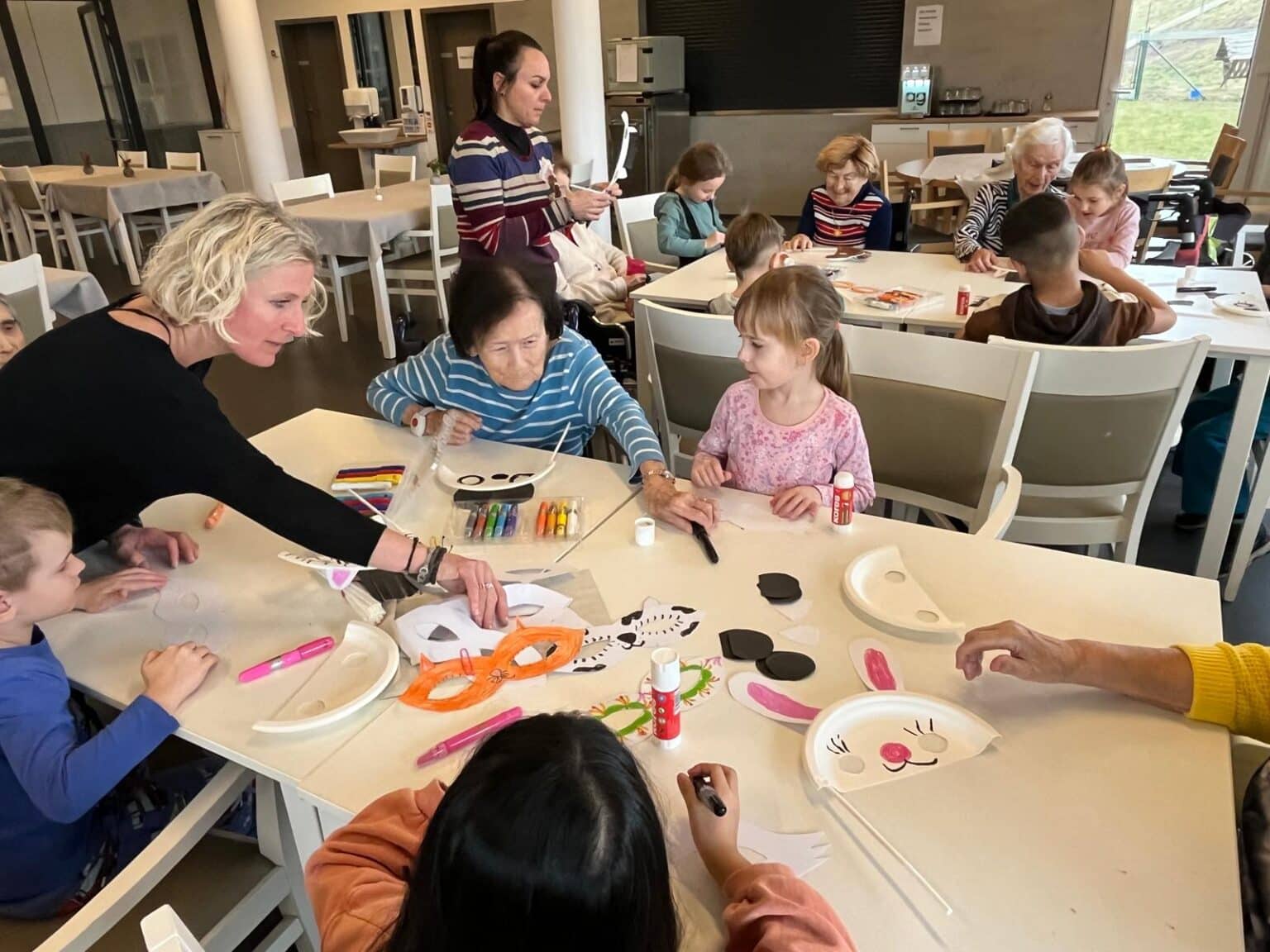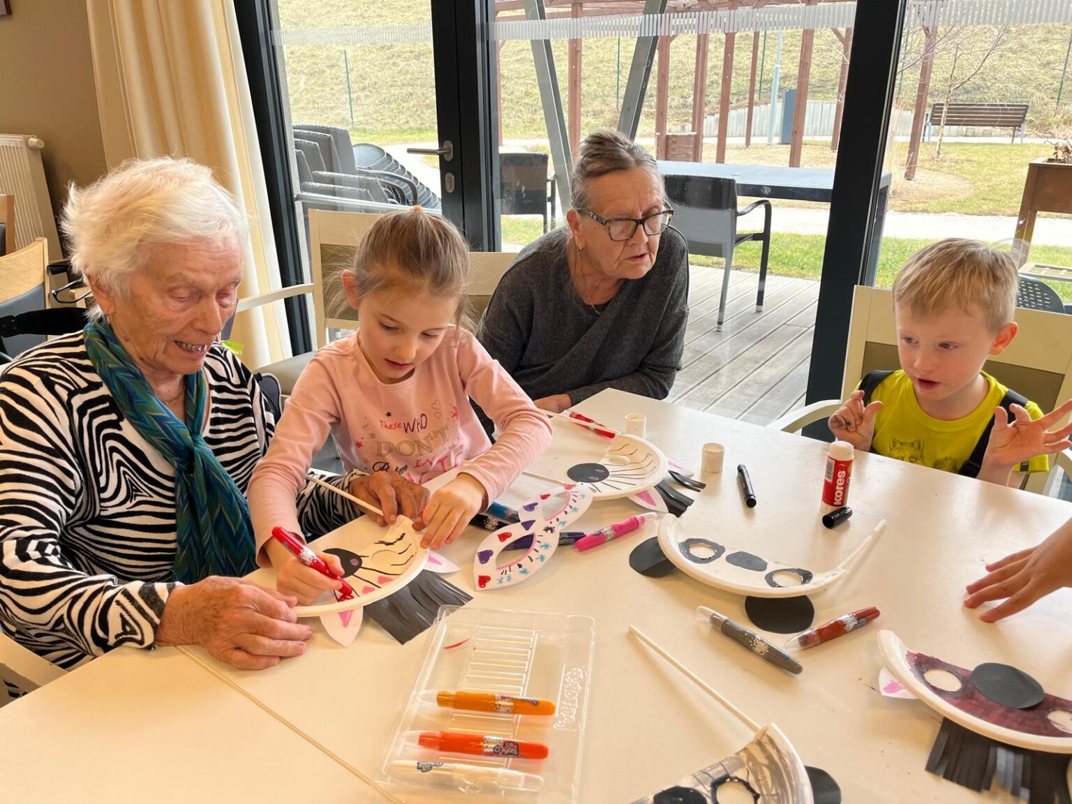 Náš domov navštívily děti z mateřské školky Dolní Měcholupy. Spolupráci zajišťuje organizace „Mezi námi“, propojující generace prostřednictvím různorodých zájmových aktivit. Pod společným vedením jsme vyrobili masky pro Masopustní průvod, kterého se naši klienti zúčastnili během odpoledního programu.
