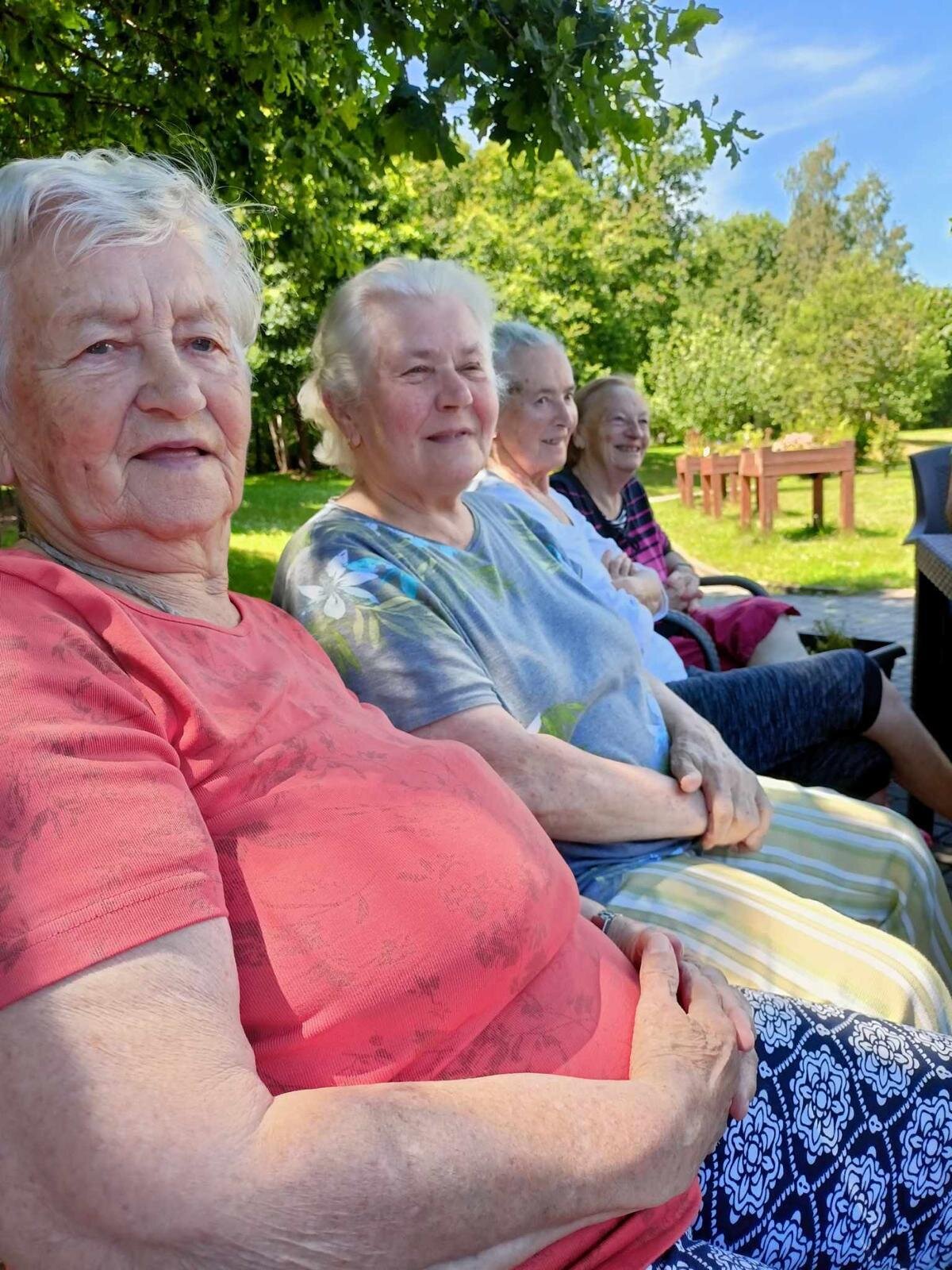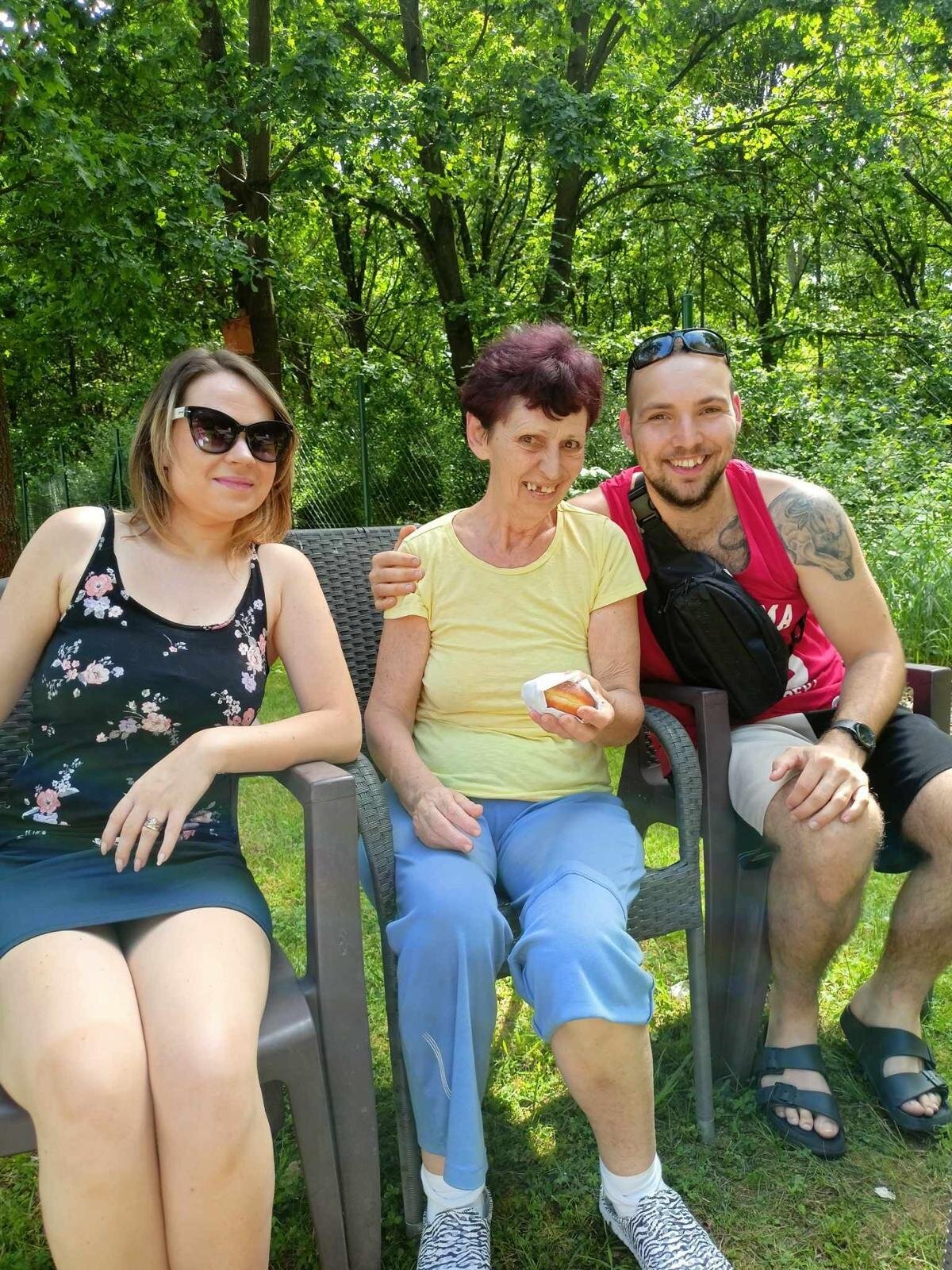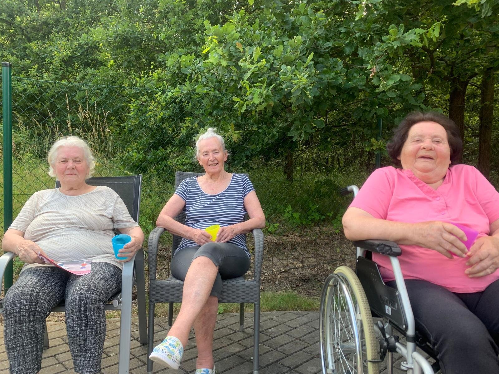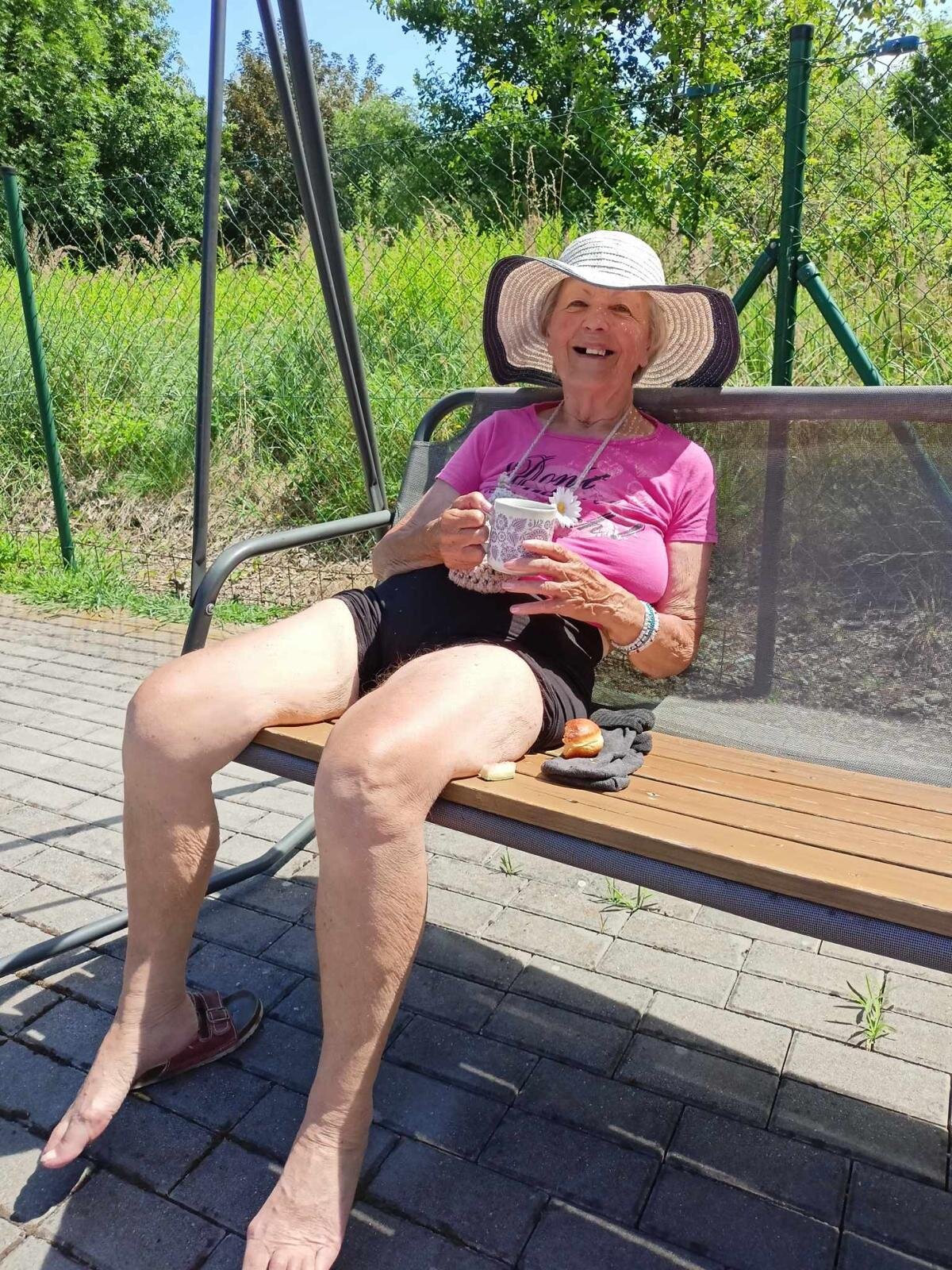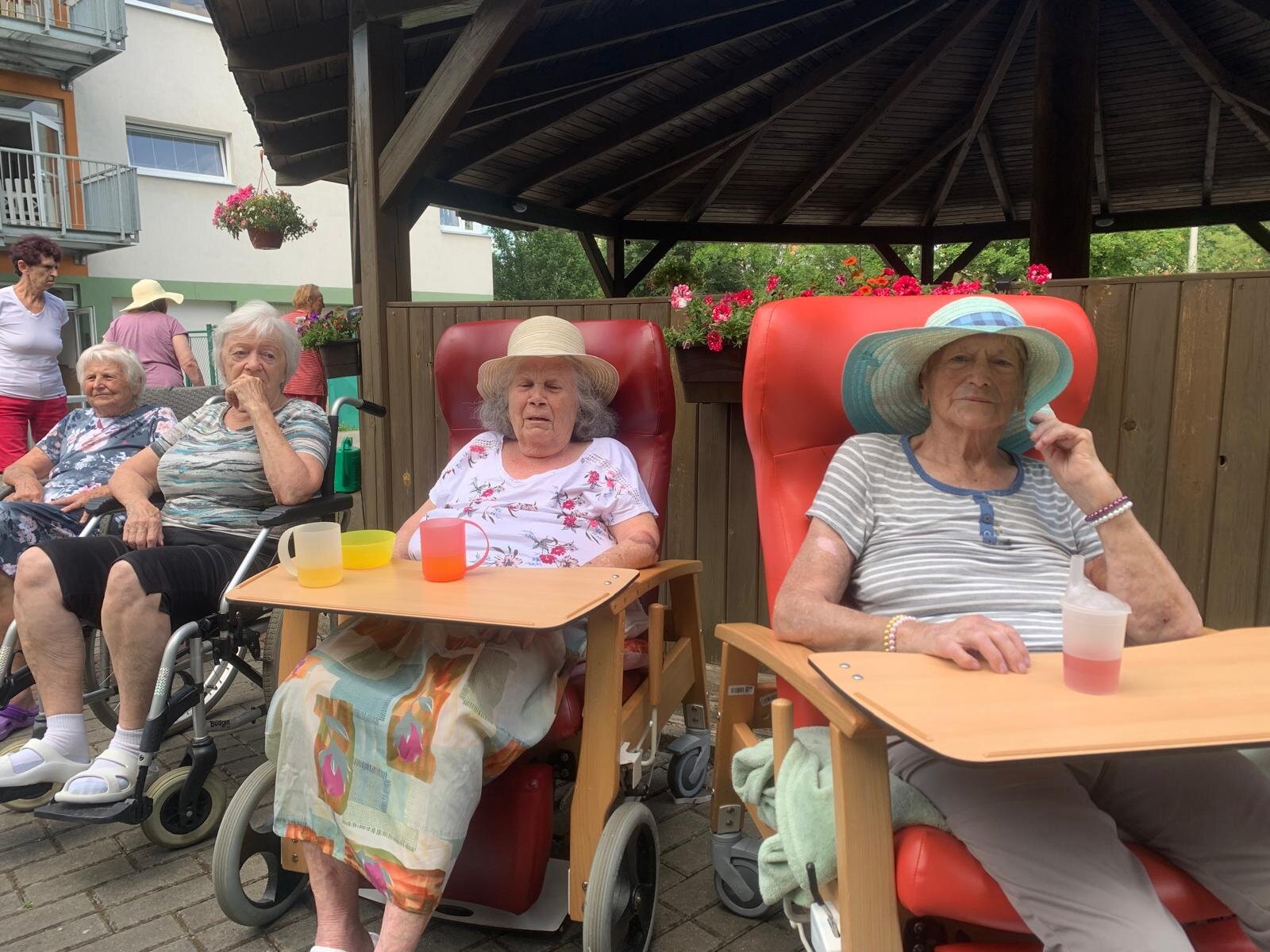 S klobouky na hlavě nás sluníčko netrápí a užíváme si, že neprší. Proč bychom nevyužili naši zahradu. Dá se tu krásně posedět a popovídat. :-)