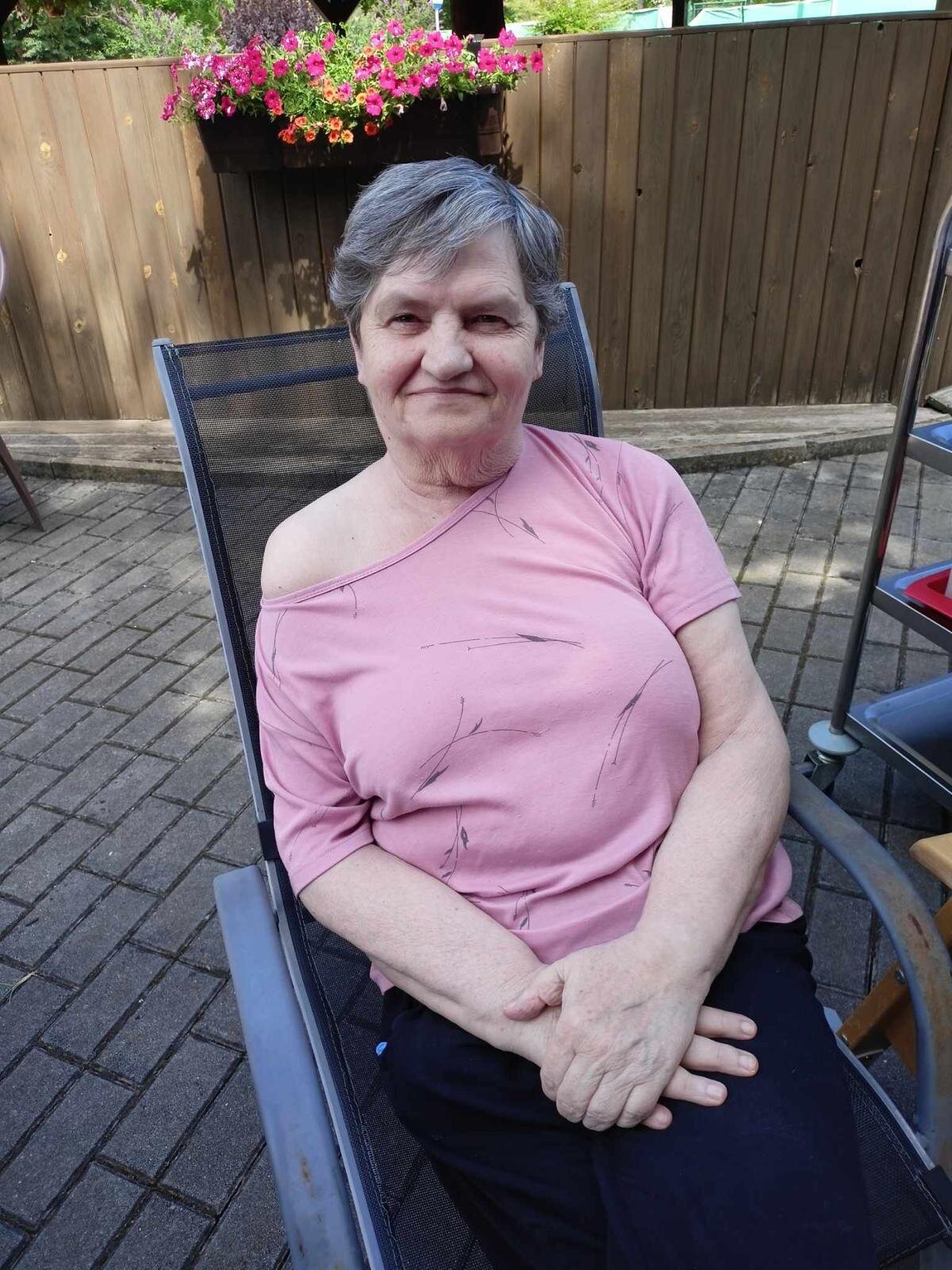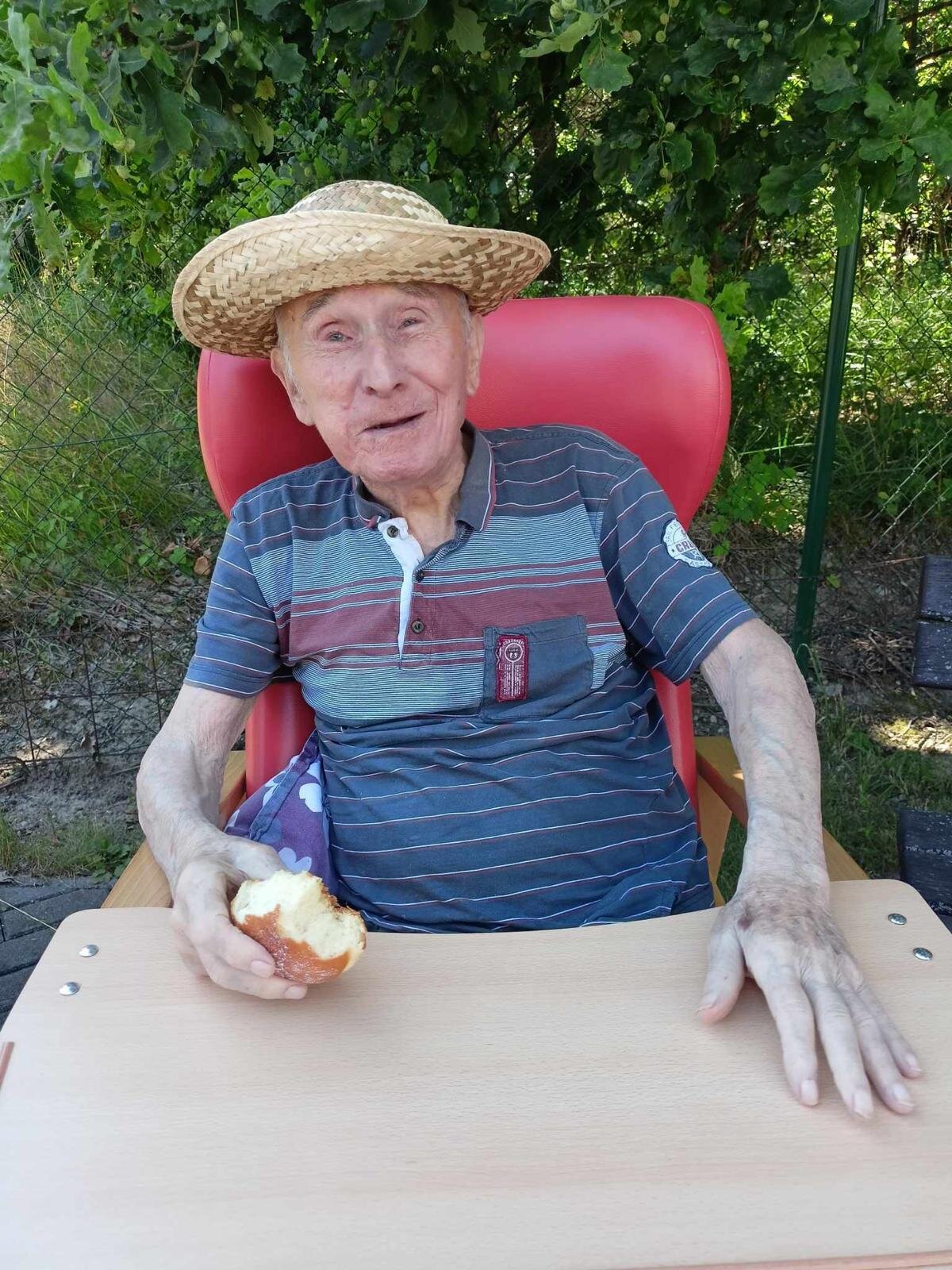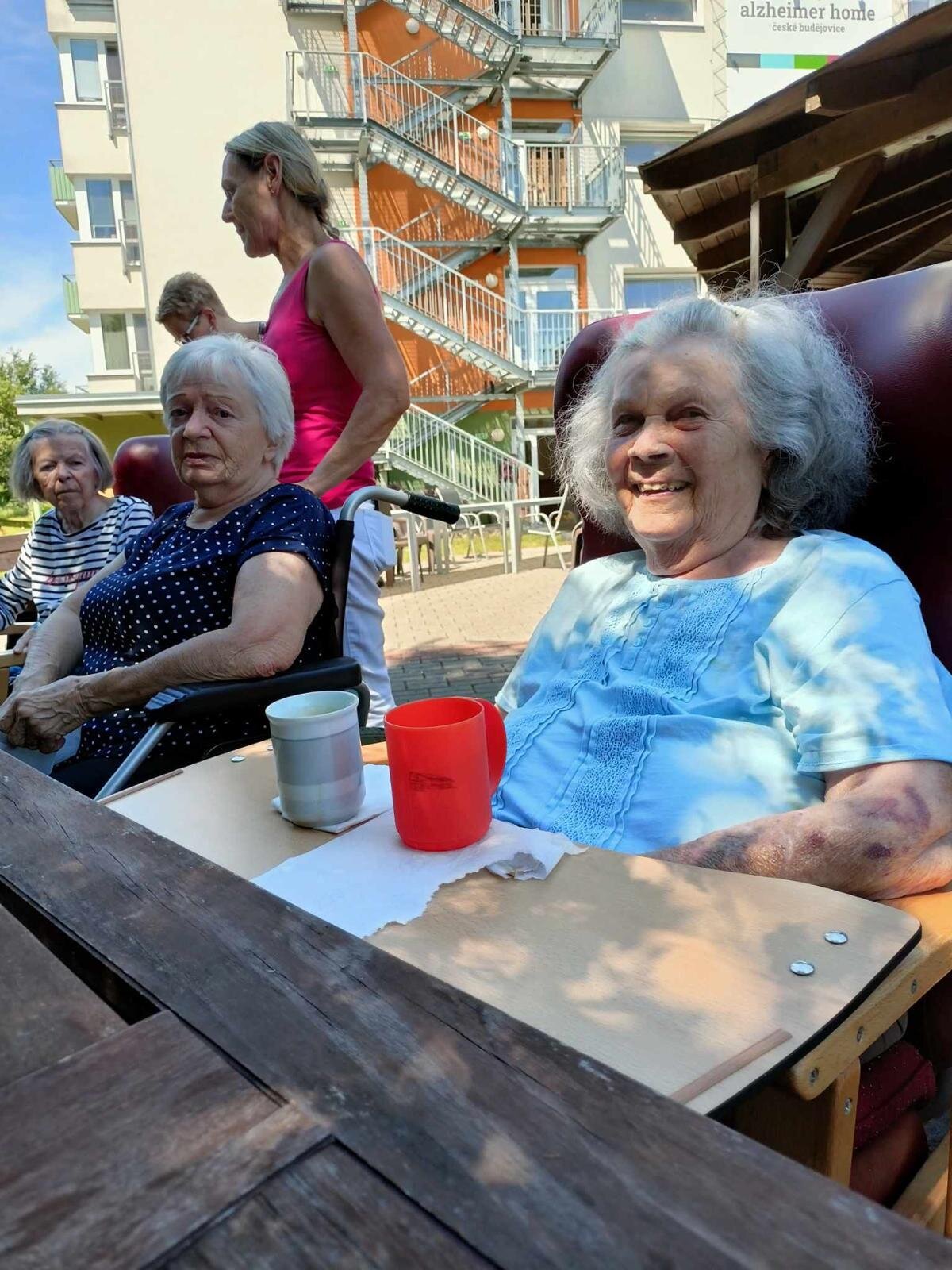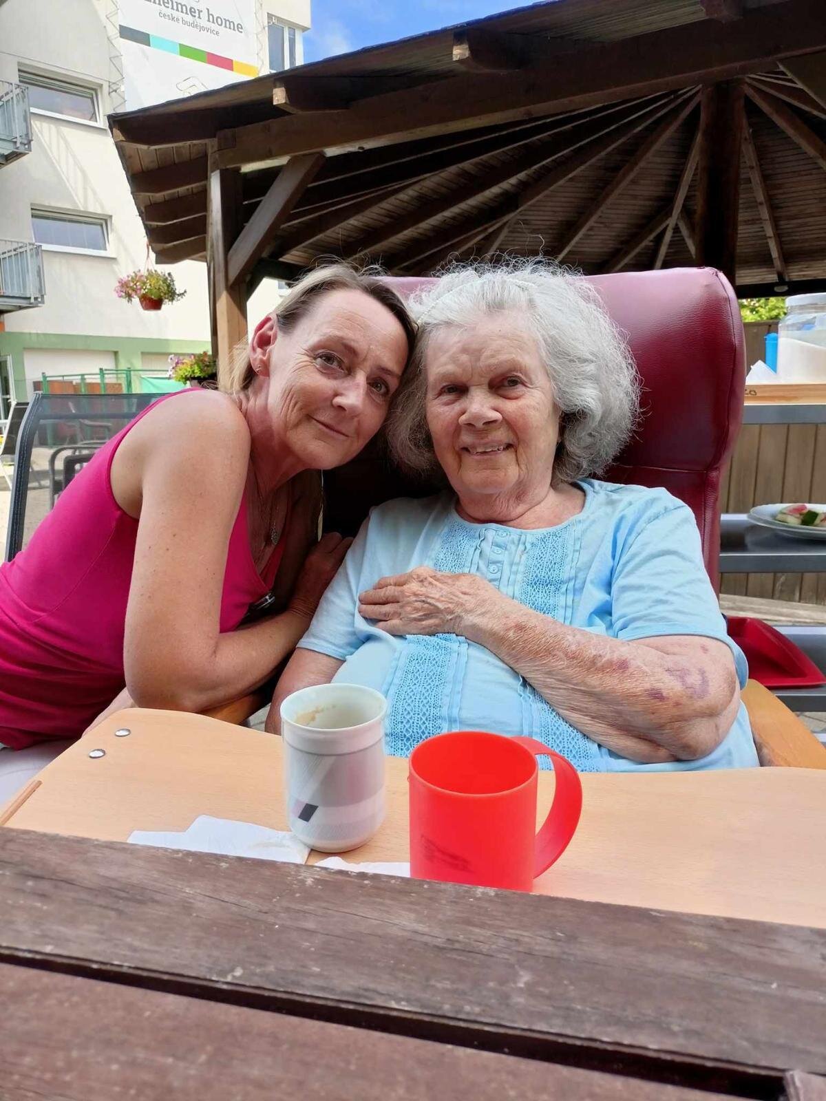 S klobouky na hlavě nás sluníčko netrápí a užíváme si, že neprší. Proč bychom nevyužili naši zahradu. Dá se tu krásně posedět a popovídat. :-)