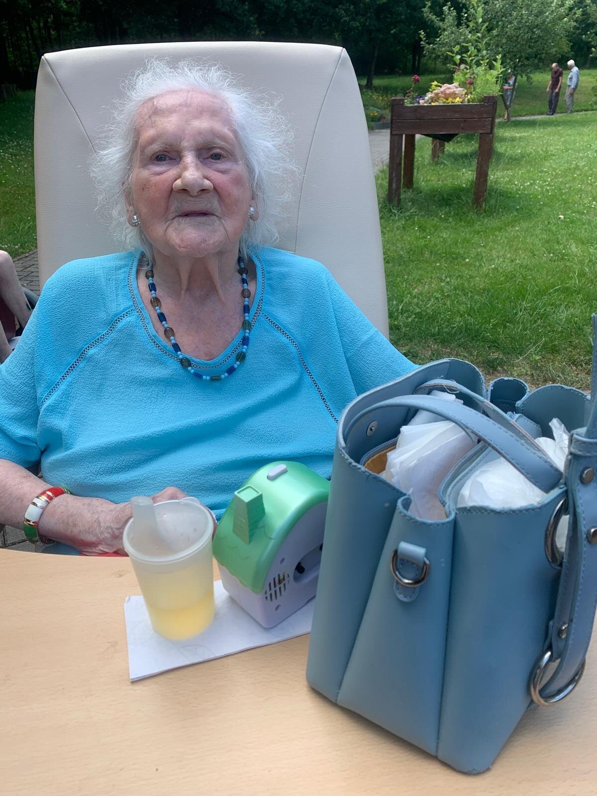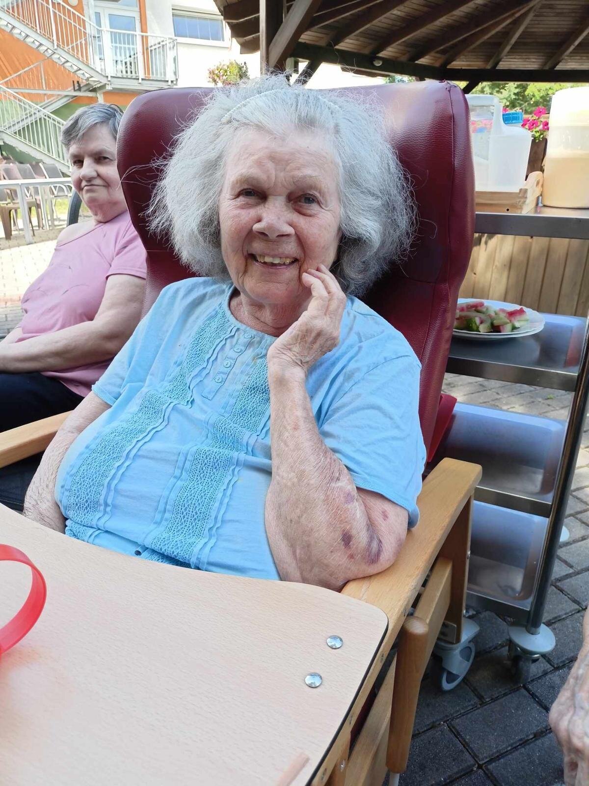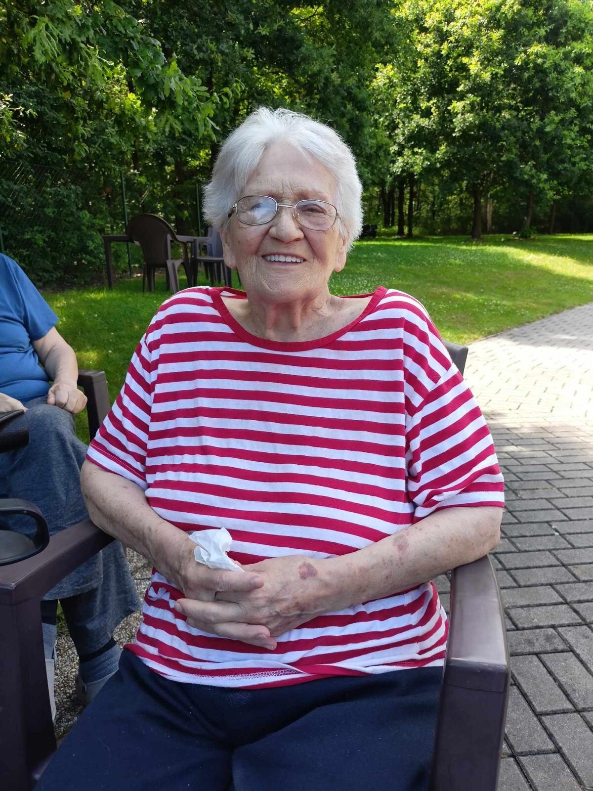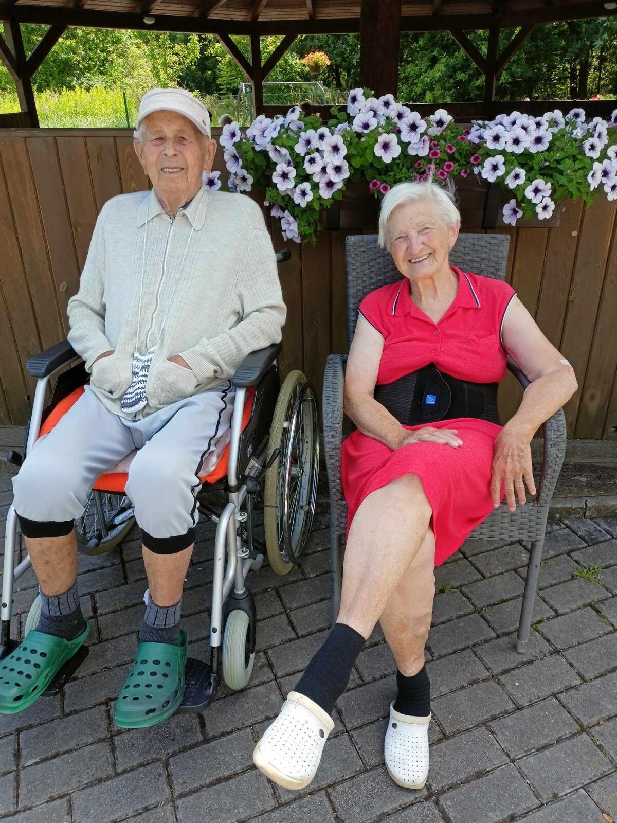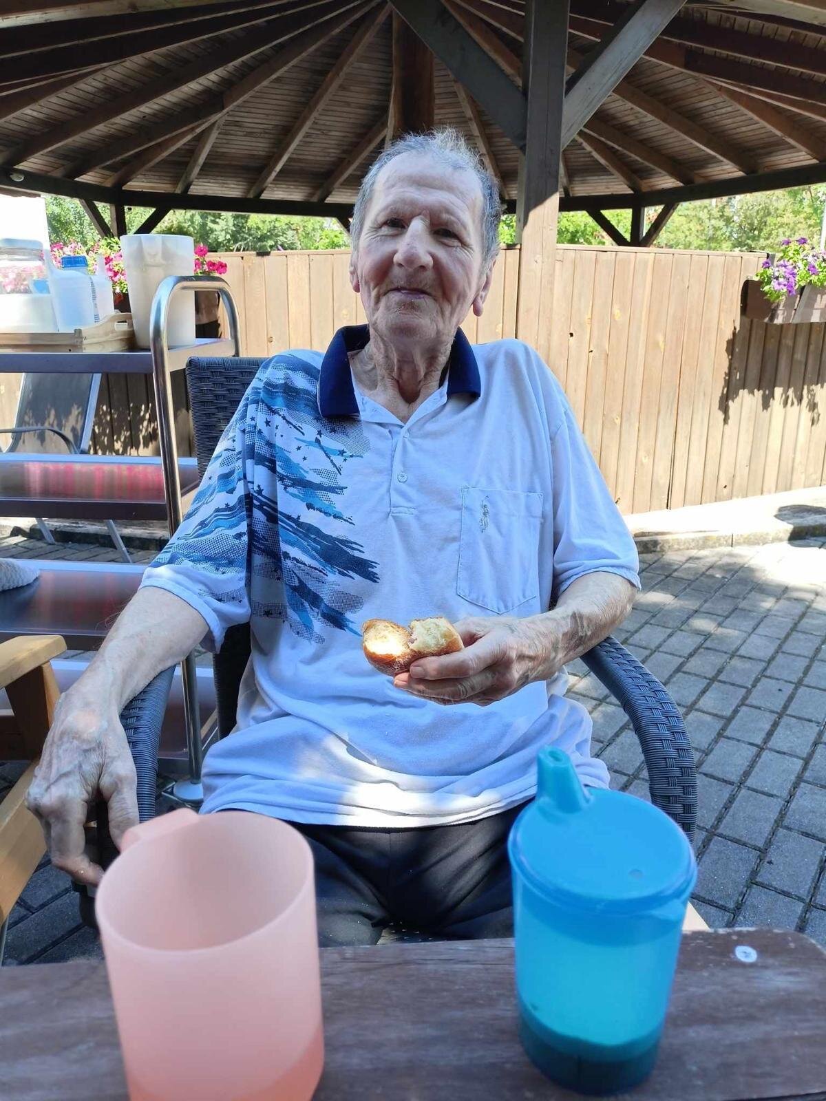 S klobouky na hlavě nás sluníčko netrápí a užíváme si, že neprší. Proč bychom nevyužili naši zahradu. Dá se tu krásně posedět a popovídat. :-)
