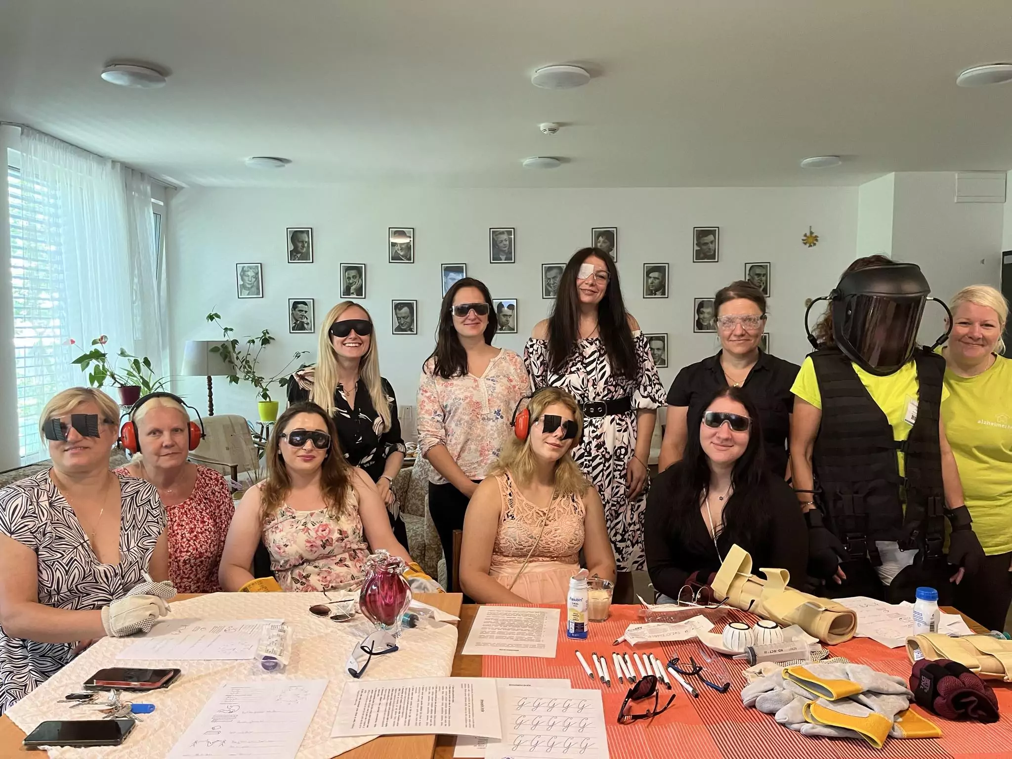 Někteří z nás měli možnost účastnit se velmi zajímavého školení na téma "V kůži seniora". Měly jsme možnost obléknout si gerontooblek, ve kterém jsme si vyzkoušely běžné činnosti jako chůze do schodů, ze schodů, ulehnutí na lůžko, vstávání, zvedání předmětů a podobně. Dále jsme si vyzkoušely pomocí speciálních brýlí různé oční vady a se sluchátky sluchová postižení.