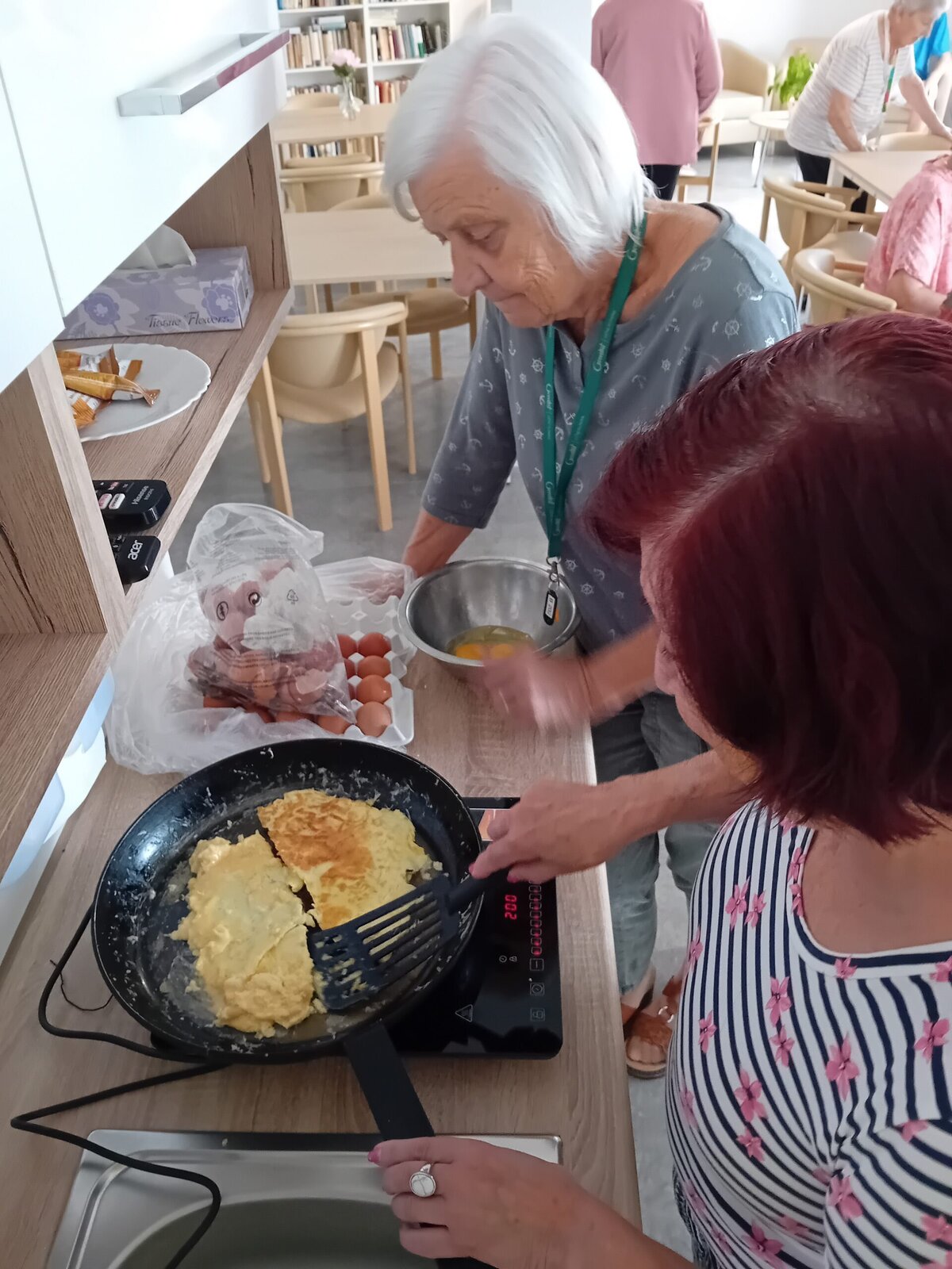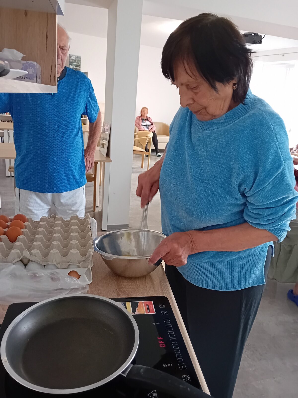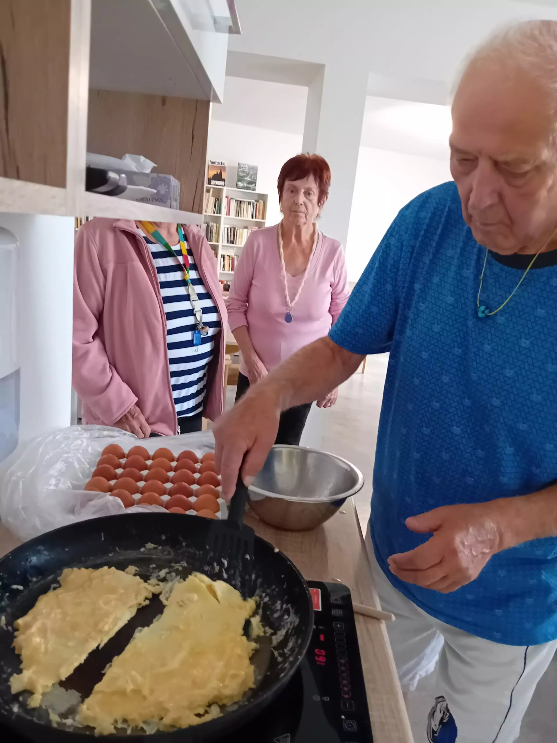 V rámci odpolední klubu jsme si dnes s klienty Senevida Kateřinice k odpolední svačině připravili vaječnou omeletu. Klienti si přípravu i samotné vaření moc užili.
