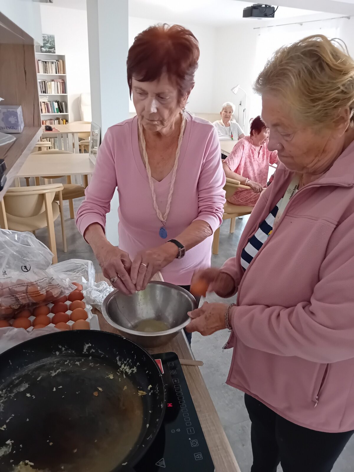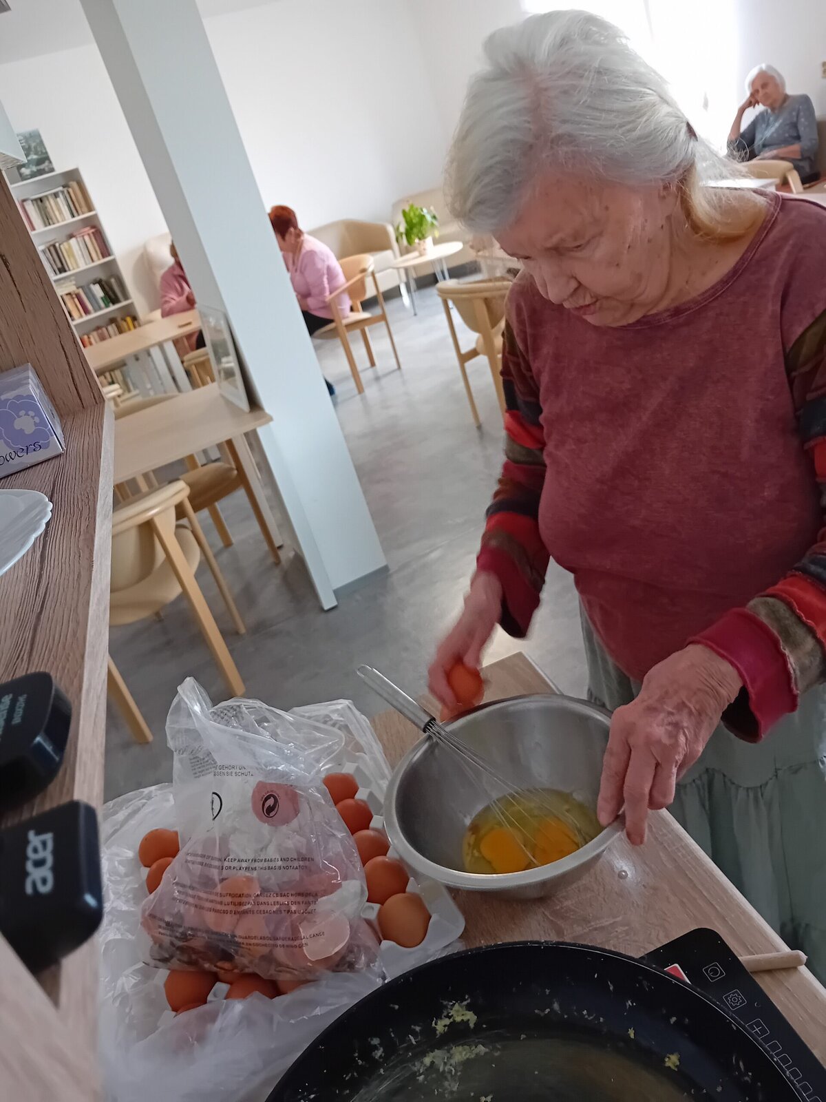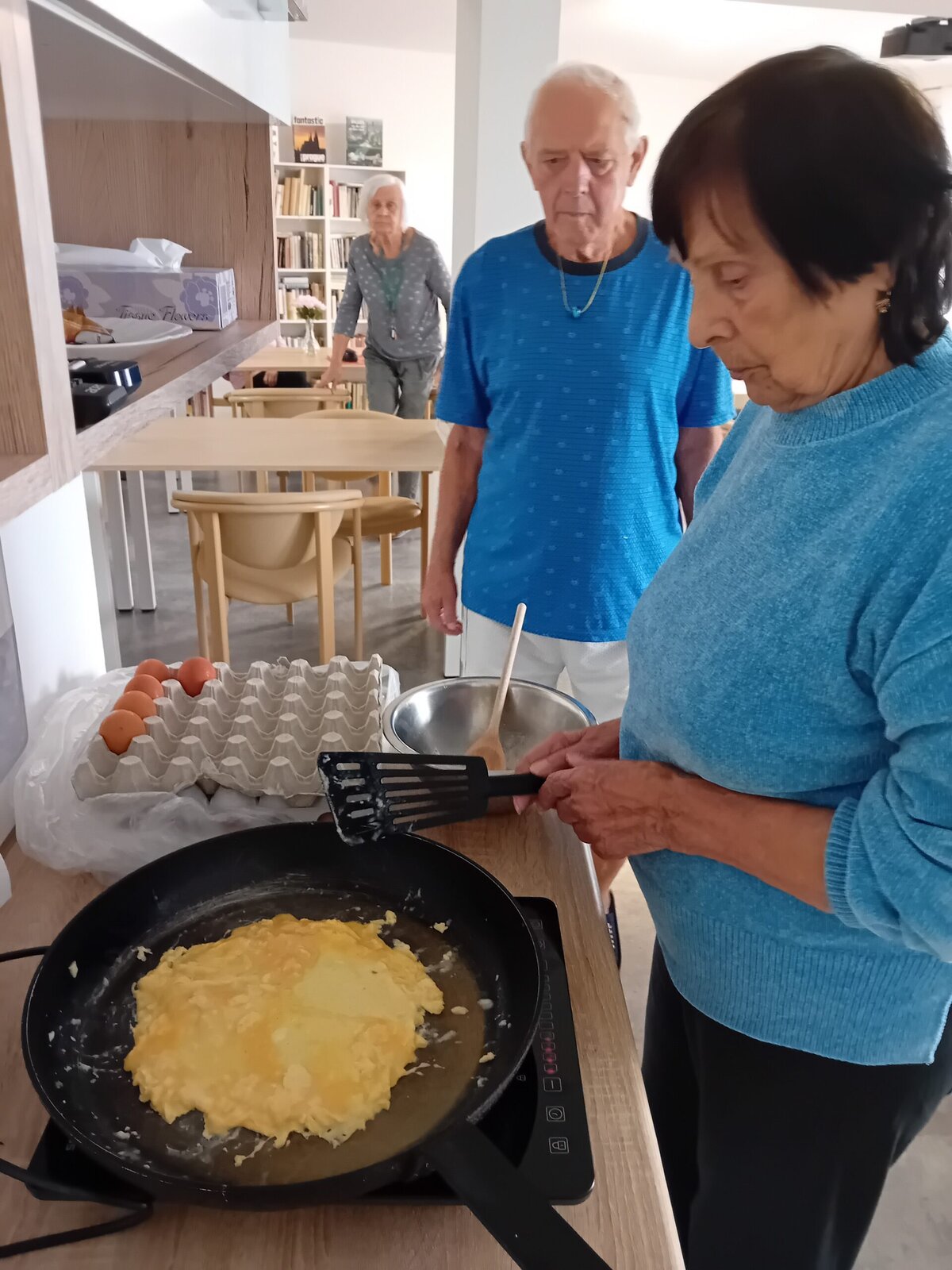 V rámci odpolední klubu jsme si dnes s klienty Senevida Kateřinice k odpolední svačině připravili vaječnou omeletu. Klienti si přípravu i samotné vaření moc užili.