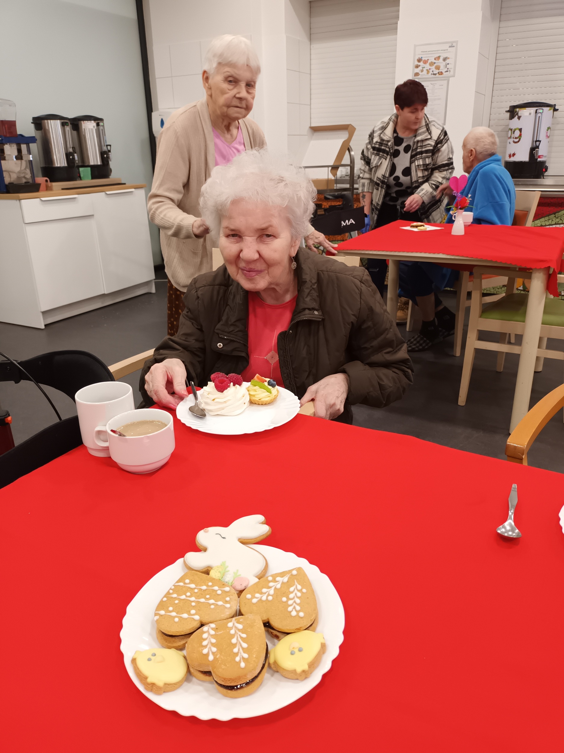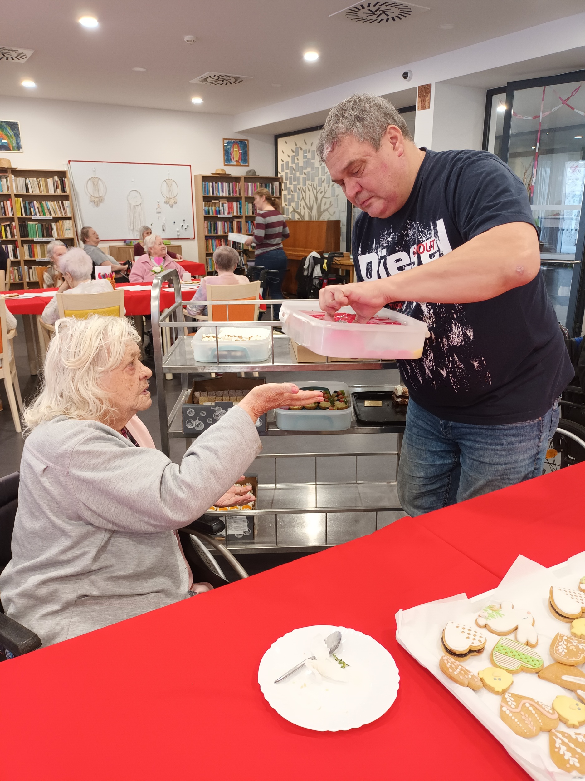 Pro nás letos pekla paní Lalinská, která k nám přišla i s manželem, dobroty připravovala také paní Václavíková, paní Vejražková a paní Šejvlová. Všem touto cestou posíláme velké poděkování a pochvalu za jejich laskavost, lidskost, a také skvěle odvedenou práci. Jejich zákusky a perníčky byly nejen nesmírně chutné, ale také krásně a precizně provedené. Po akci jsme od našich klientů slyšeli jen samou chválu. Jedna z klientek se svěřila, že v cukrárně nebyla snad padesát let, my jsme ji tak mohli cukrárnu dopřát přímo v našem domově.