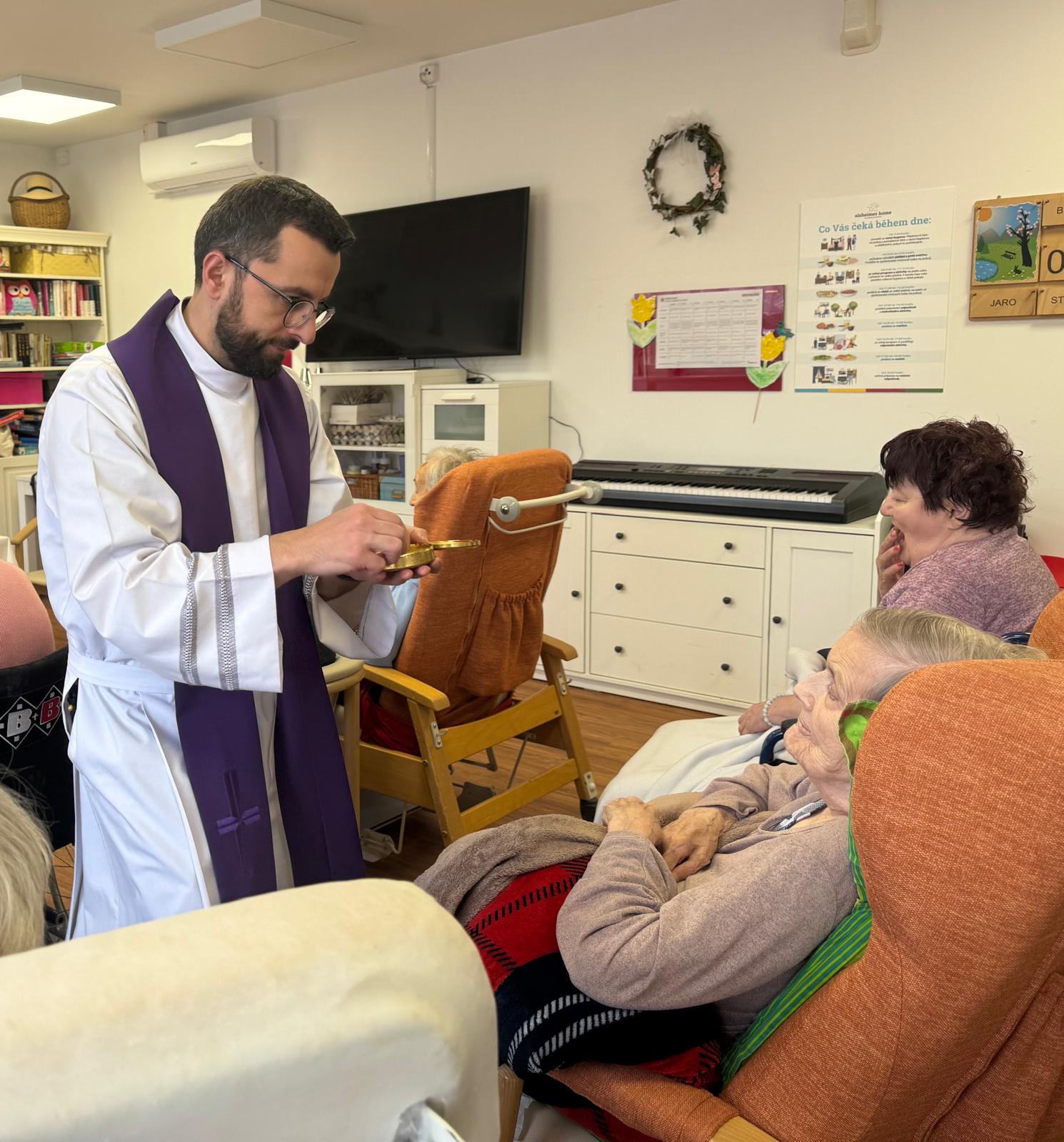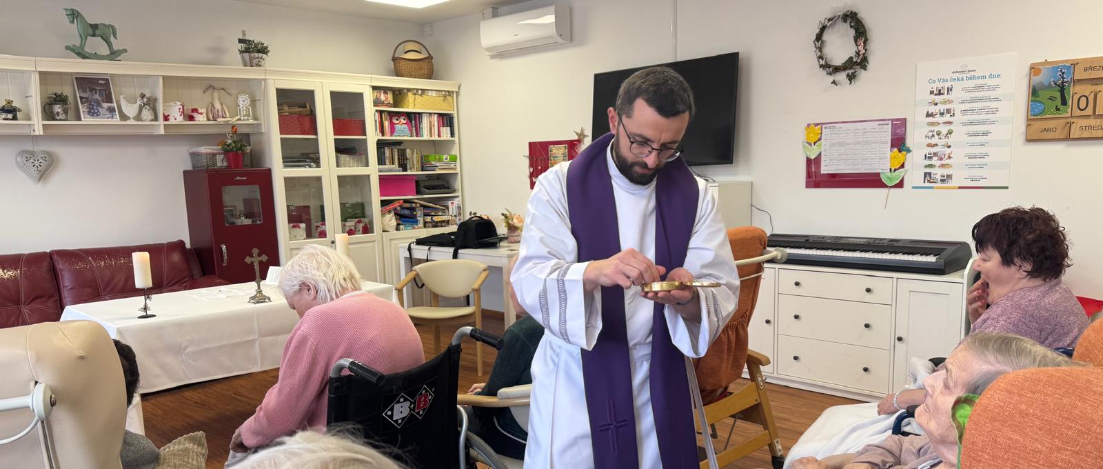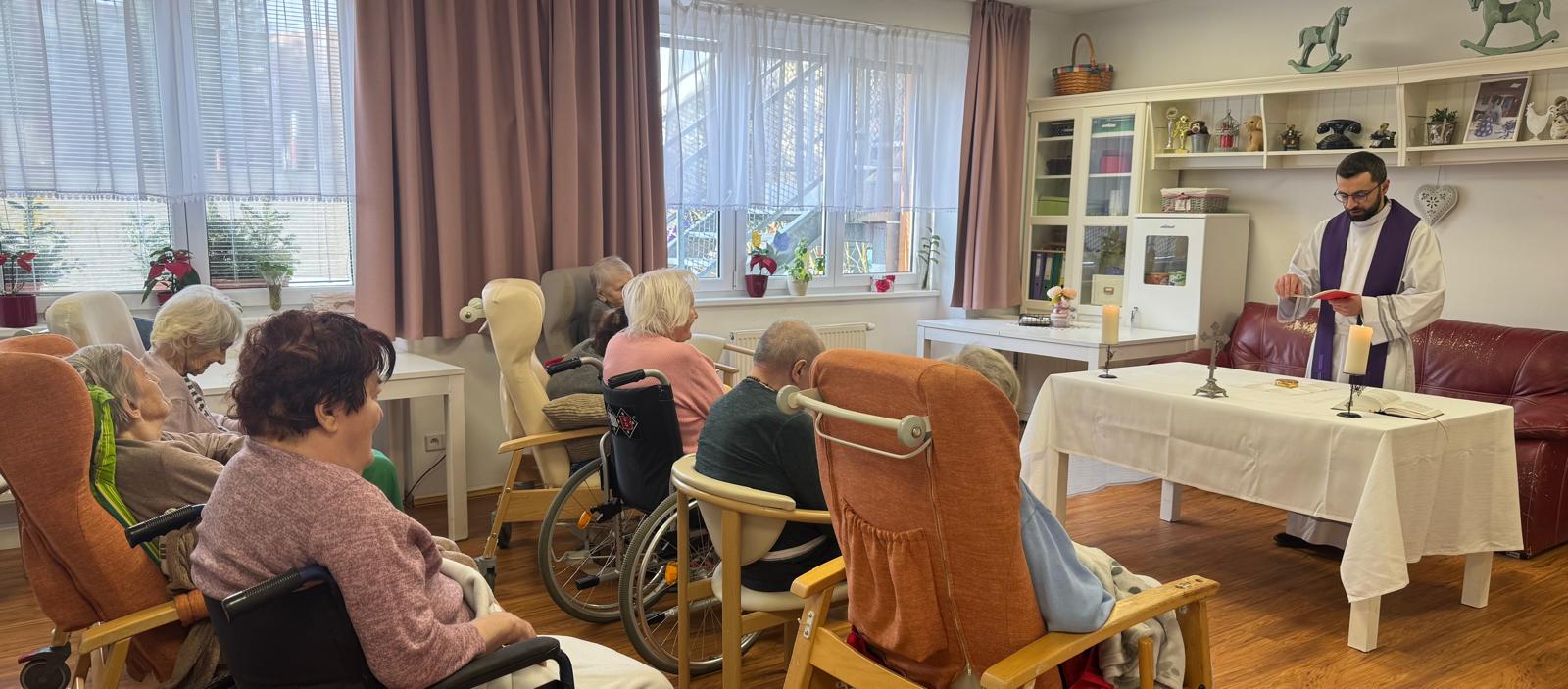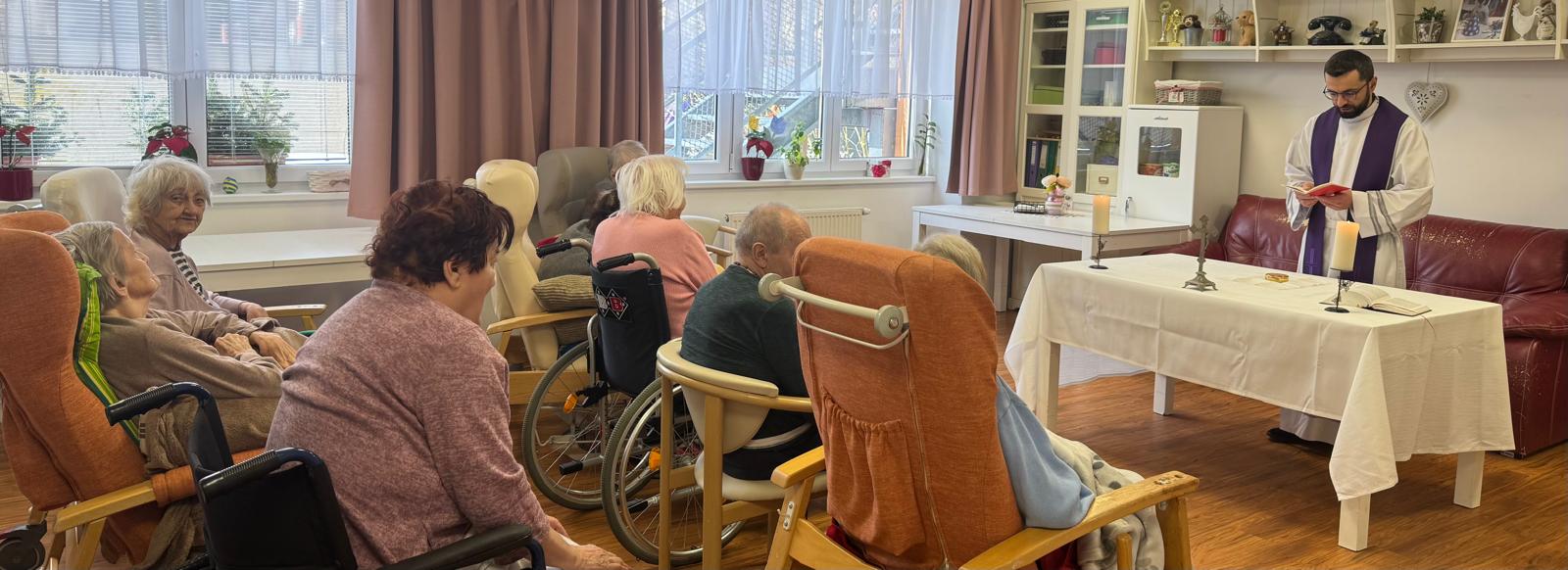 Velikonoční mše proběhla v klidné a slavnostní atmosféře v prostorách zařízení. Následně pan farář navštívil také klienty v jejich pokojích. Setkání mělo velmi klidný a důstojný průběh. Klienti jsou spokojeni a těší se na další setkání. 🍀💙
