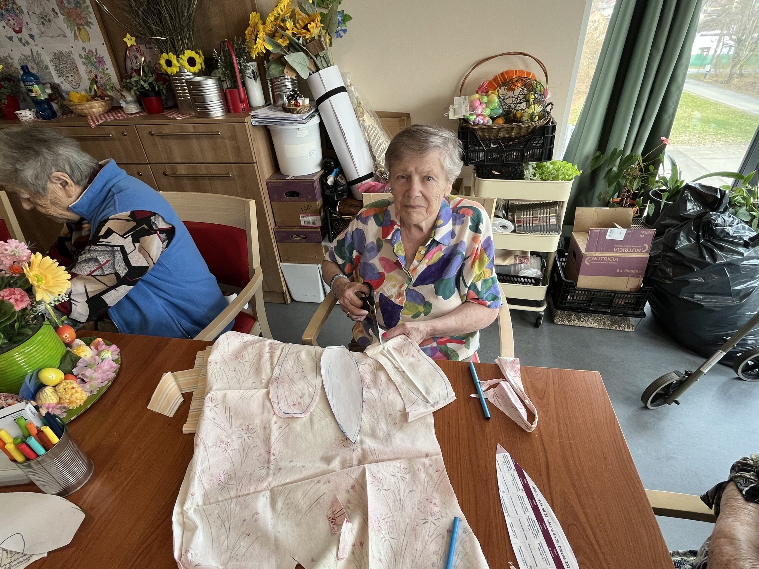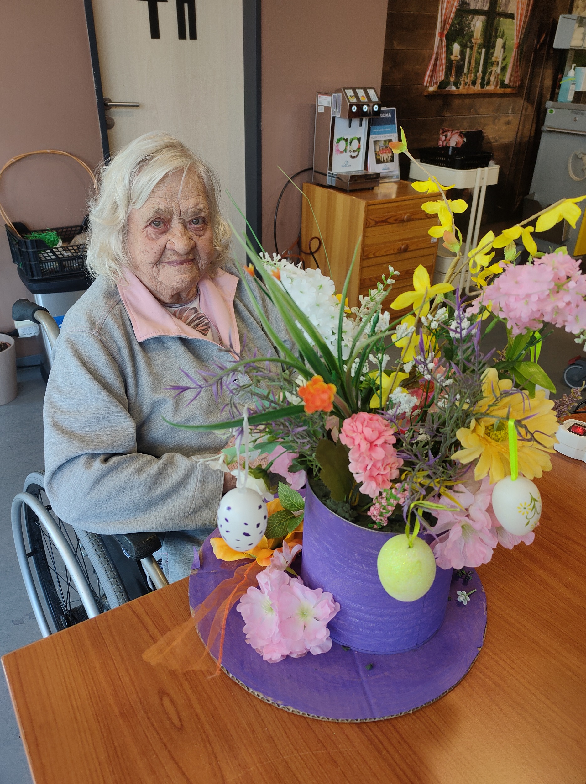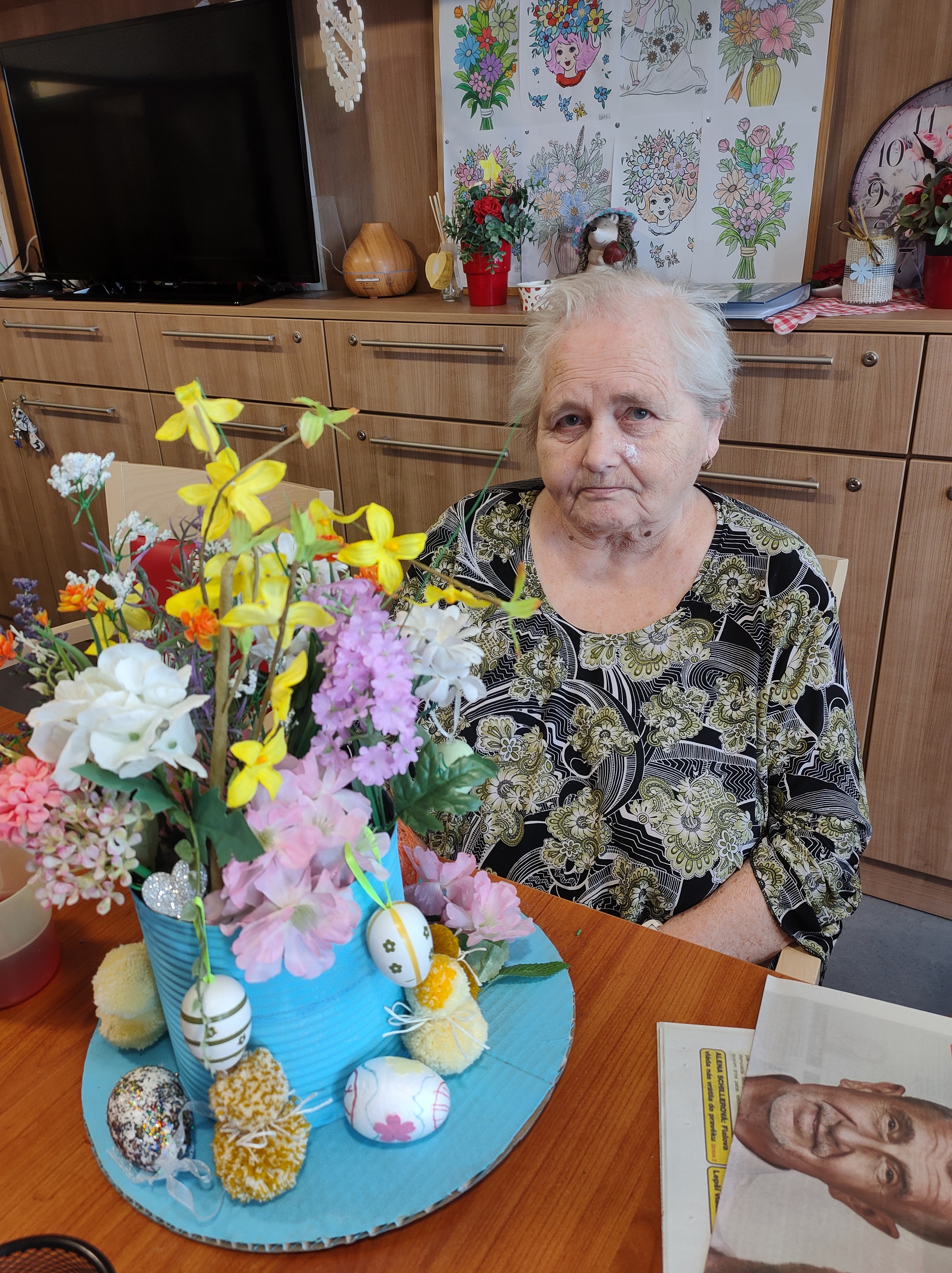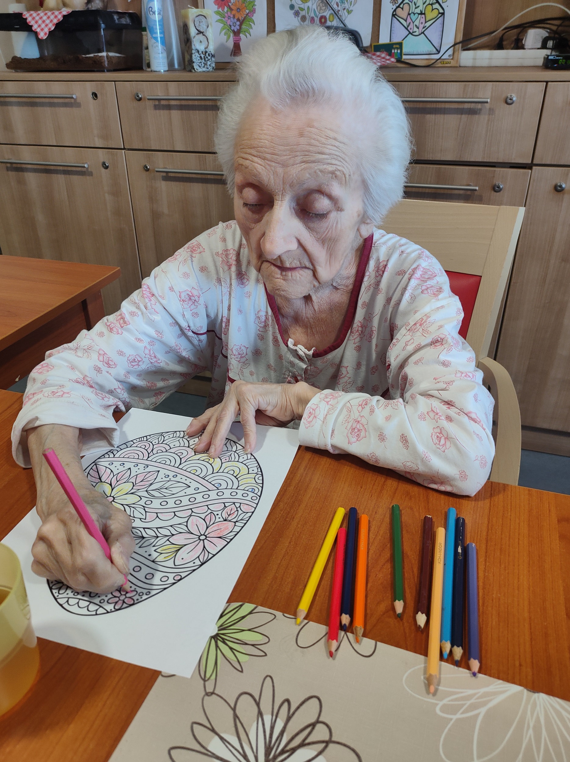 Každý přispěl dle svých možností. Pro zkrácení dlouhé chvíle jsme pro naše klienty připravili i množství nejrůznějších omalovánek, samozřejmě opět s motivem květin, jara a Velikonoc. Při výzdobě domova jsme nezapomněli ani na tradiční kočičky či zlatý déšť. Všichni jsme se tak postupně ladili na přicházející jaro a sváteční čas.