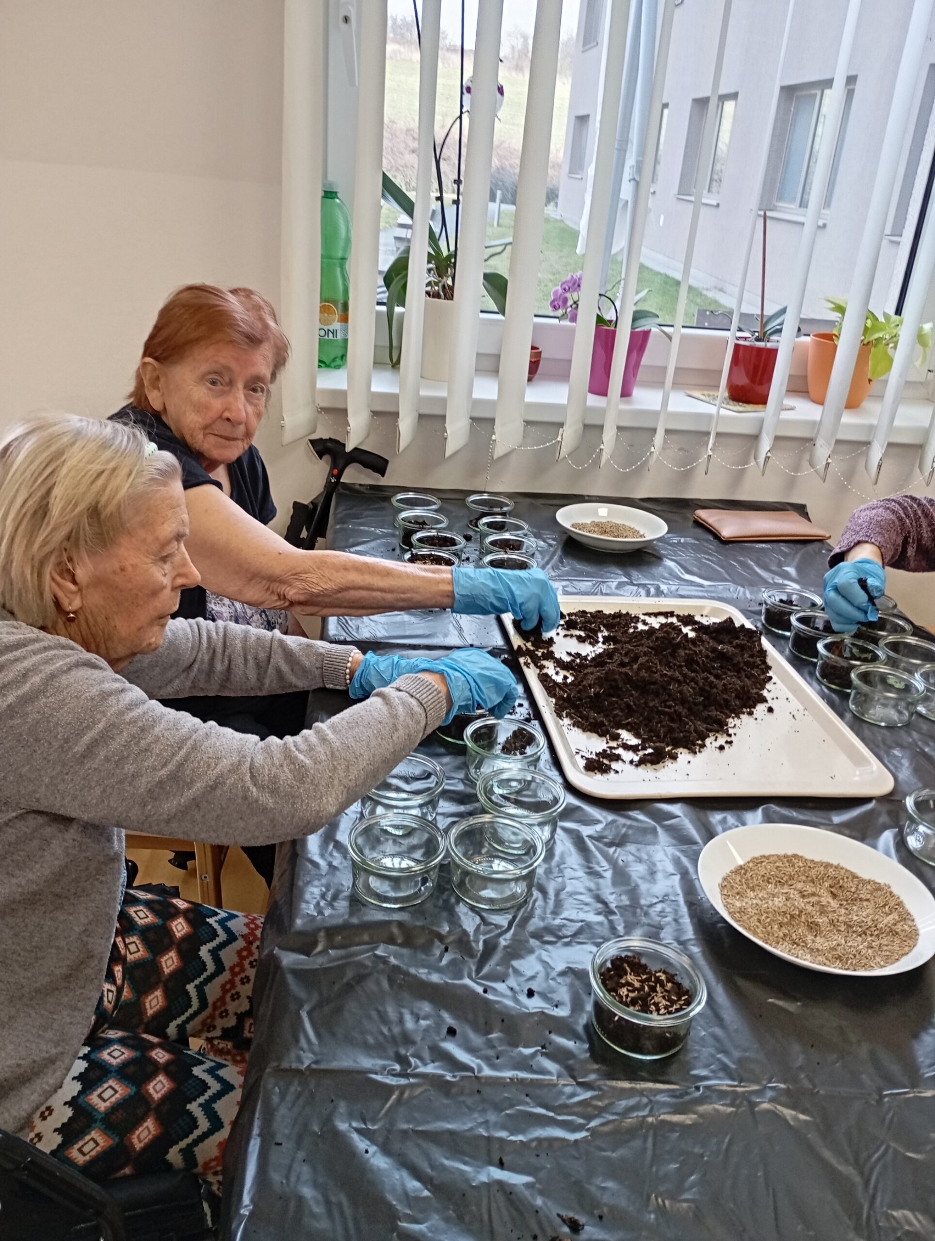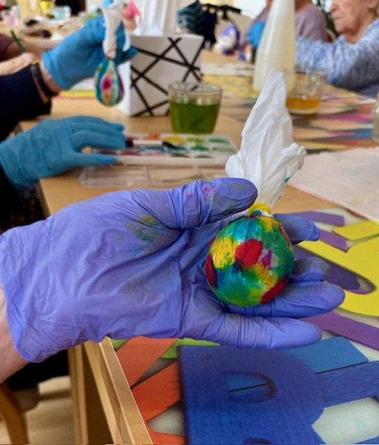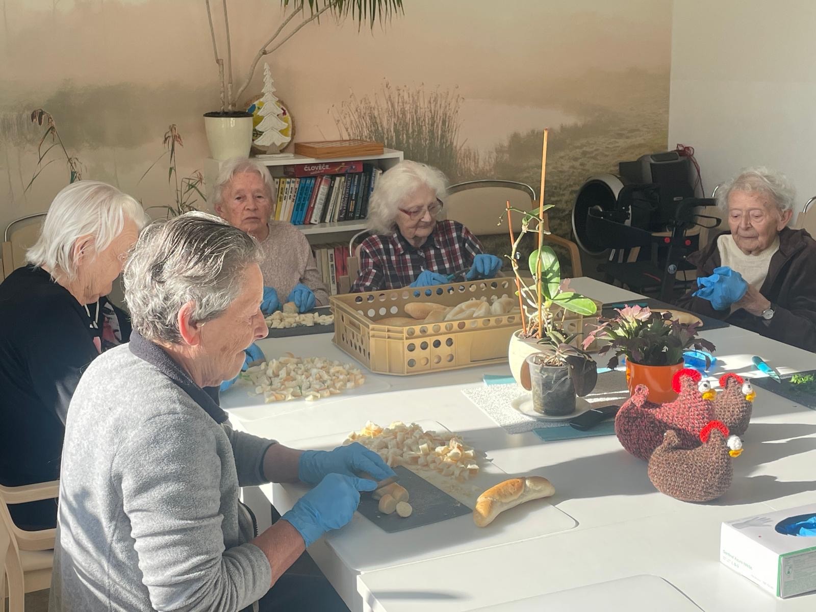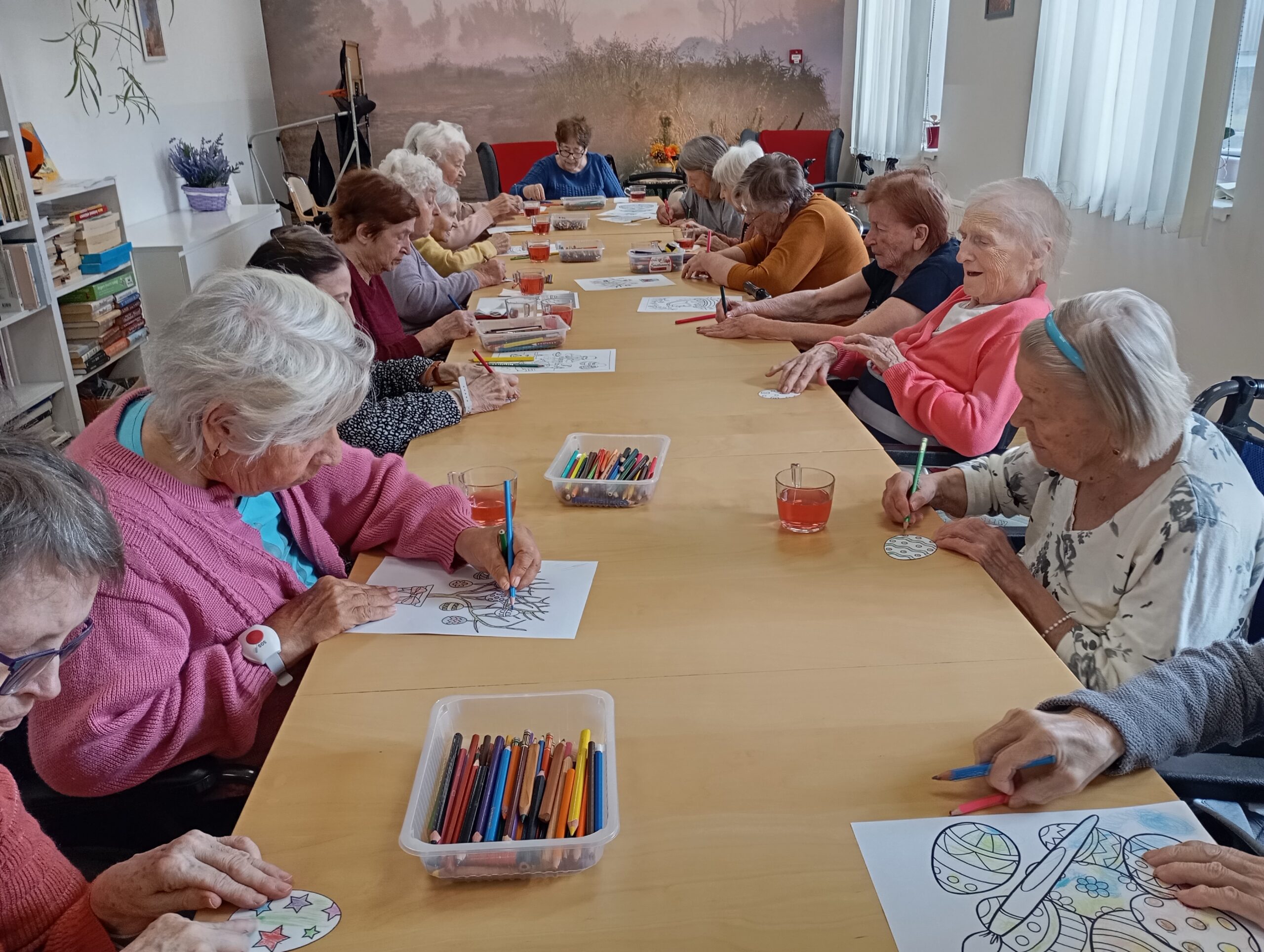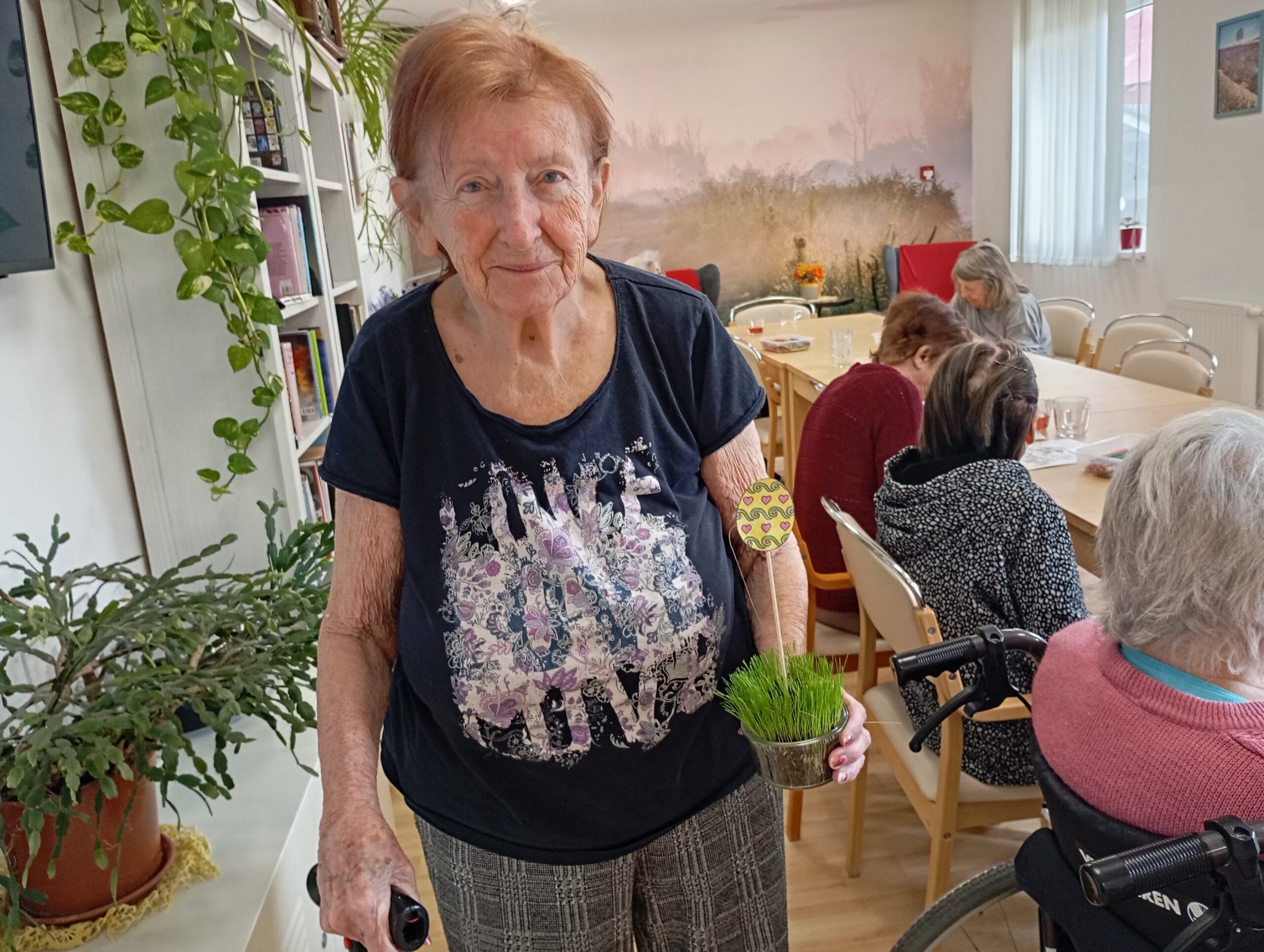 V letošním roce naše klientky přípravu na svátky velikonoční opravdu nepodcenily. Aktivit na toto téma si užily v hojné míře. Začínalo to sázením osení do kelímků. Do nich si vyráběly ozdobná barevná zapichovátka ve tvaru vajíček. Jimi si vyzdobily své pokoje.
