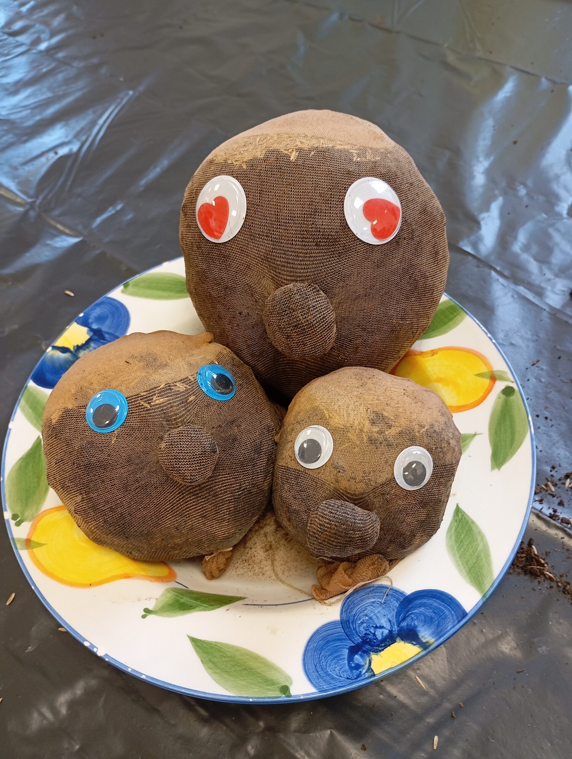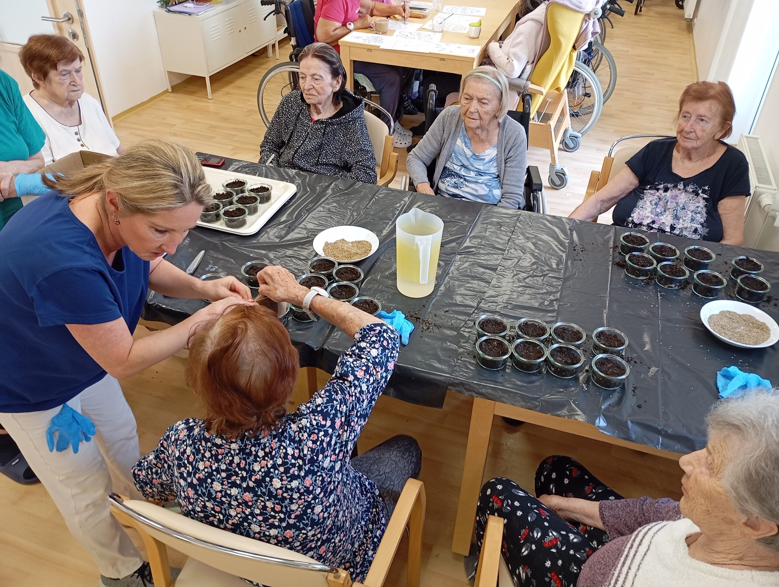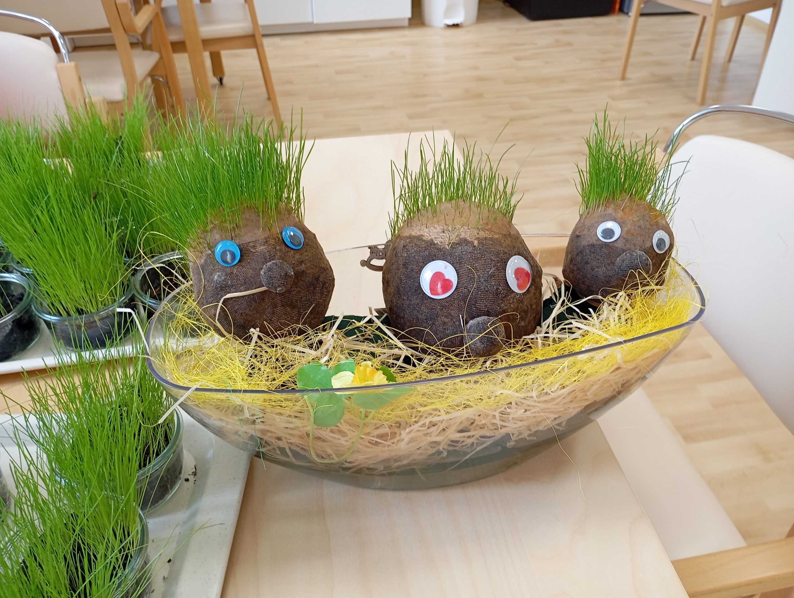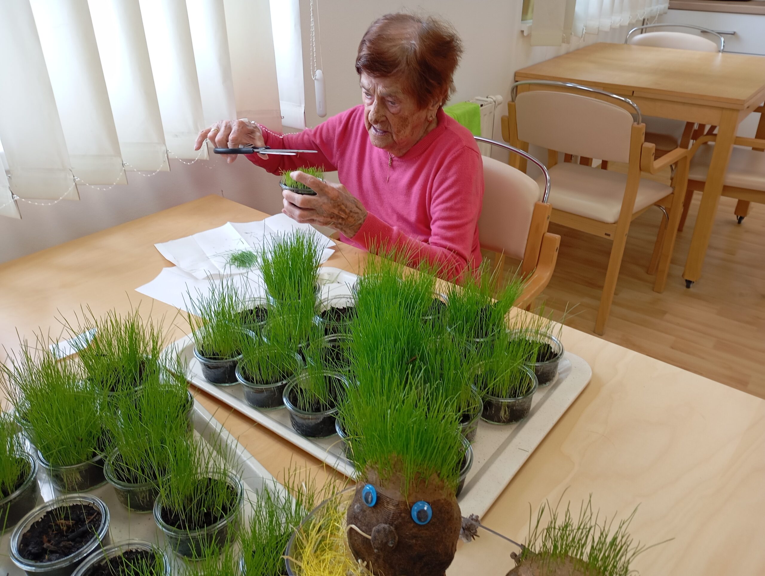 Práce se zeminou klientkám vyhovuje, a proto vyrobily veselé a vtipné obličeje s vlásky z osení, které v průběhu čekání na Velikonoce postupně rostou a rostou.