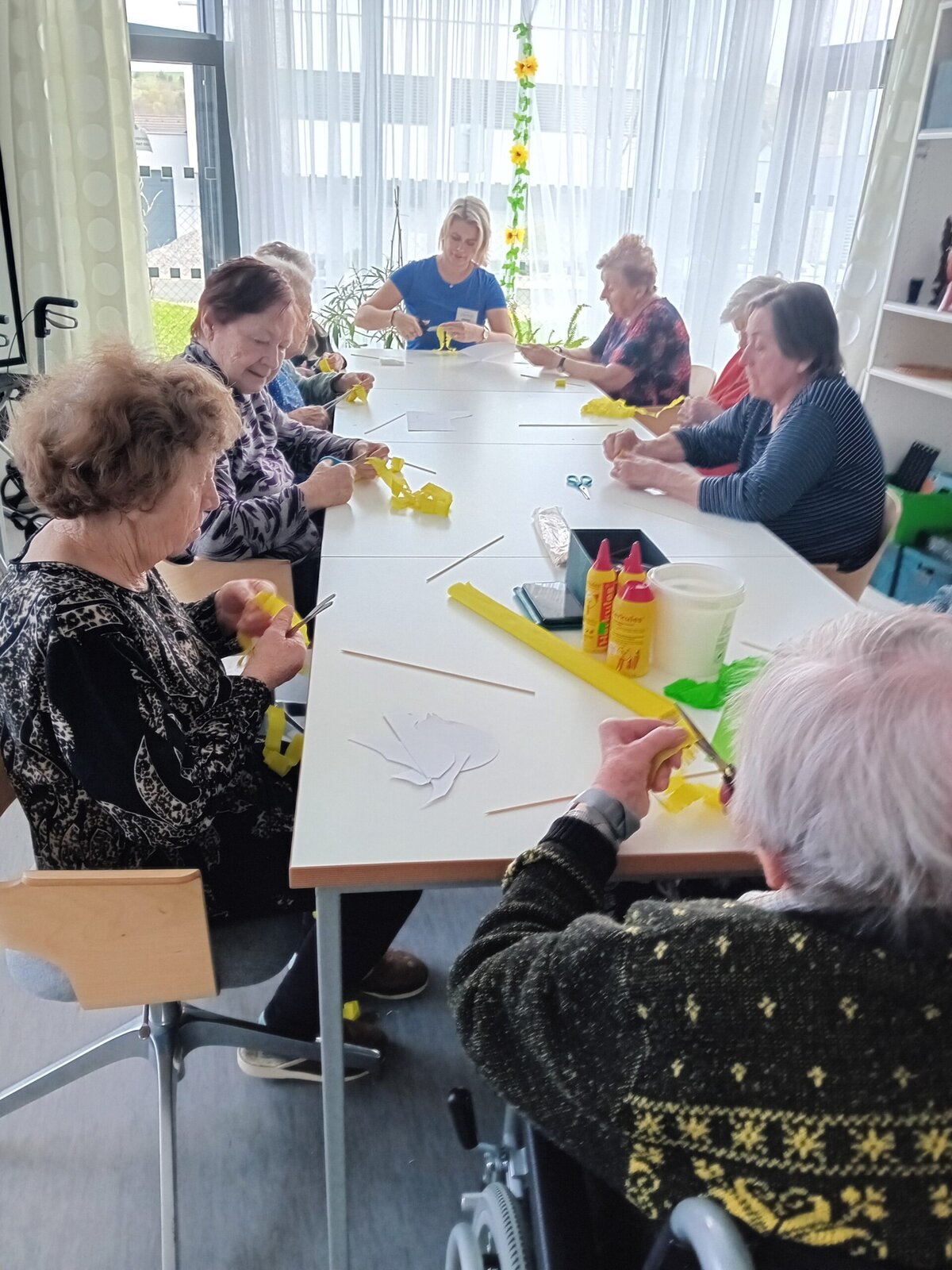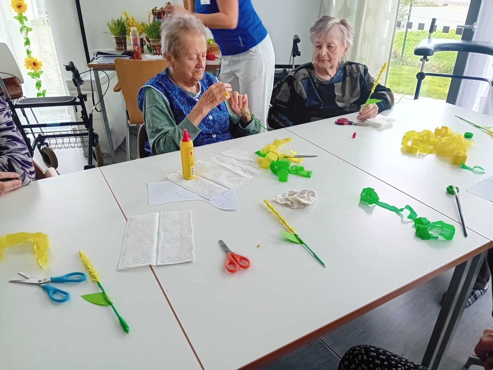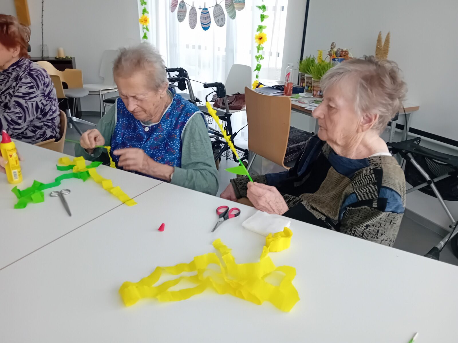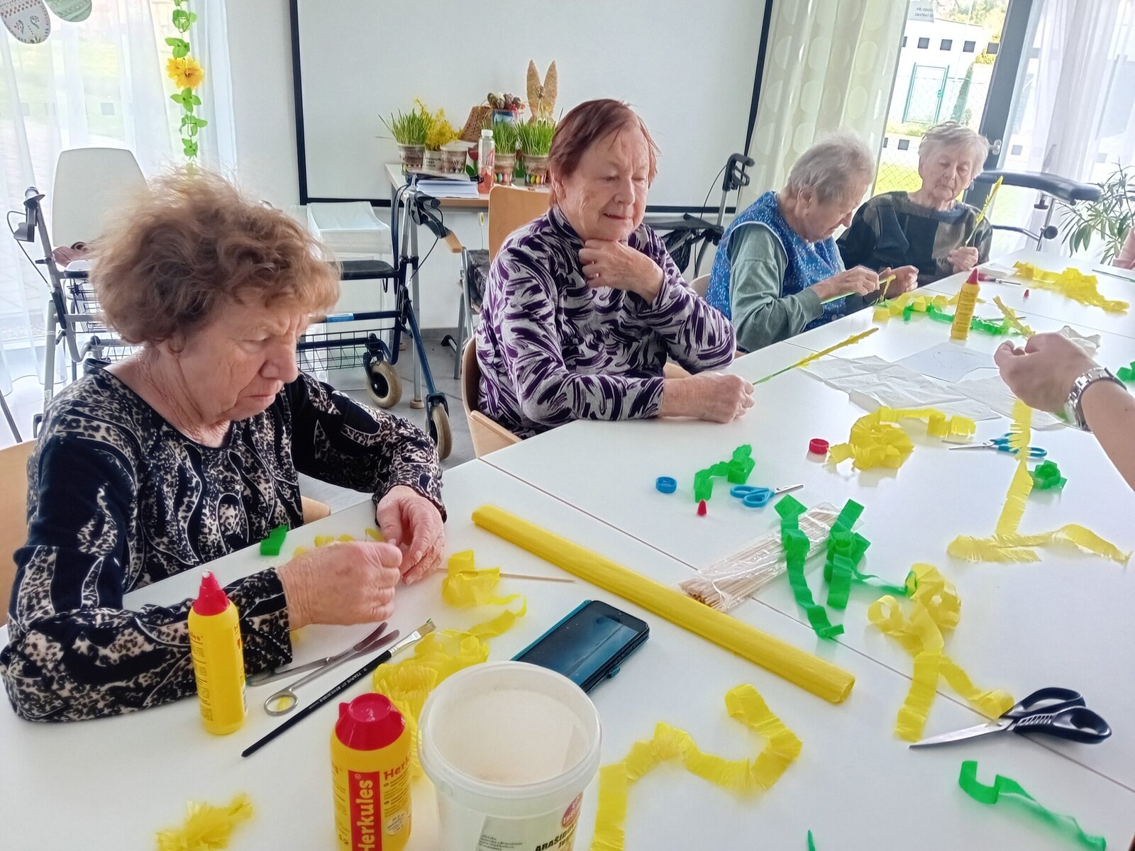 Je po Velikonocích, tak jsme v ALZHEIMERHOME SLAVKOV vyráběli nové dekorace. Volba padla na zlatý déšť a pampelišky. U stříhání a lepení si klienti procvičili jemnou motoriku rukou. S výsledkem jsme spokojení. Už jsme s kytičkou vyzdobili jídelnu.