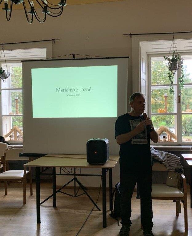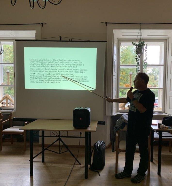 Ani tentokrát nezklamal a připravil si poutavé vyprávění s promítáním.📽️ Dnes prostřednictvím fotek, které pořizuje na svých cestách, nám přiblížil lázeňská města, a to hlavně Mariánské Lázně. 🏦🏩🏫 Jako bonus jsme se něco málo dozvěděli o městě Karlovy Vary, které v minulosti navštěvovaly i známé české osobnosti.