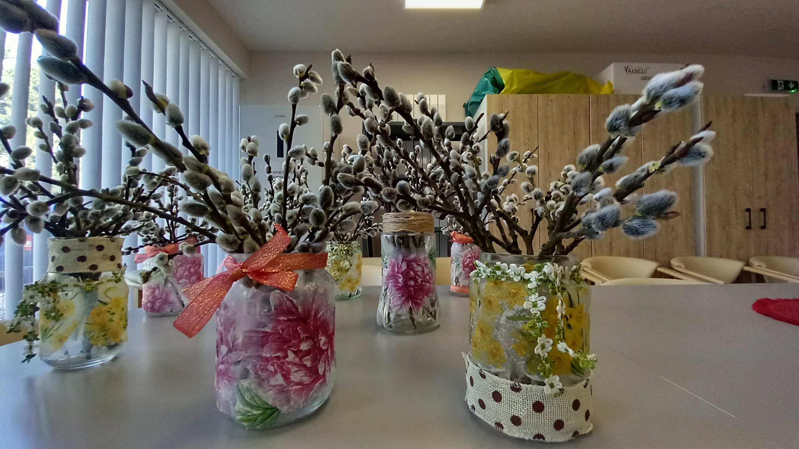 Ze zavařovacích sklenic jsme společně vyráběli jarní vázičky, které jsme zdobili ubrouskovou technikou a barevnými stužkami. Do hotových váziček jsme pak dali větvičky kočiček, které krásně navodili přicházející jarní atmosféru. 🌞 🙂
