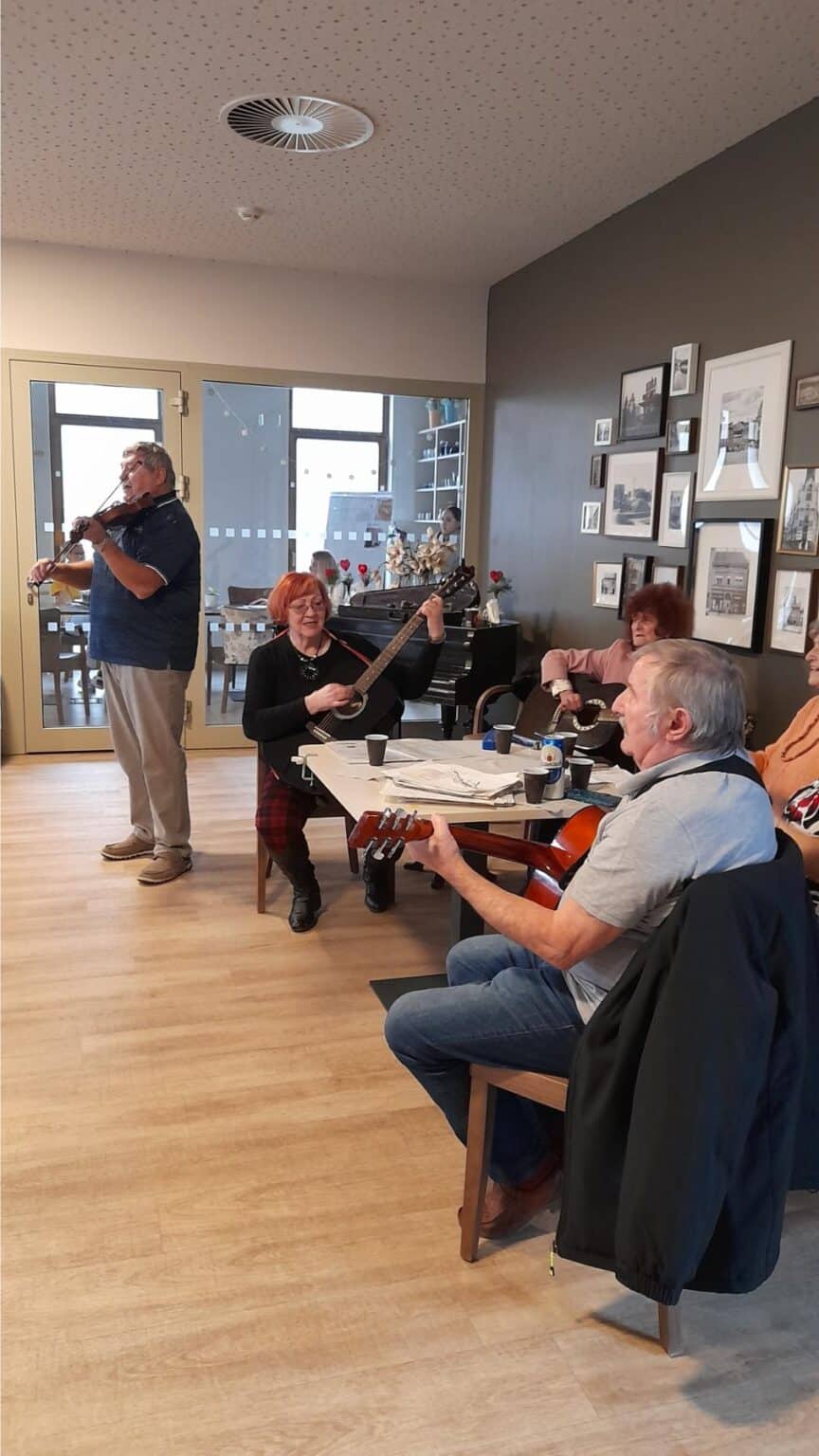 Do SeniorCentra Kolín nám přišli zahrát a zazpívat hudebníci z kolínského uskupení Senior Band. S některými z nich zpíval a hrál dlouhá léta na bicí i náš klient, a tak to bylo moc milé a dojemné setkání.