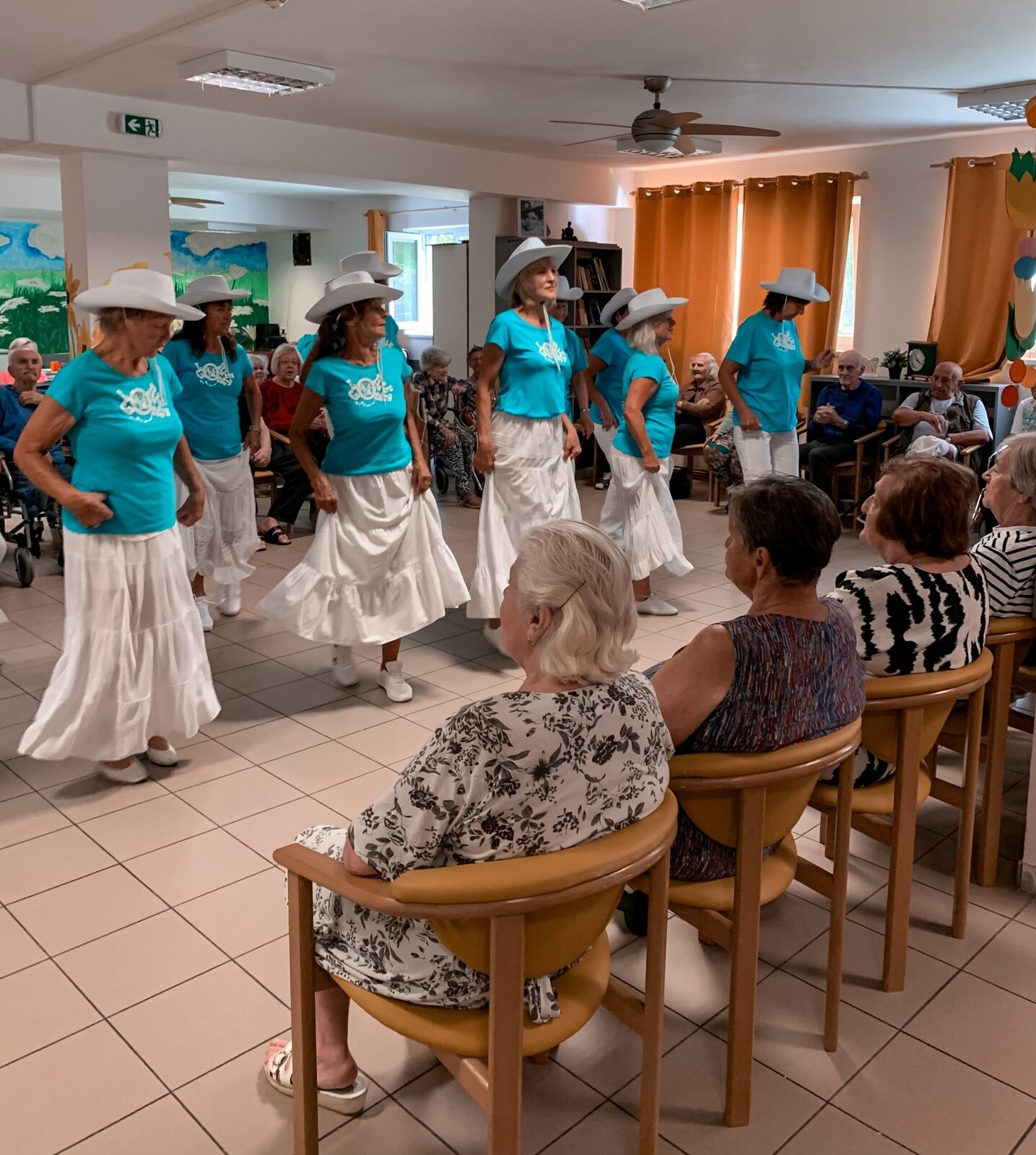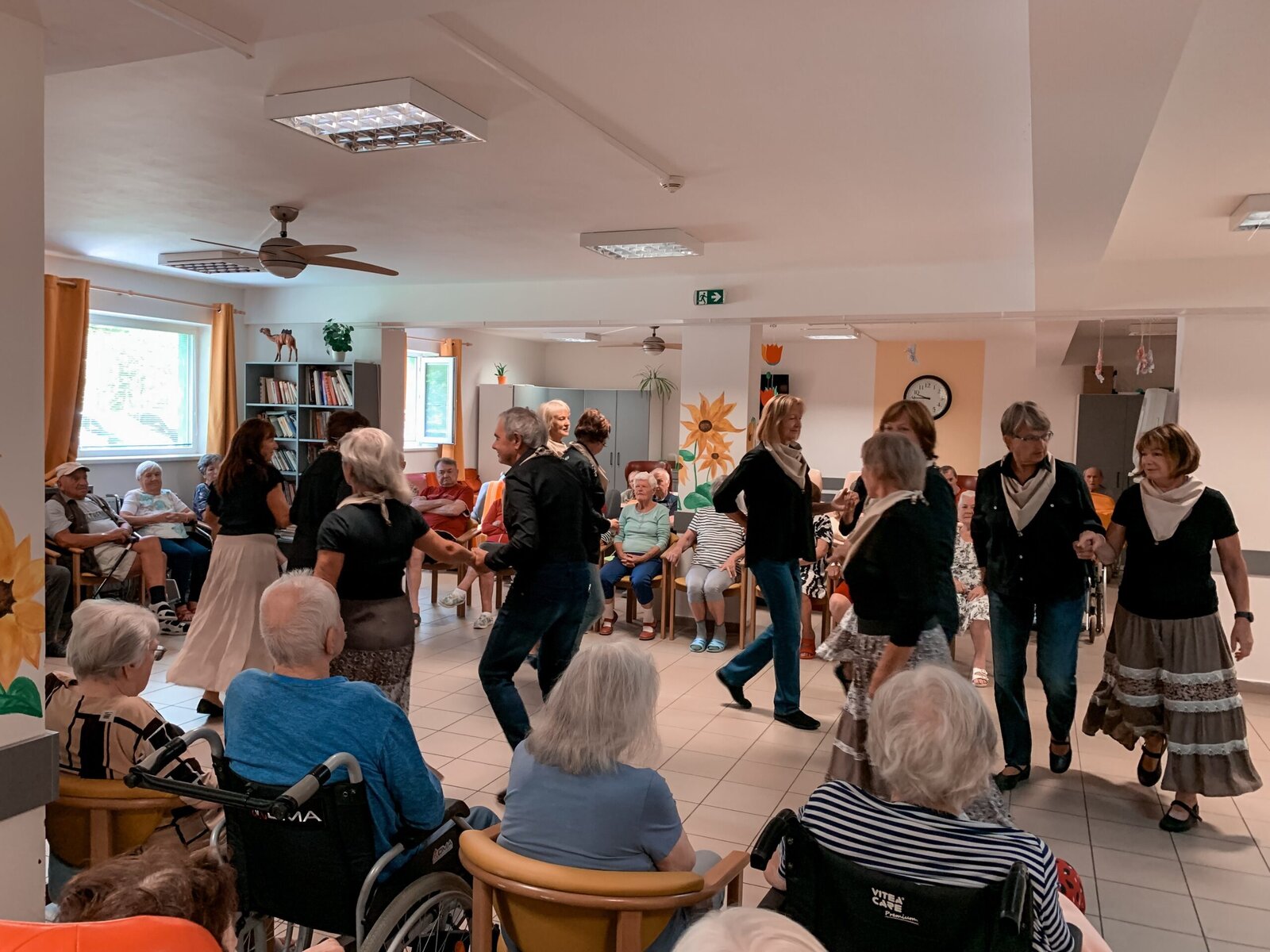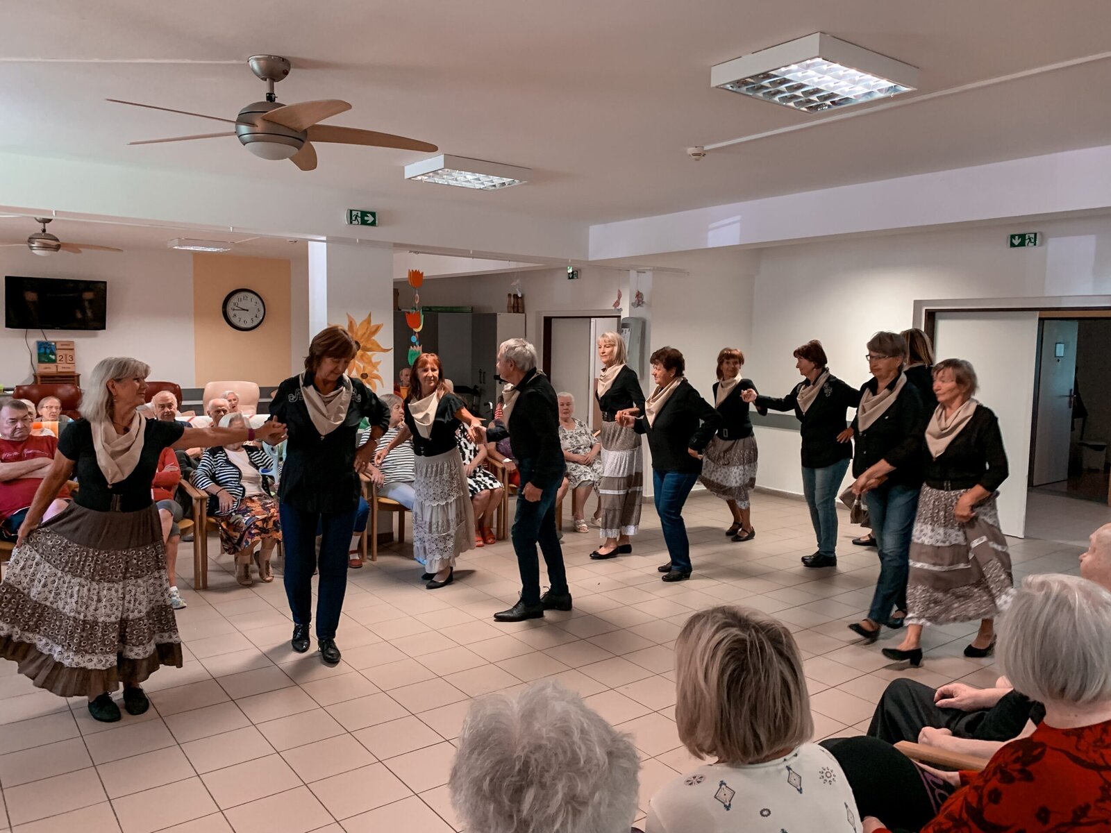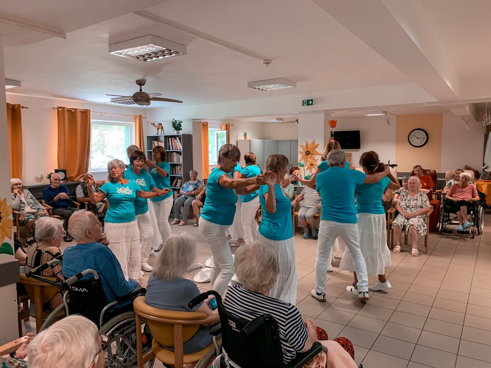Včera jsme si zatančili v rytmu dechovky, dnes tu máme pro změnu country. A rovnou nám přišli zatančit zkušení senioři z klubu Aktiv, kteří u nás nejsou žádnými nováčky. Do našeho Domova již zavítali několikrát a my je vždy rádi vidíme. O to víc, že se nemusíme jen kochat, ale můžeme se k nim přidat v rámci taneční lekce na konci vystoupení.