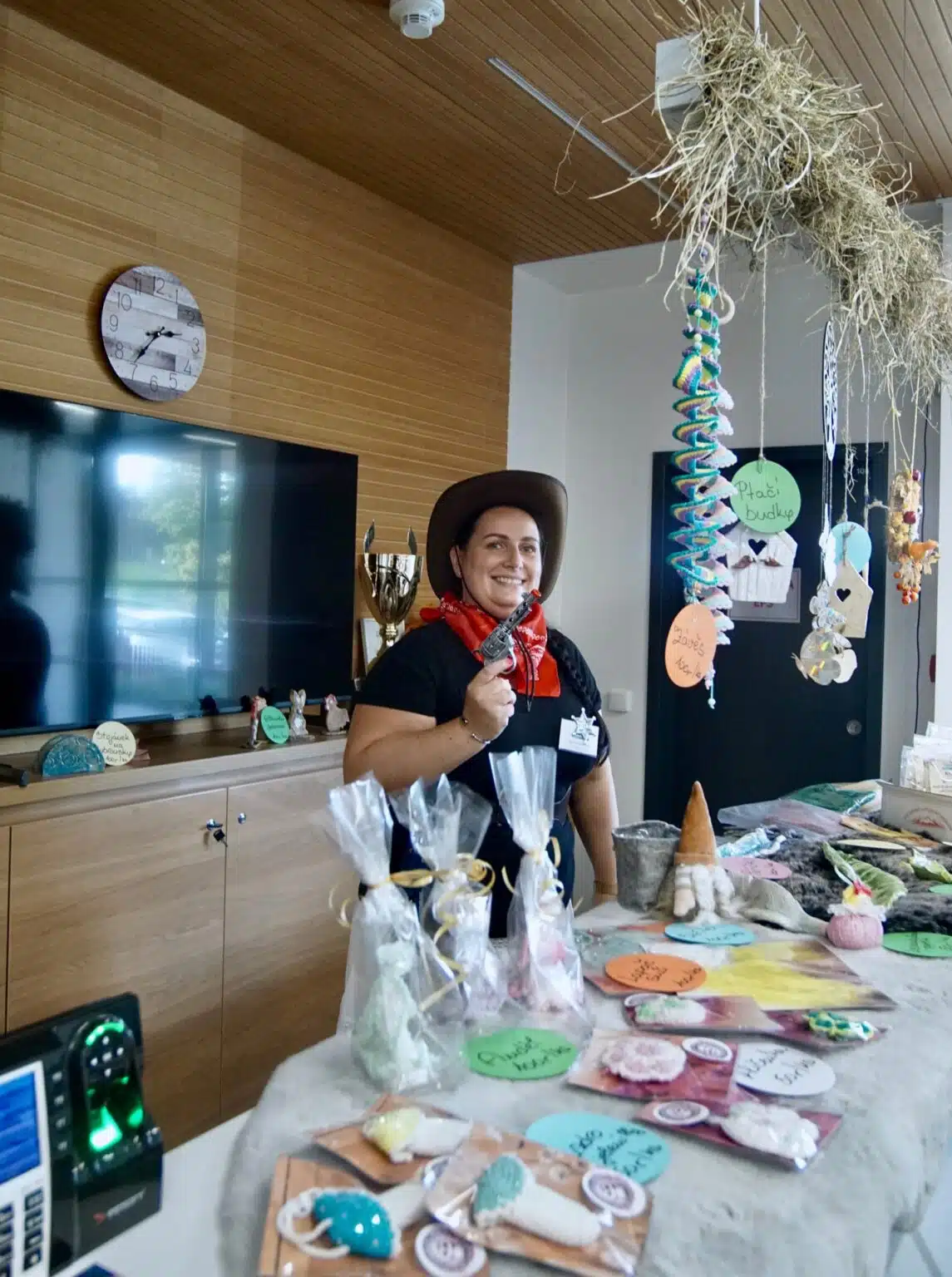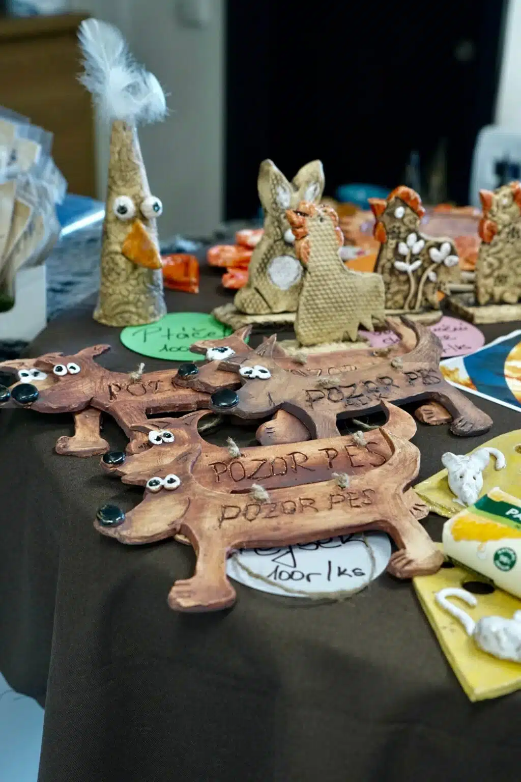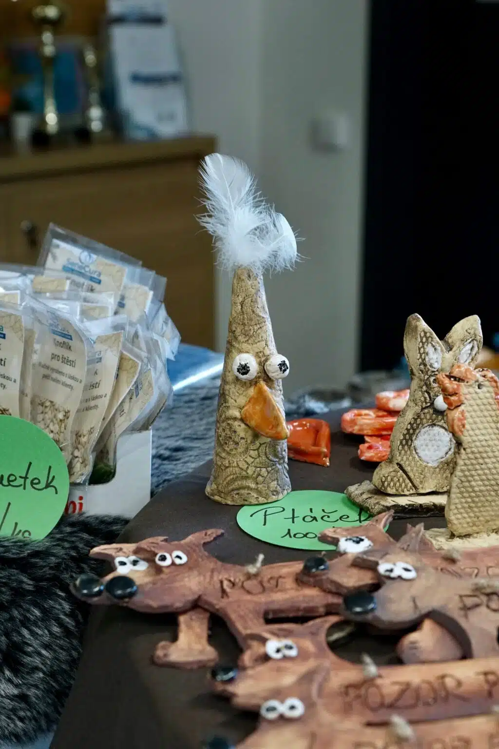 Prodejní stánek na recepci nabízel pestrý výběr rukodělných výrobků, v nichž se odrážela poctivá práce, trpělivost i tvořivost našich klientů. Návštěvníci si mohli odnést například dřevěné domečky, keramické misky na vonné tyčinky, originální zápichy do květináčů, háčkované výrobky nebo veselá keramická zvířátka – včetně oblíbených psů s nápisem „Pozor pes“. Každý kousek měl osobitý styl a zájem byl veliký.