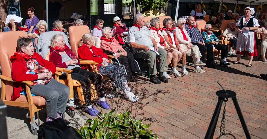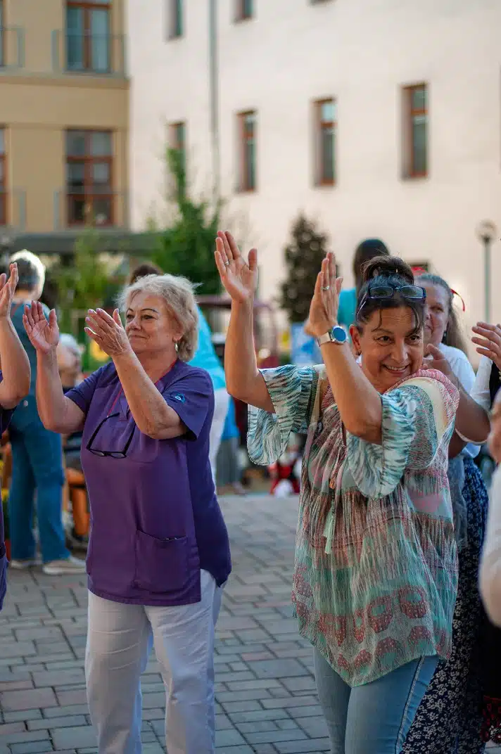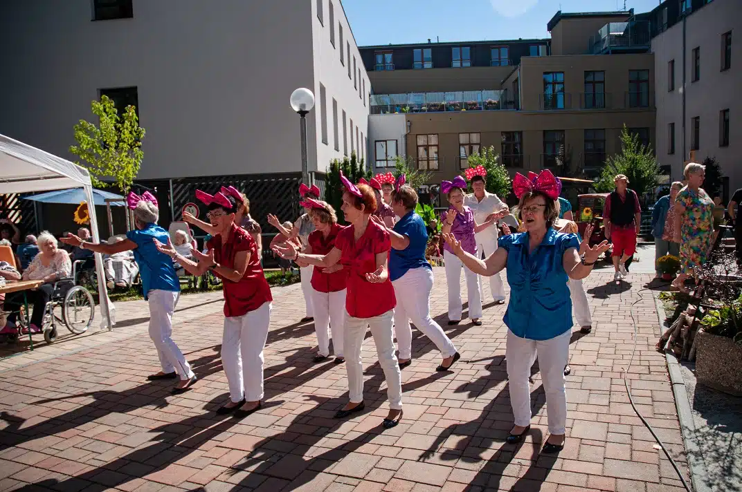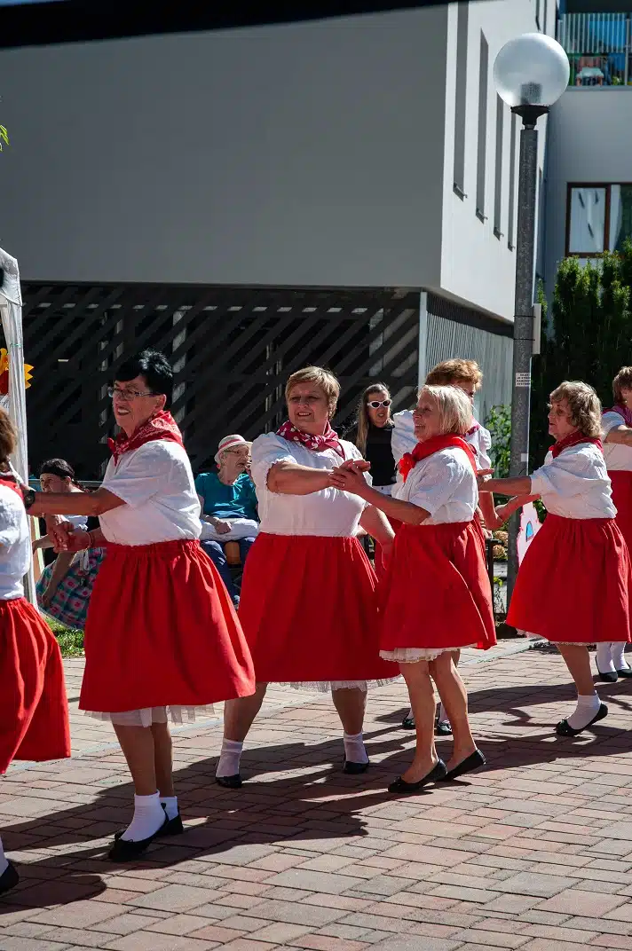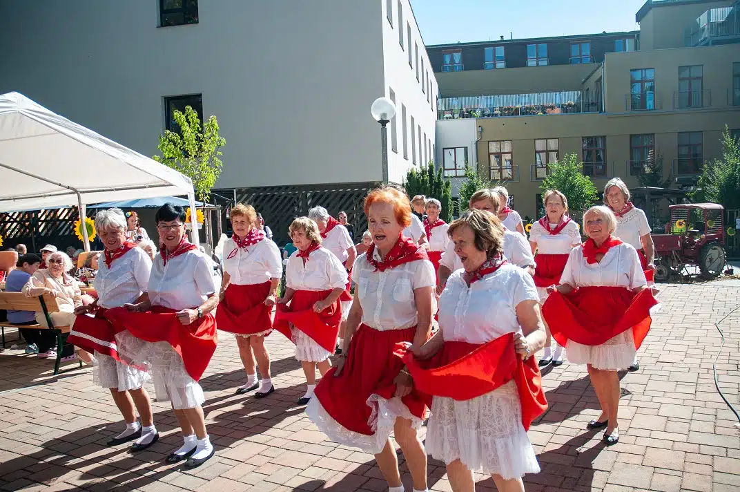 V další části našeho odpoledne nám zahrála na dudy paní Novotná, která se svým hudebním doprovodem obešla i klienty po domově, kteří se nemohli ze zdravotních důvodů dostat do centra dění. Krásným pěveckým a tanečním vystoupením nám všem udělali radost děti z místního souboru Písečánek. Celé odpoledne nám nejen ozvučil, ale na závěr i zahrál a zazpíval pan Petr Vonášek. Roztančil nejen naše klienty a hosty, ale i pana ředitele.