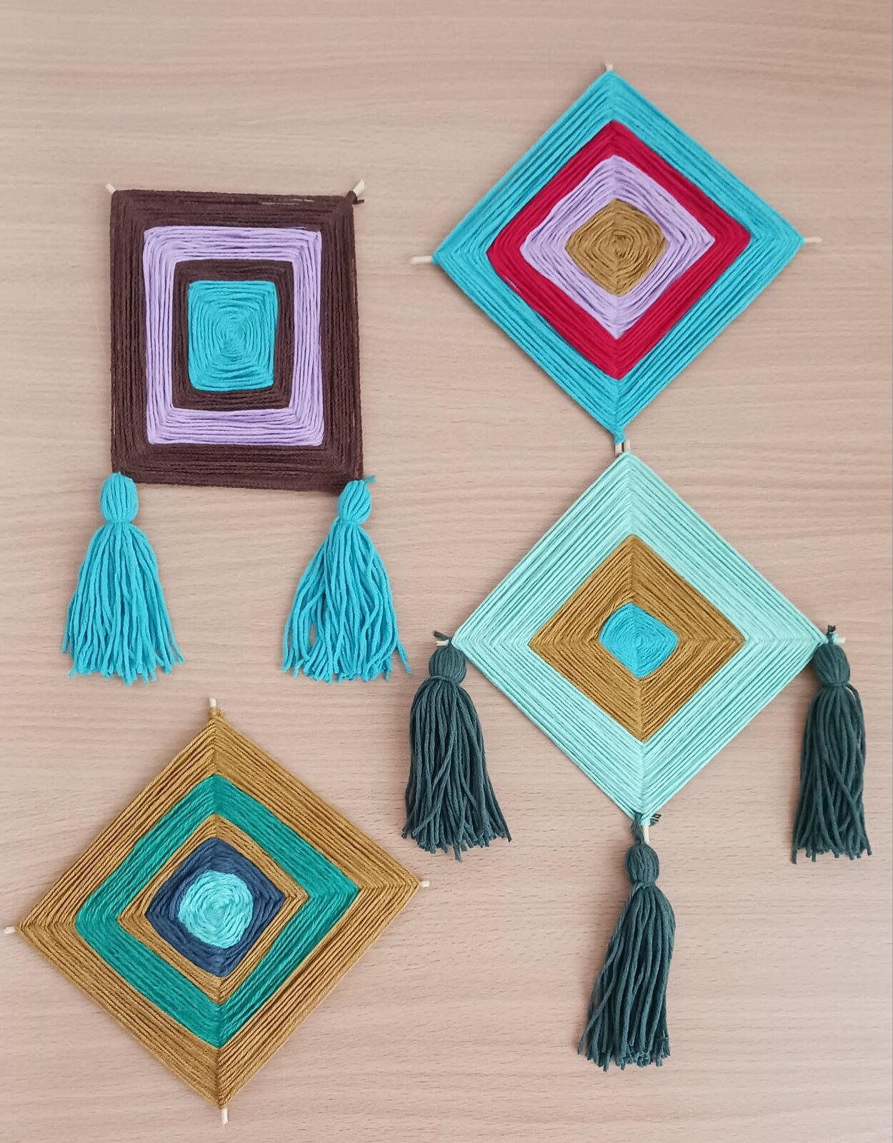 Hotové dekorace ozdobily ještě střapci, a tak vznikla originální díla, která mohou rozveselit interiér a přinést do něj kousek radosti i kreativity. 🌸🧶