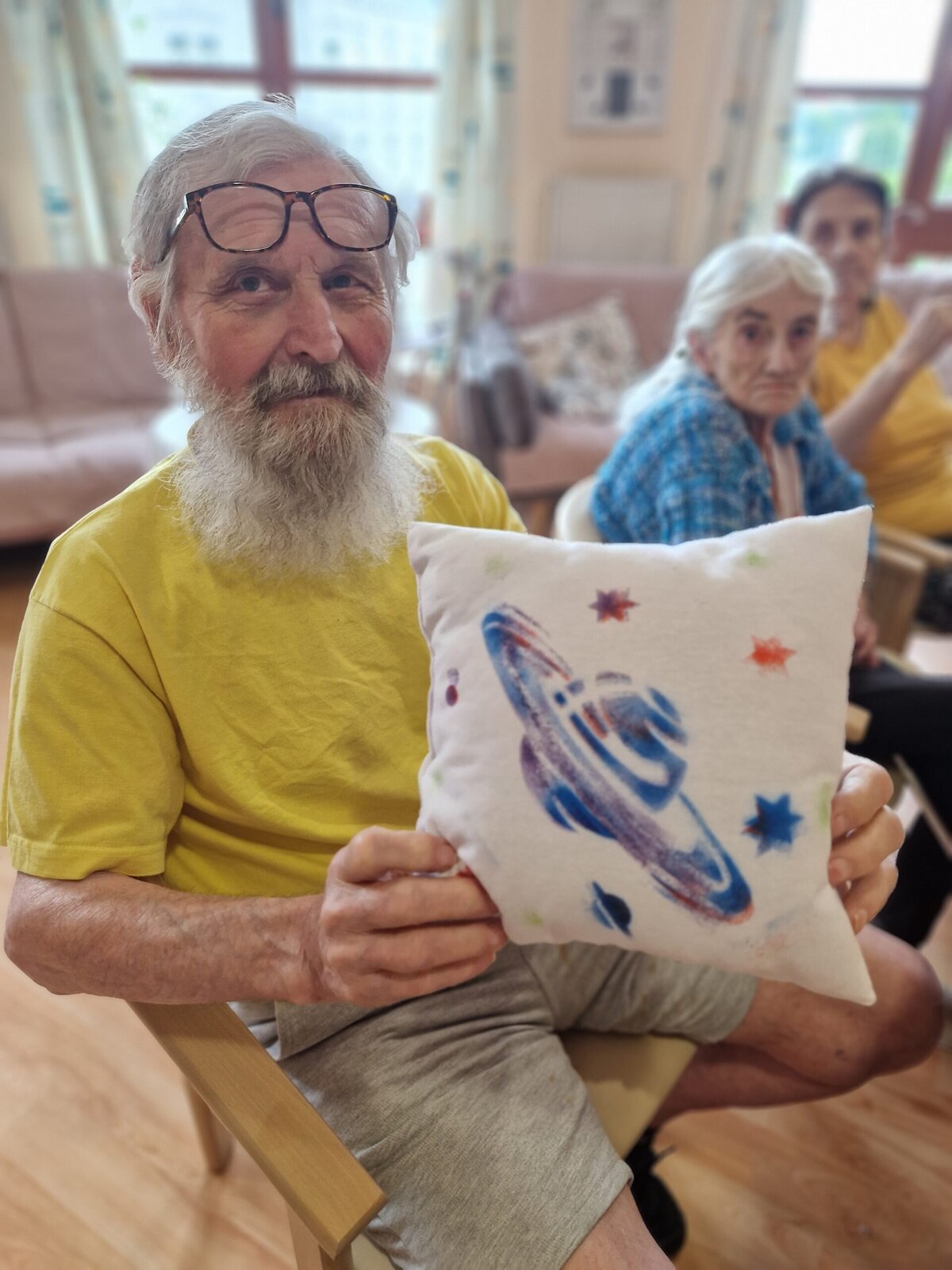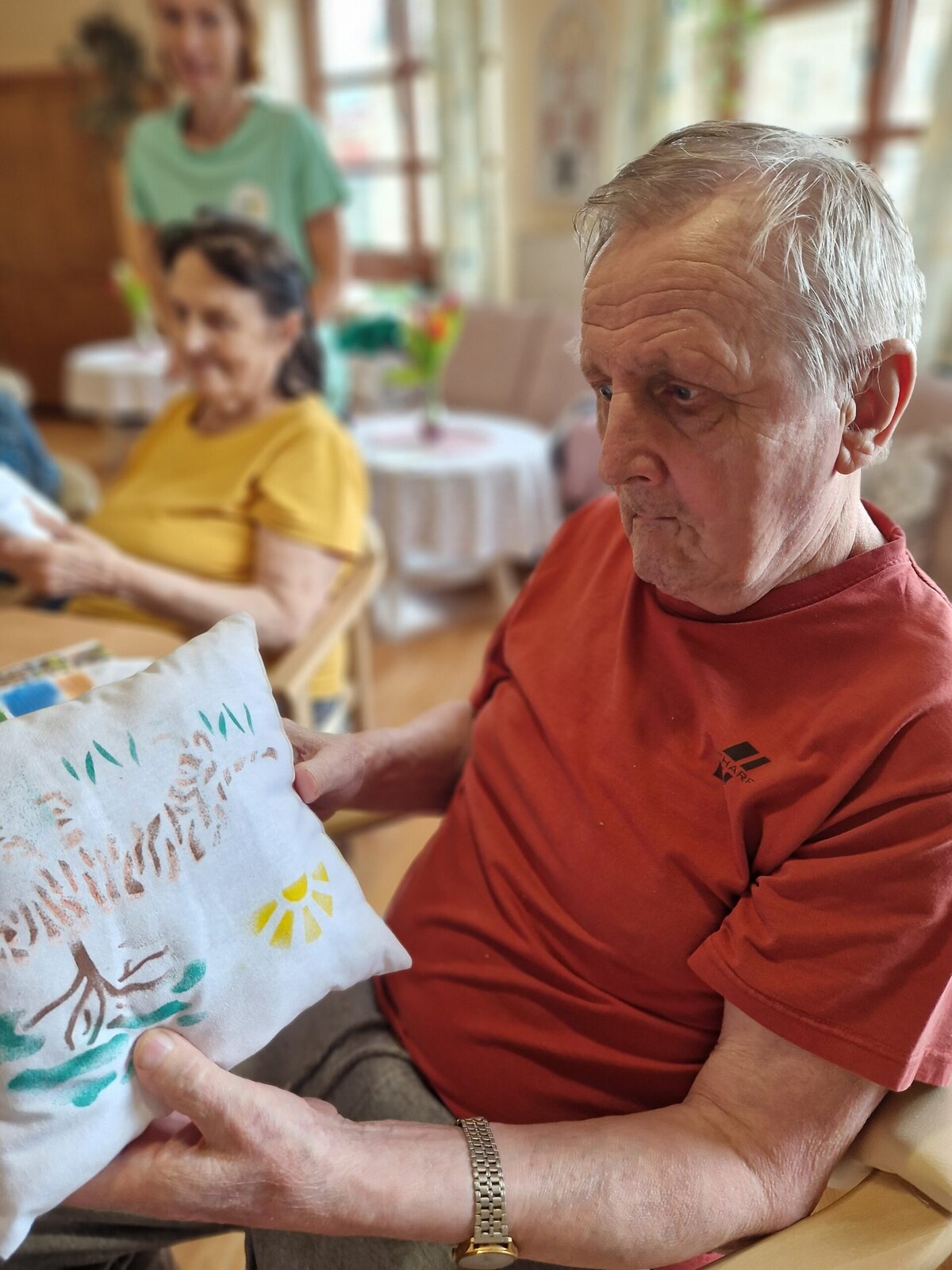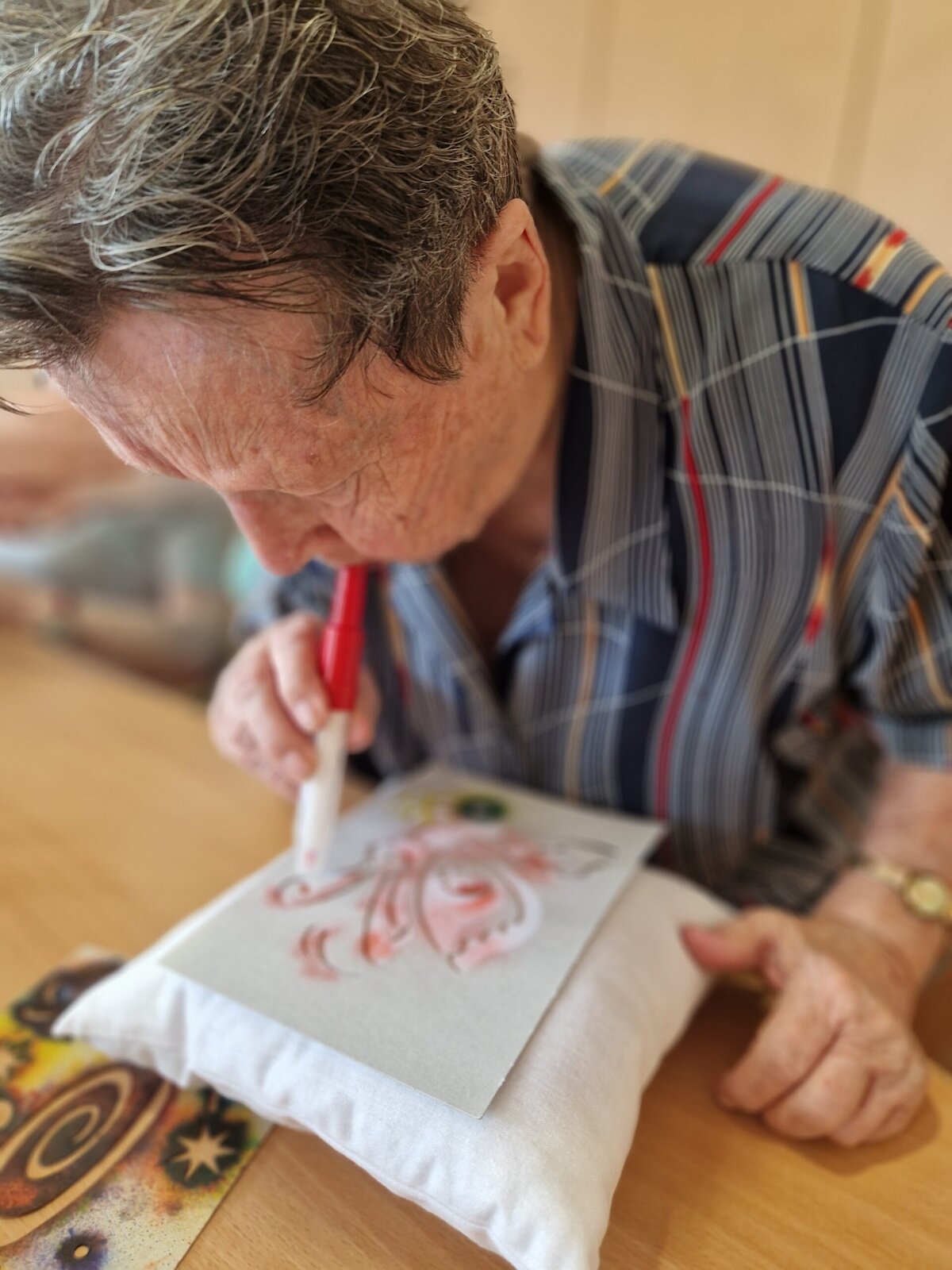 Dnes dopoledne se klienti Senevida Frýdek-Místek pustili s Odpaďáčkem do netradičního tvoření – a výsledek stál za to! 😊 S pomocí šablon a barevných foukacích fixek si originálně ozdobili své polštářky.