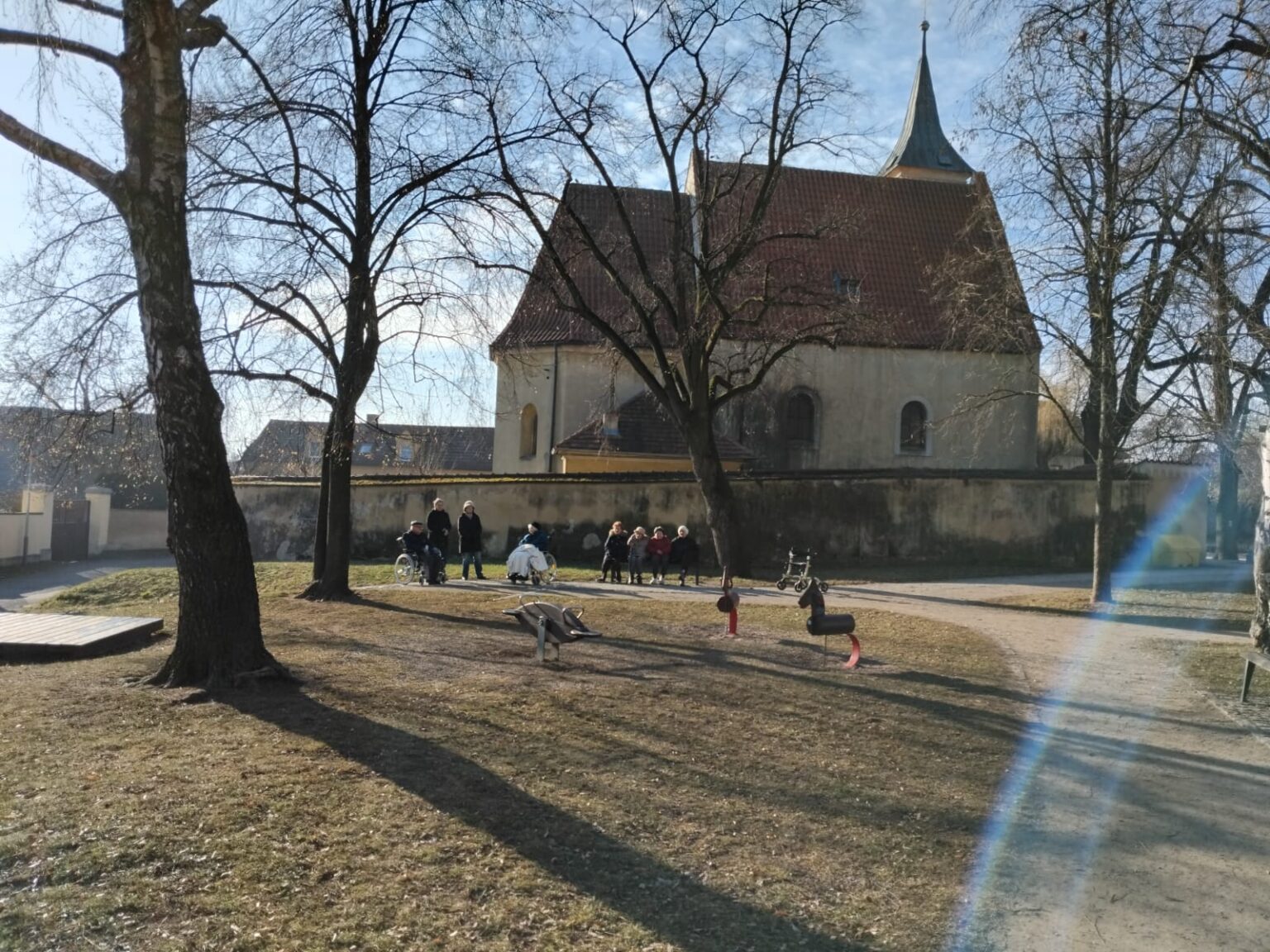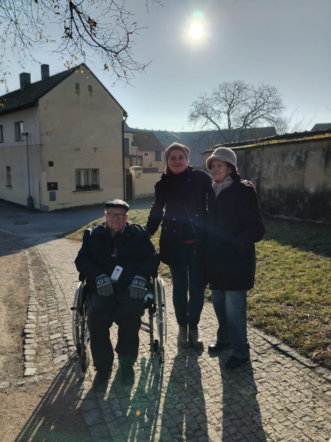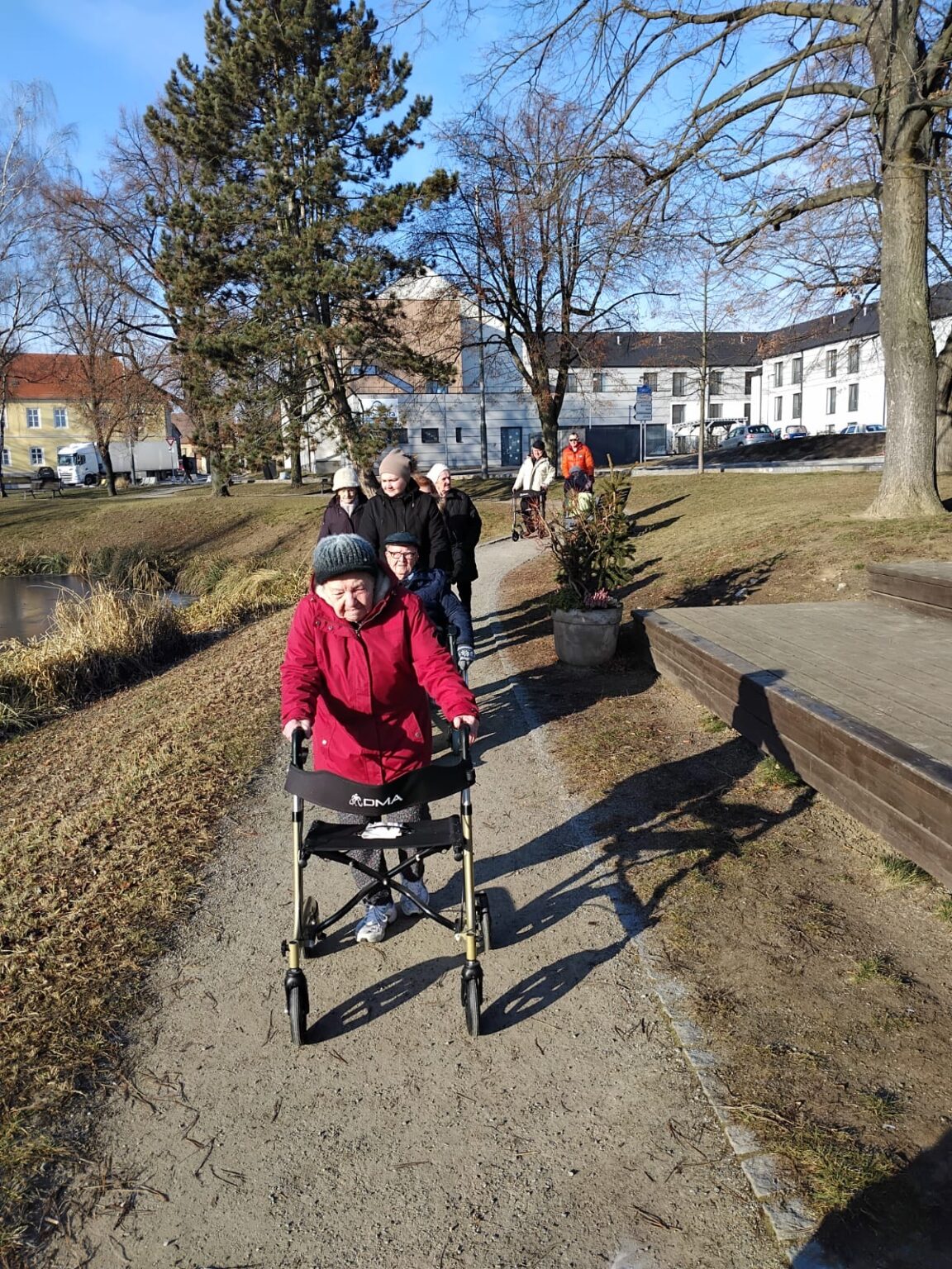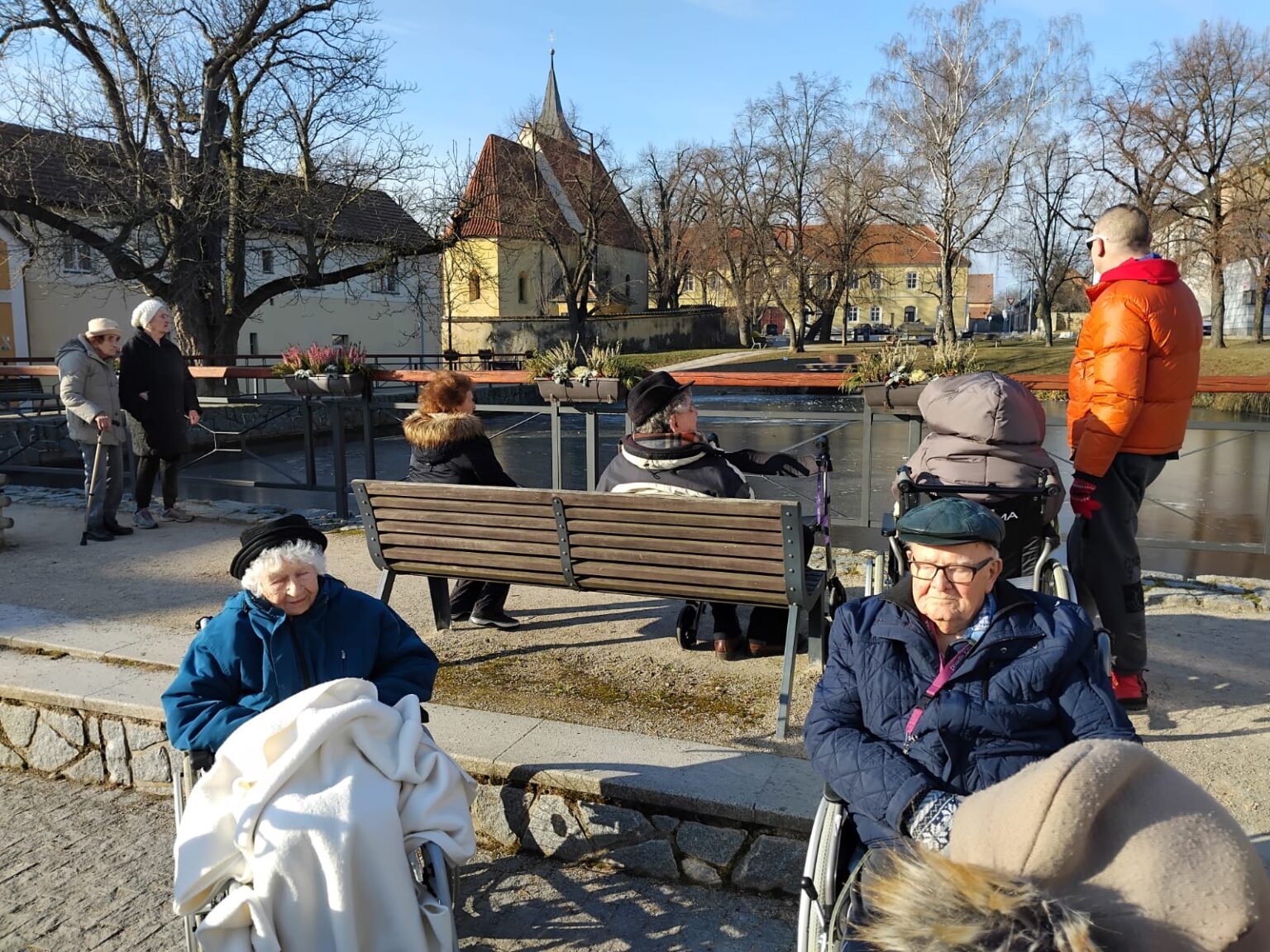 I přes mrazivé počasí nás lákaly jasné sluneční paprsky, a tak jsme se rozhodli vydat do okolí našeho domova. Společně jsme se prošli po návsi Slivence, kde nás okouzlil pohled na zamrzlý rybníček, ve kterém se odrážely zlaté paprsky slunce. Procházka se setkala s velkým ohlasem a všichni klienti si ji velmi užili.