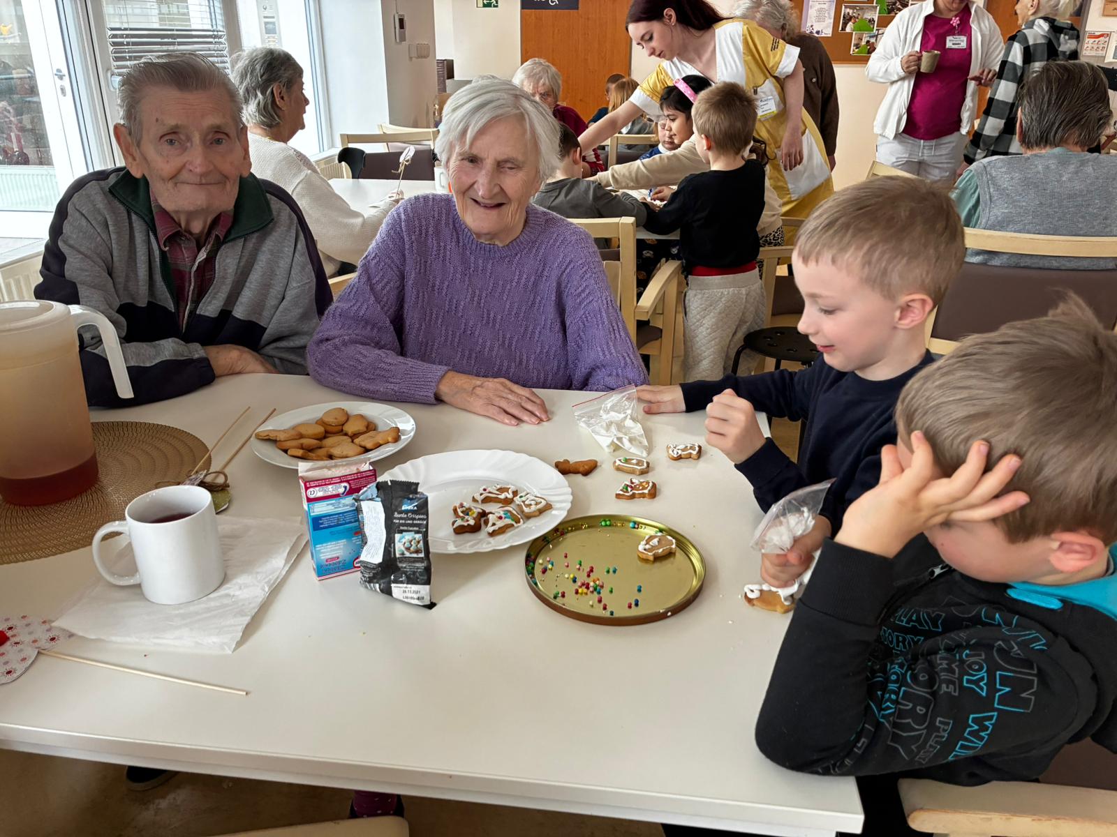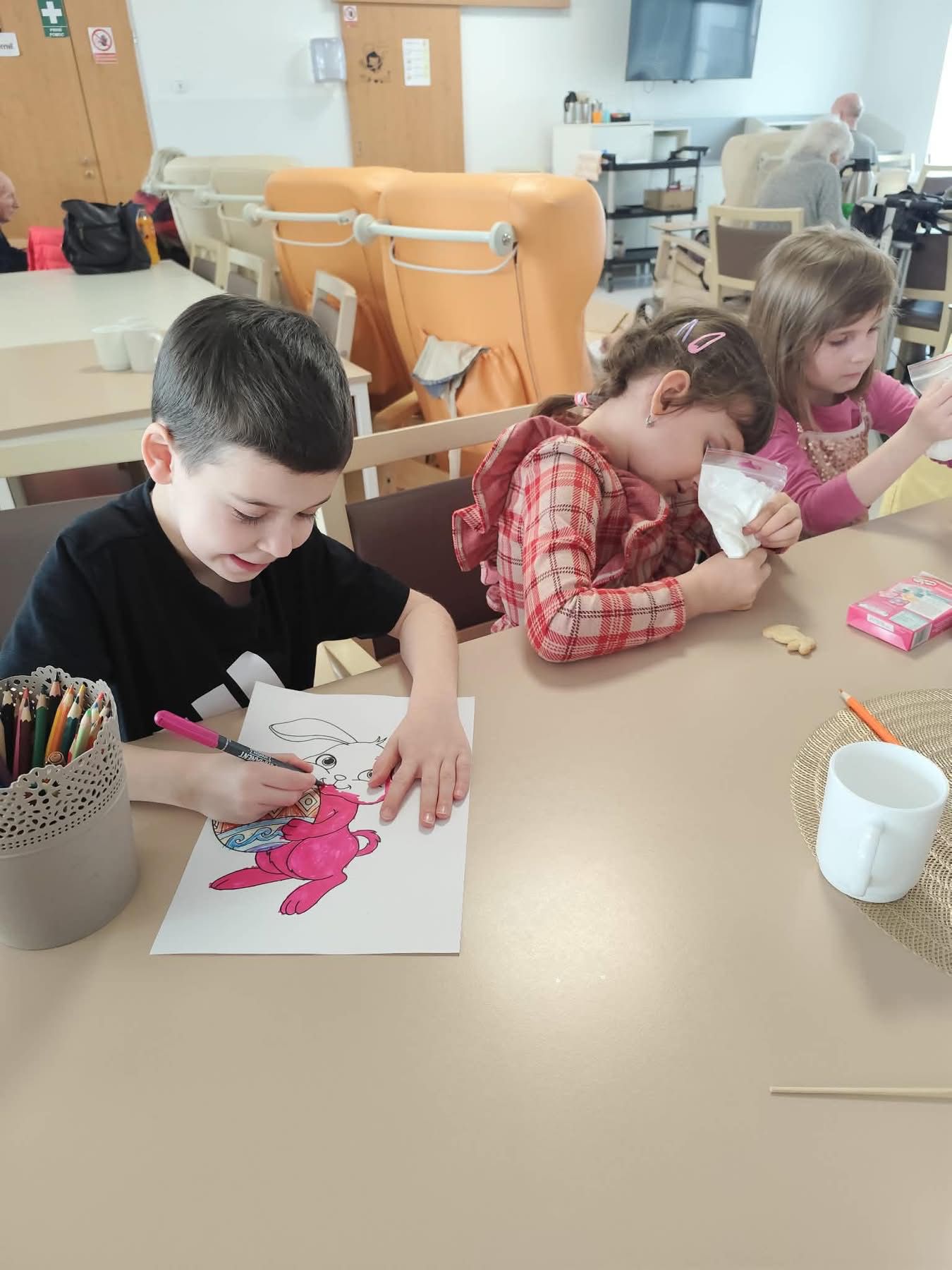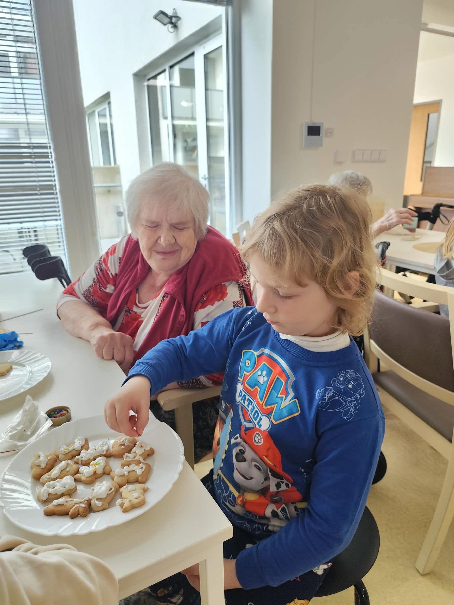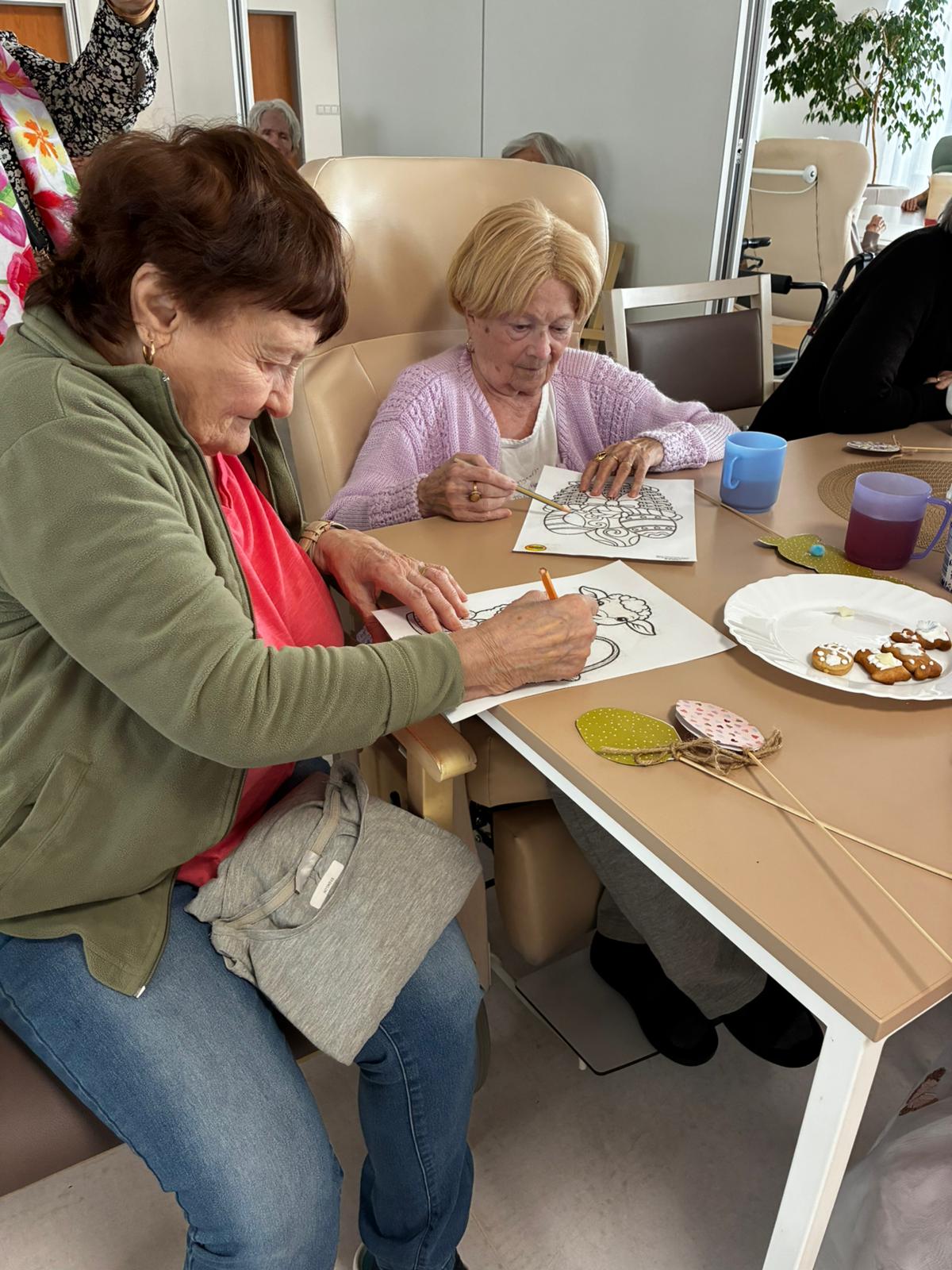 Nejdříve klientům zazpívaly, a pak společně zdobili velikonoční perníčky a malovali obrázky.